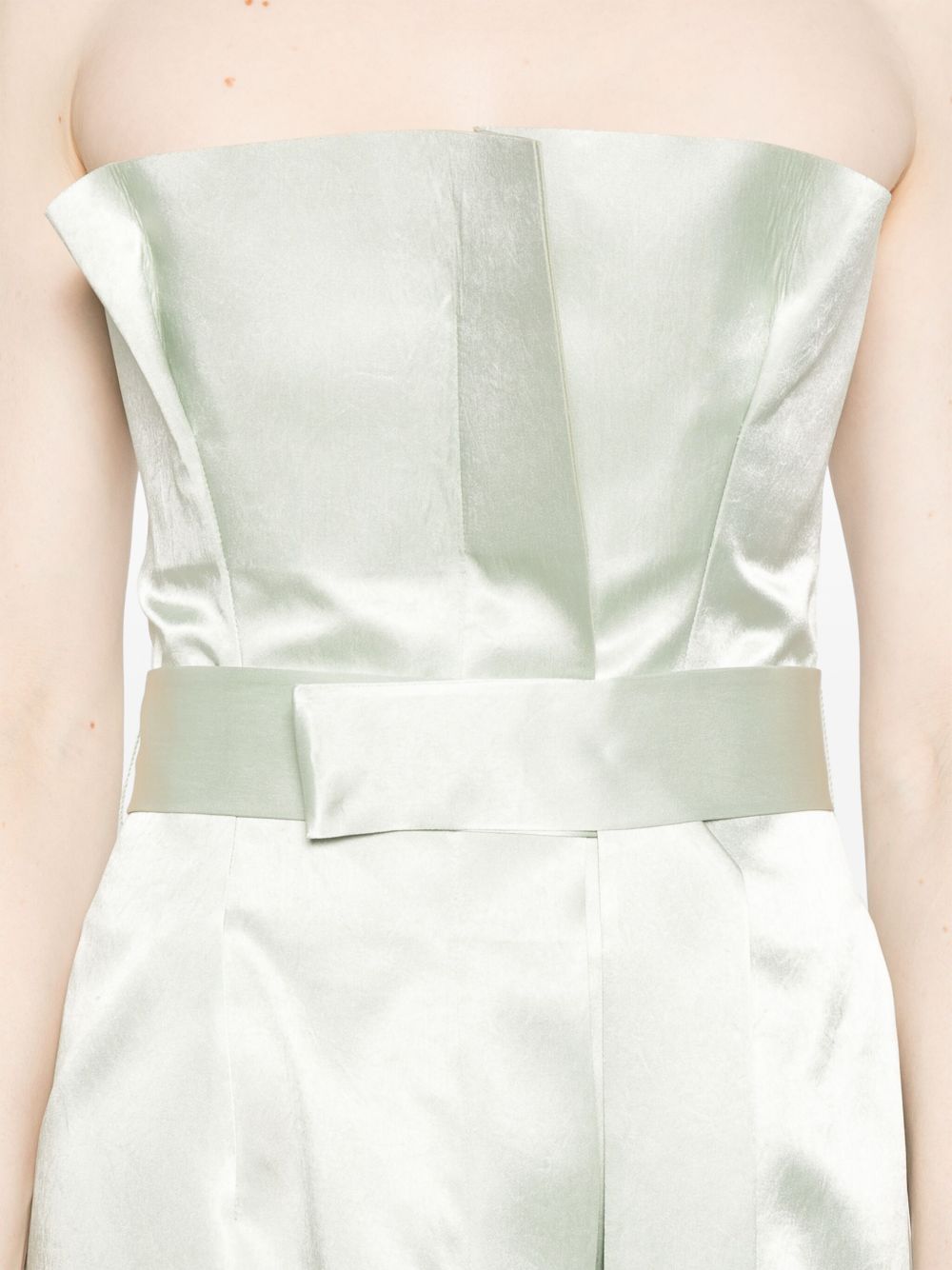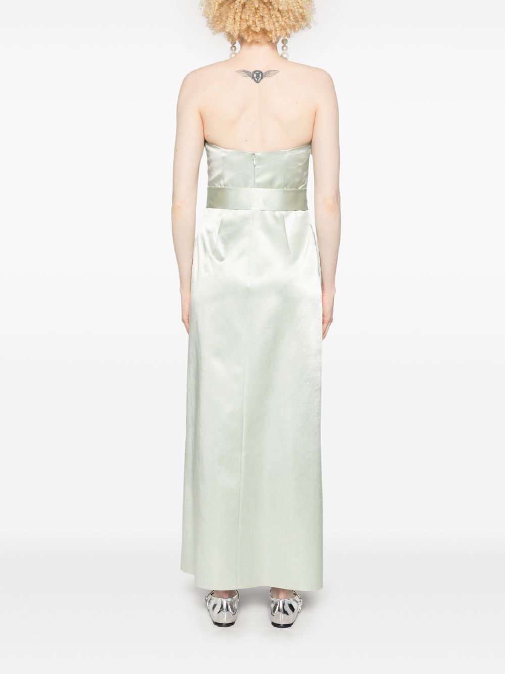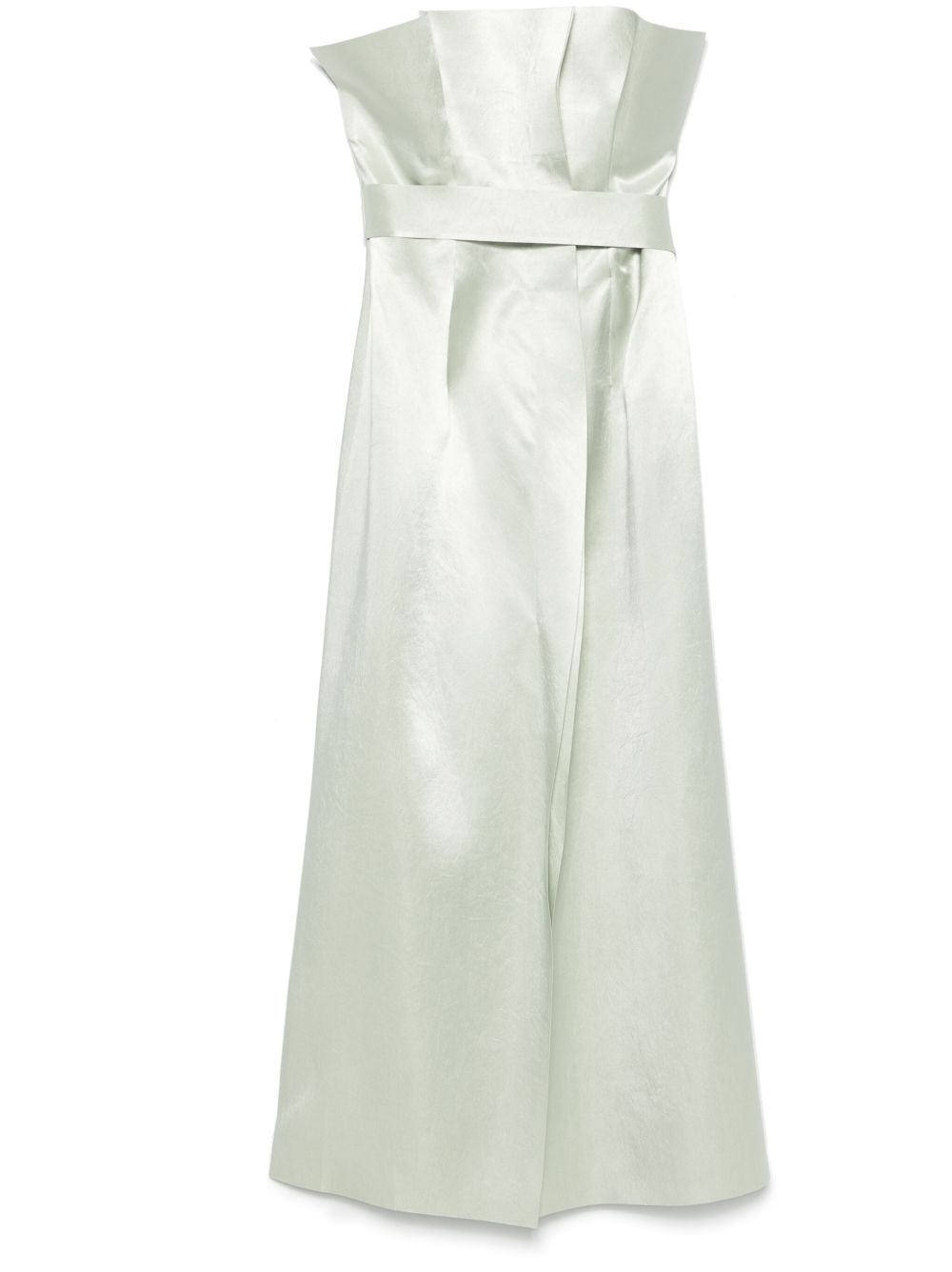 abito midi, bustino con drappeggio, spalle scoperte, cintura removibile con bottoni e con passanti, gonna con drappeggio e spacco centrale , chiusura con zip posteriore Composizione: 100% poliestere Istruzioni per il lavaggio: lavare a secco