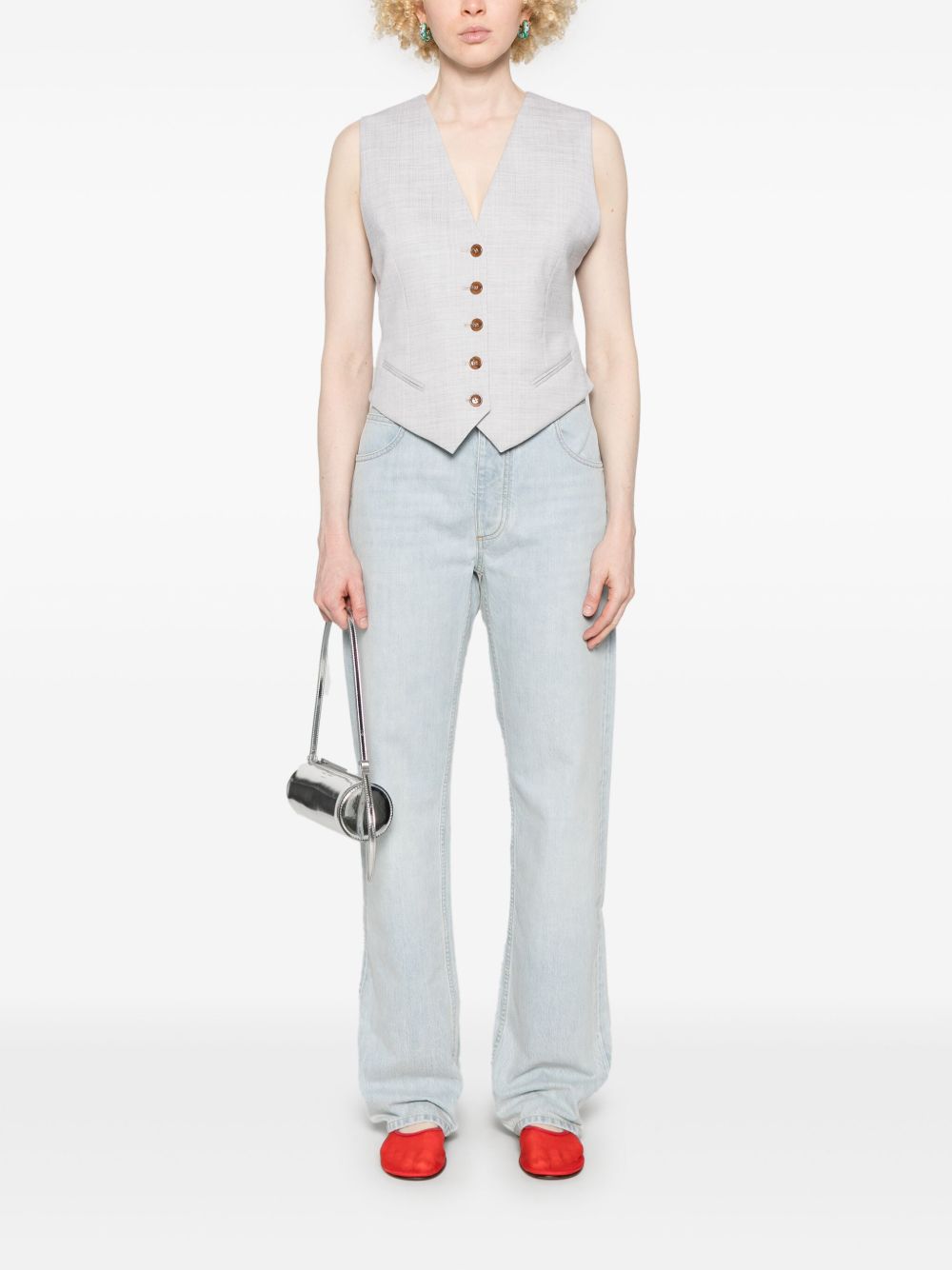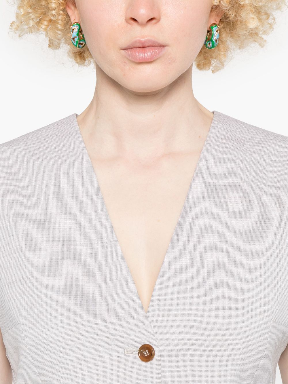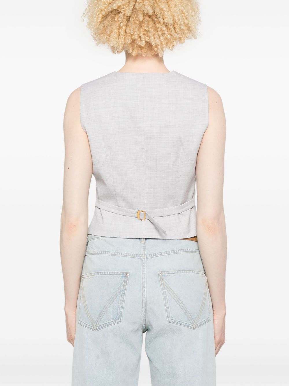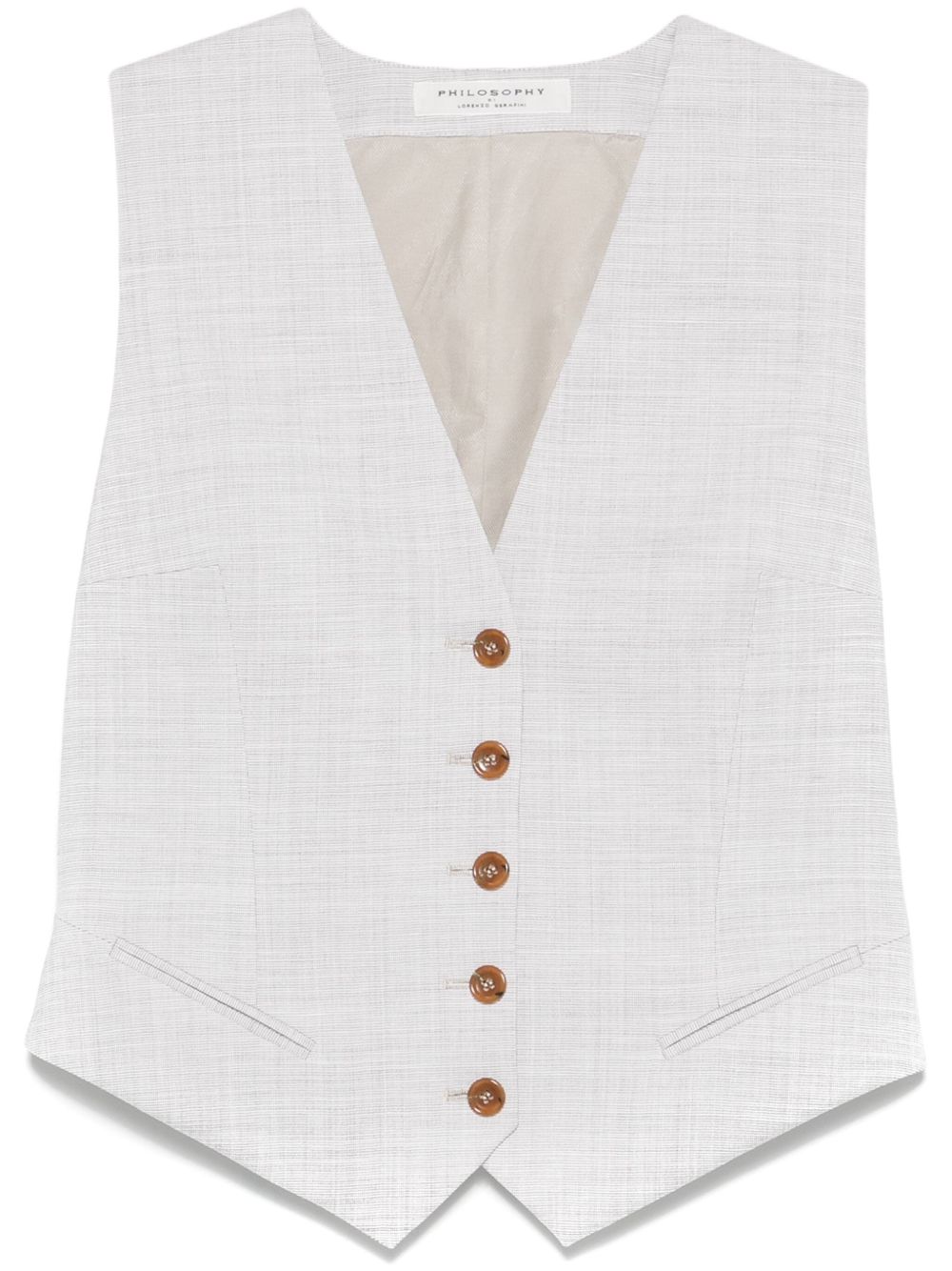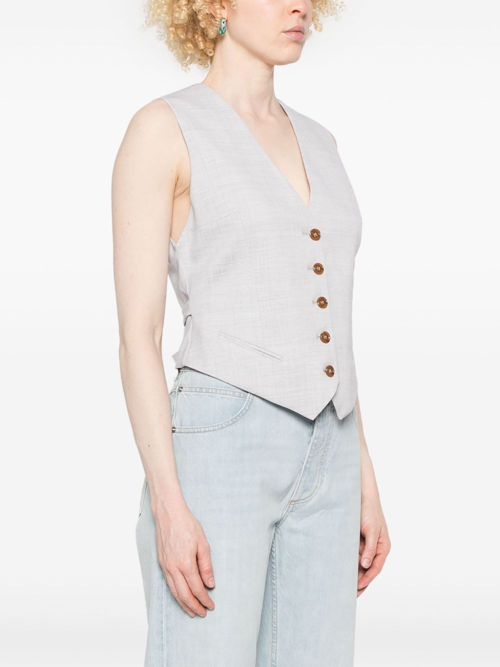 gilè sartoriale, scollo a v, chiusura con bottoni, tasche a filo laterali, cinturino regolabile posteriore, foderatoComposizione: 77% lana 10% lino 9% viscosa 2% elastane 2% setaIstruzioni per il lavaggio: lavare a secco