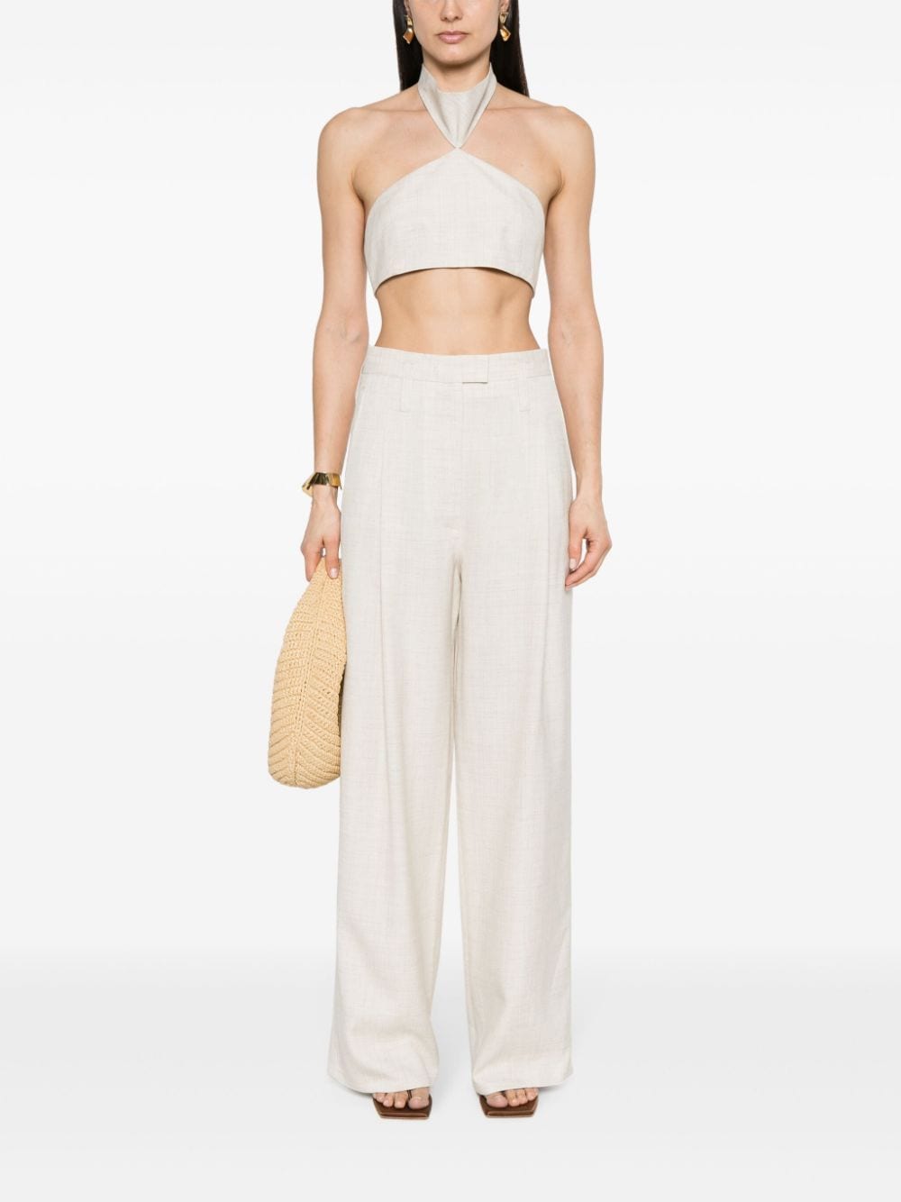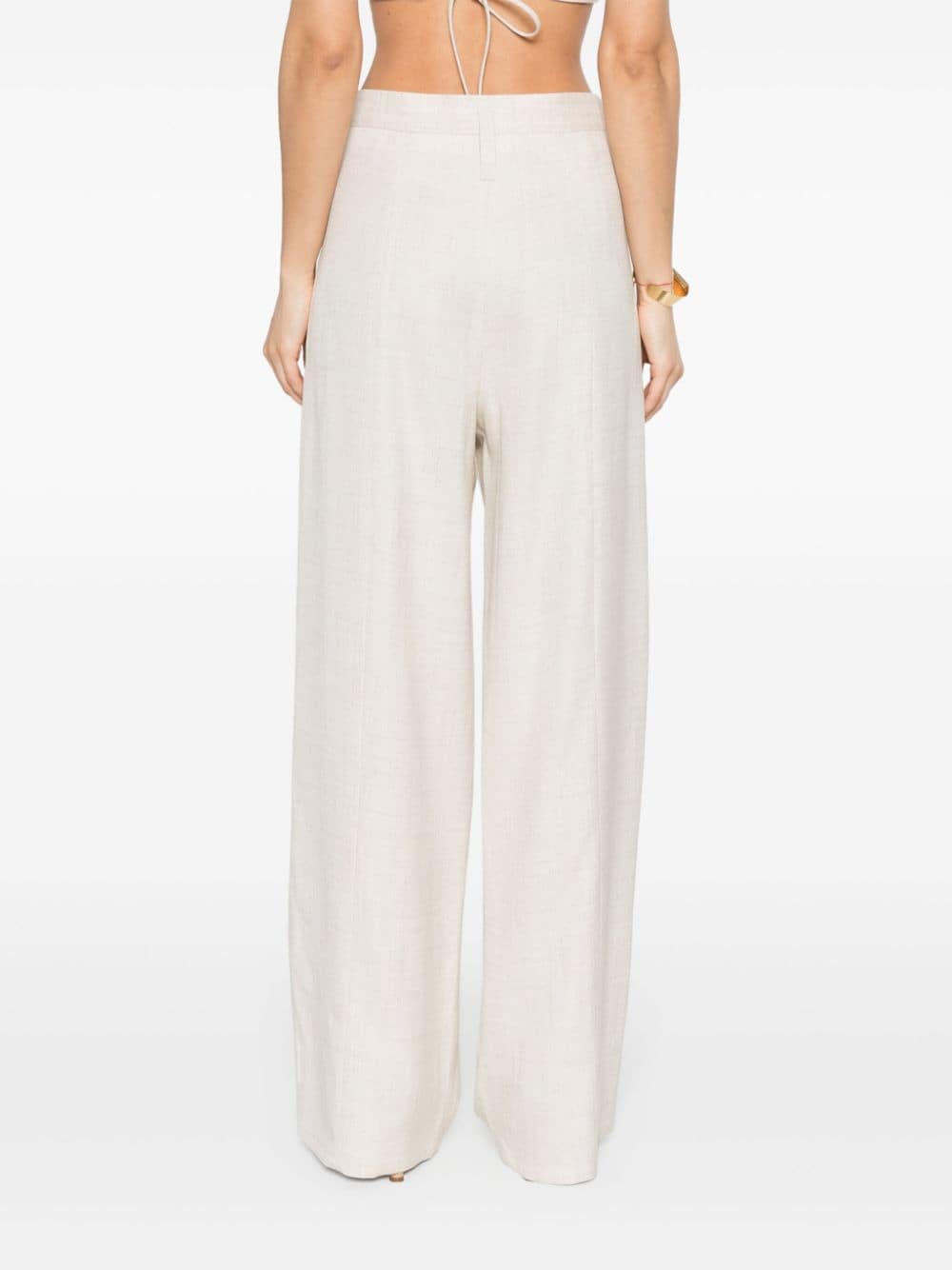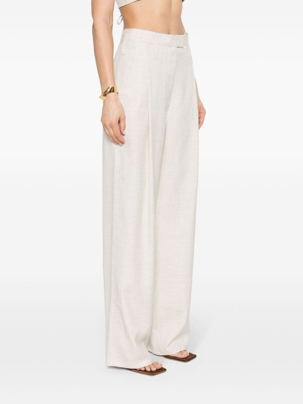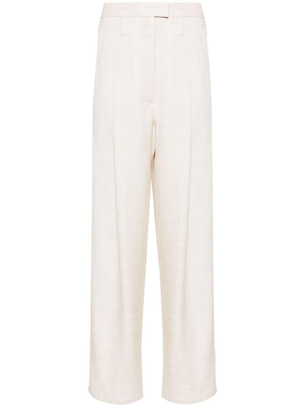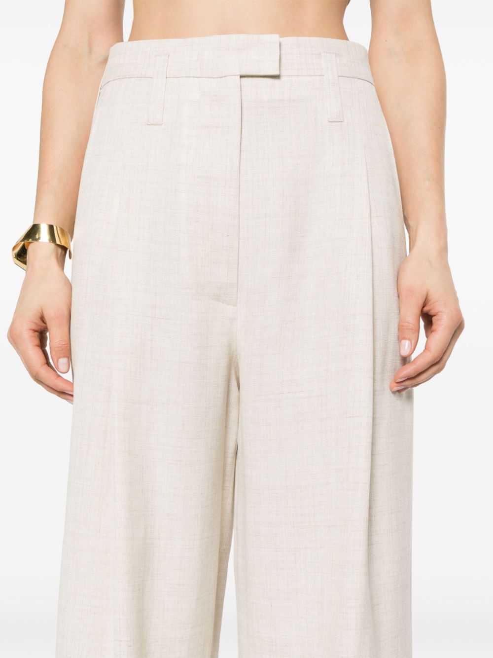 pantalone sartoriale, passanti per cintura, chiusura con gancio e zip, tasche laterali, pences, gamba larga, tessuto melange, colore ecru chiaro
