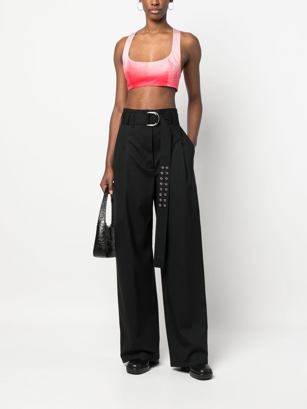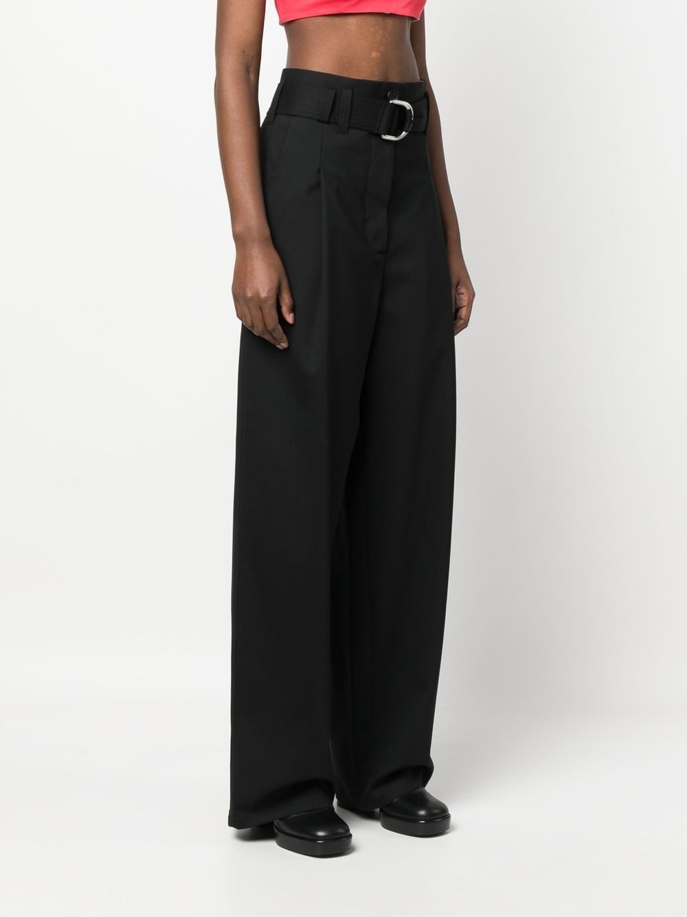 pantalone, vita alta, gamba larga, cintura con logo, passanti, bottone e zip, pences, tasche, gamba larga Composizione: 98% lana 2% elastane Istruzioni di lavaggio: lavare a secco