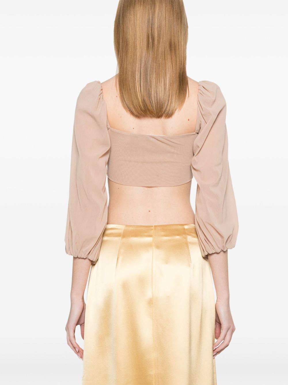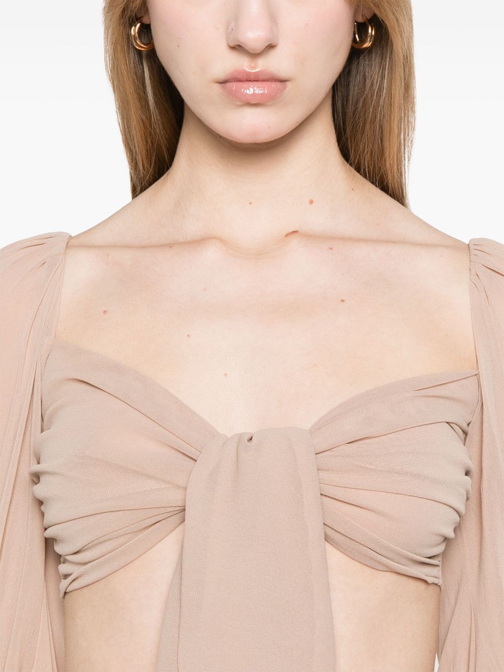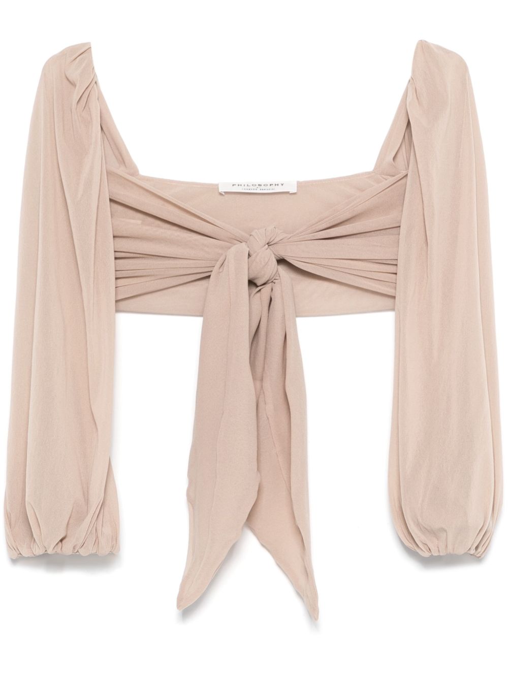 top crop, tulle stretch, manica lunga ampia, polsi con elastico, spalla con arriccio, chiusura con nodoComposizione: 100% poliammide Istruzioni per il lavaggio: lavare a mano