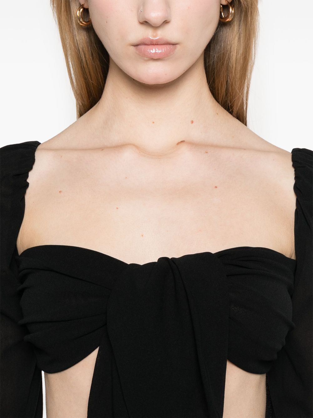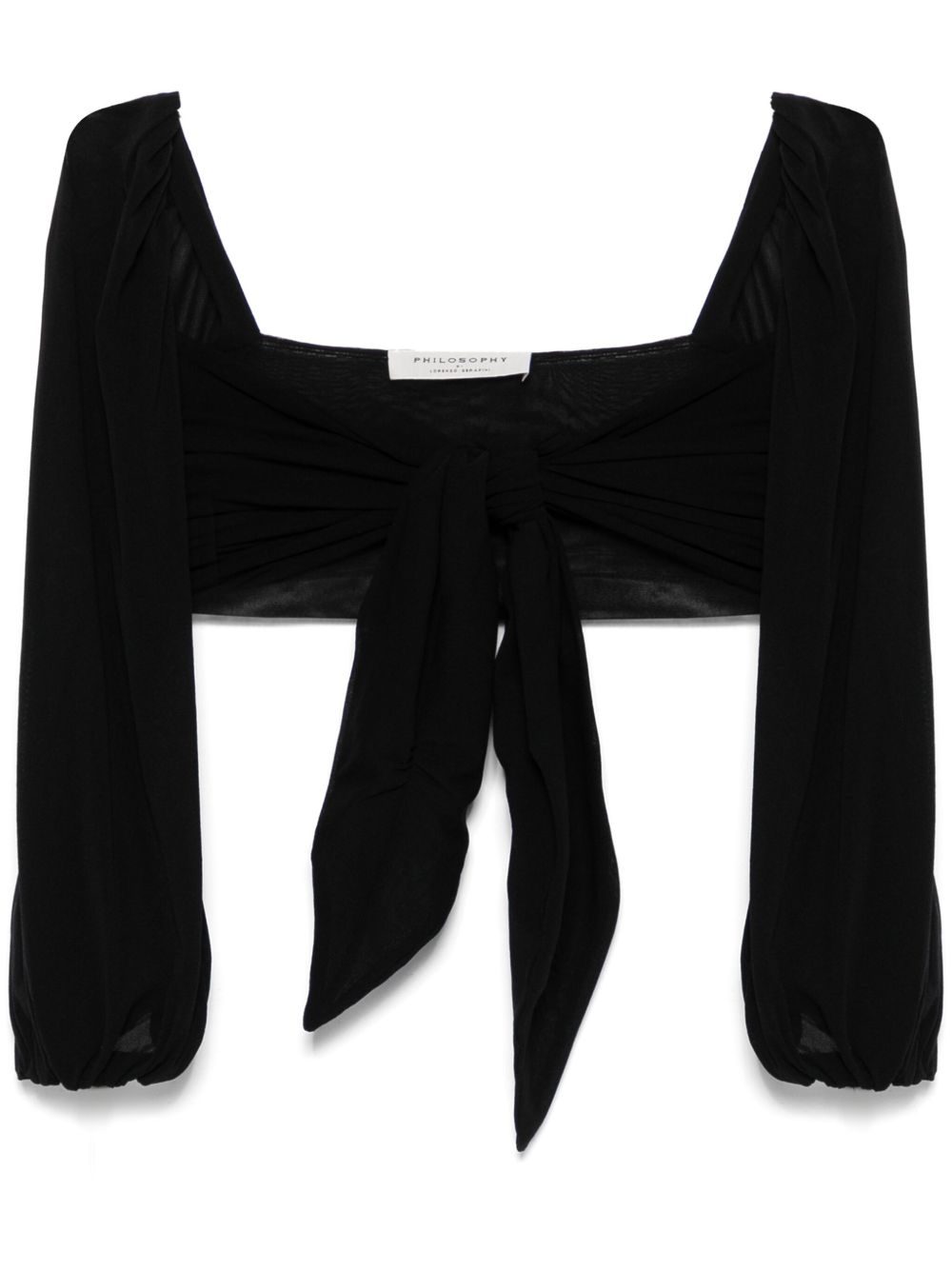 top crop, design con chiusura con nodo, manica lunga ampia, polsi con elastico, spalla con arriccio, tulle stretch Composizione: 100% poliammide Istruzioni per il lavaggio: lavare a mano