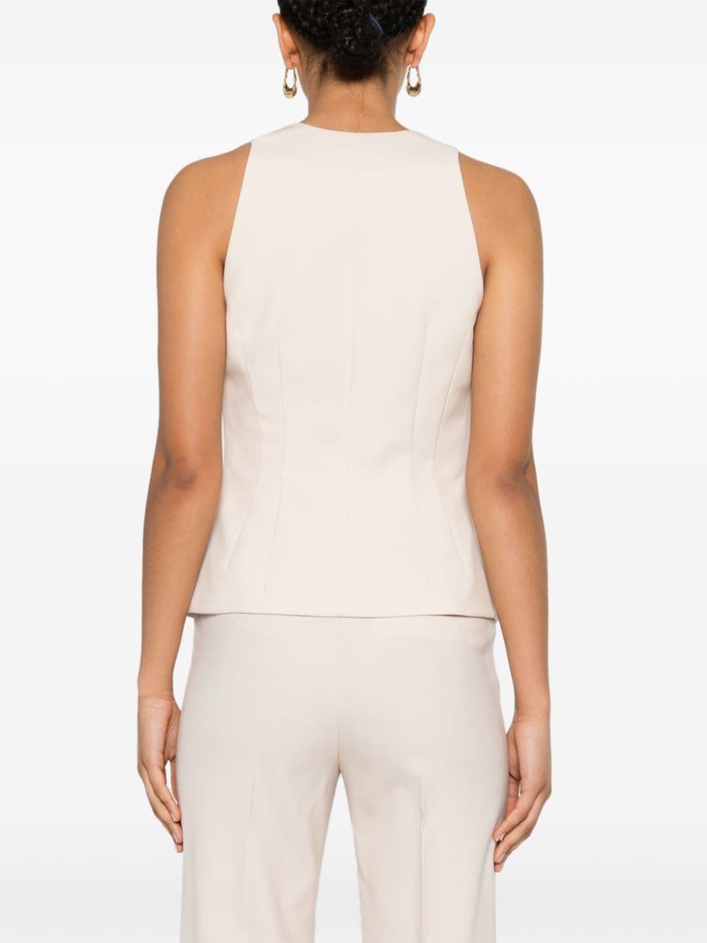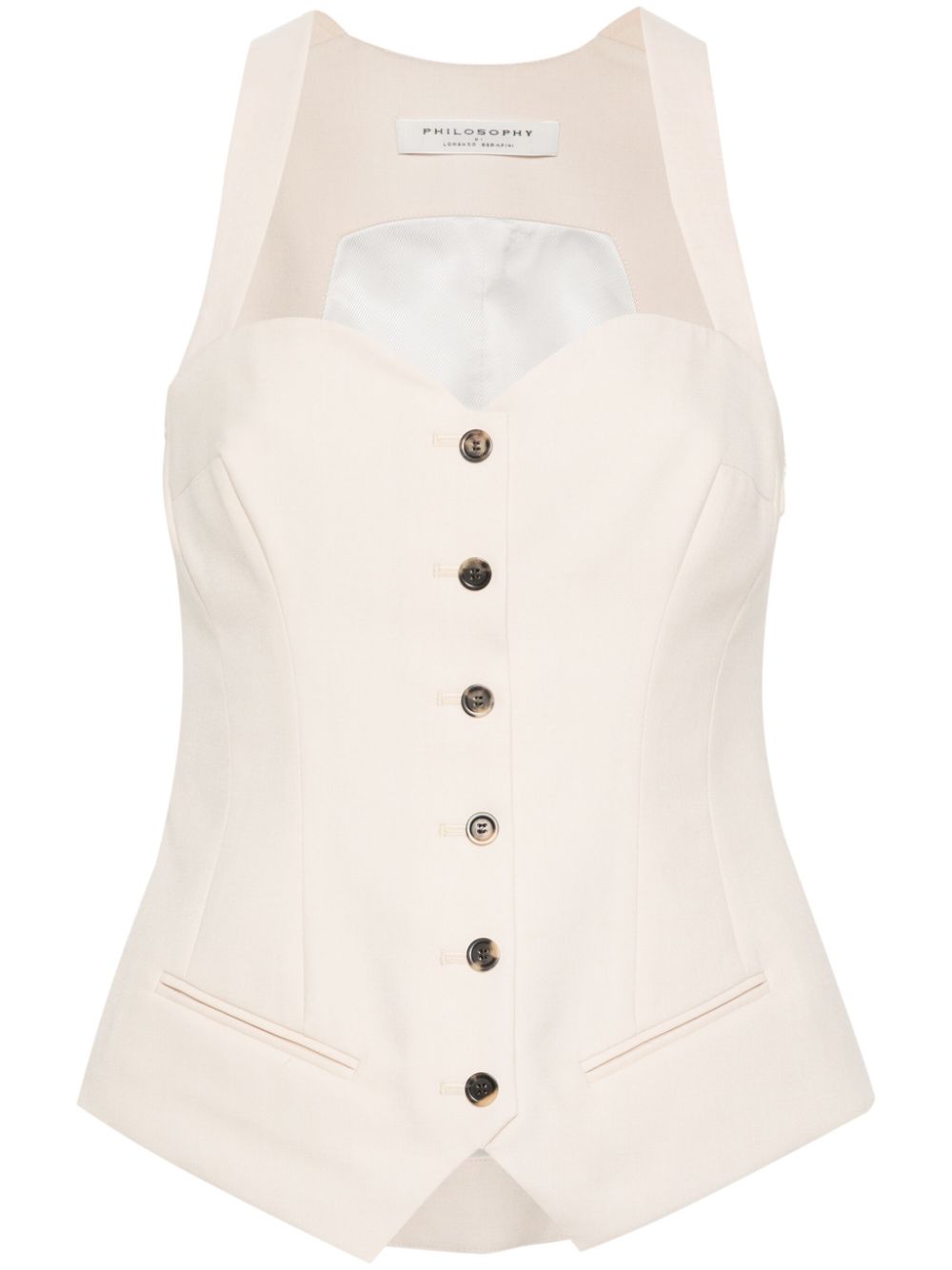 corsetto sartoriale, scollo a cuore, decoro bottoni frontale, tasche a filo laterali, foderato, chiusura con zip lateraleComposizione: 54% poliestere 44% lana 2% elastane Istruzioni per il lavaggio: lavare a secco