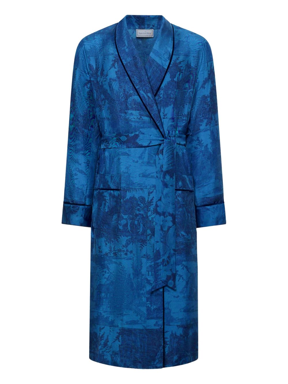vestaglia lunga, collo sciallato, chiusura con cintura removibile, tessuto toile de jouy, tasche laterali applicate, maniche lunghe con risvolto, bordi con piping in velluto Composizione: 100% seta Istruzioni per il lavaggio: lavare a secco