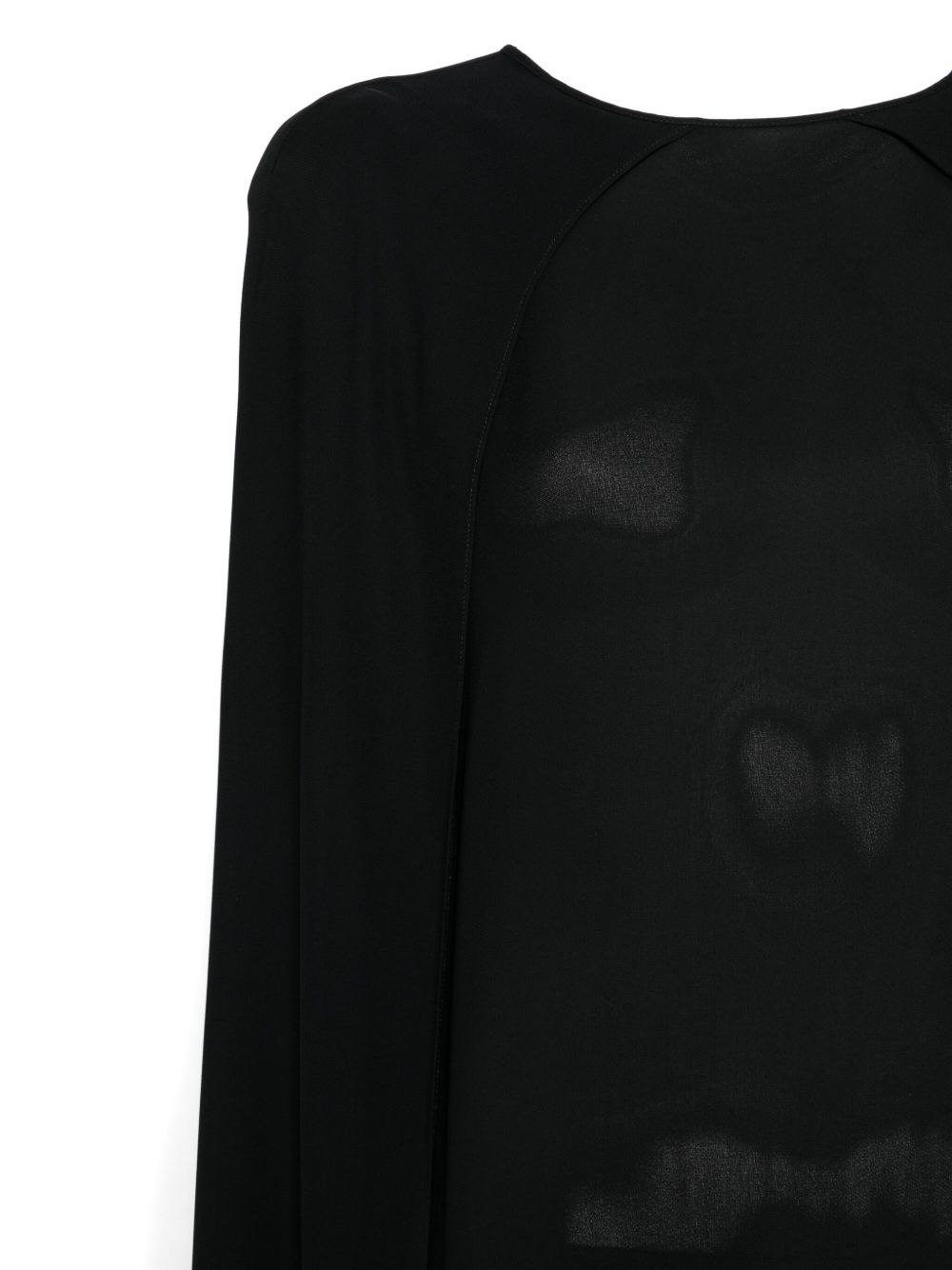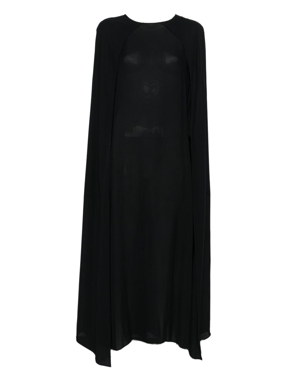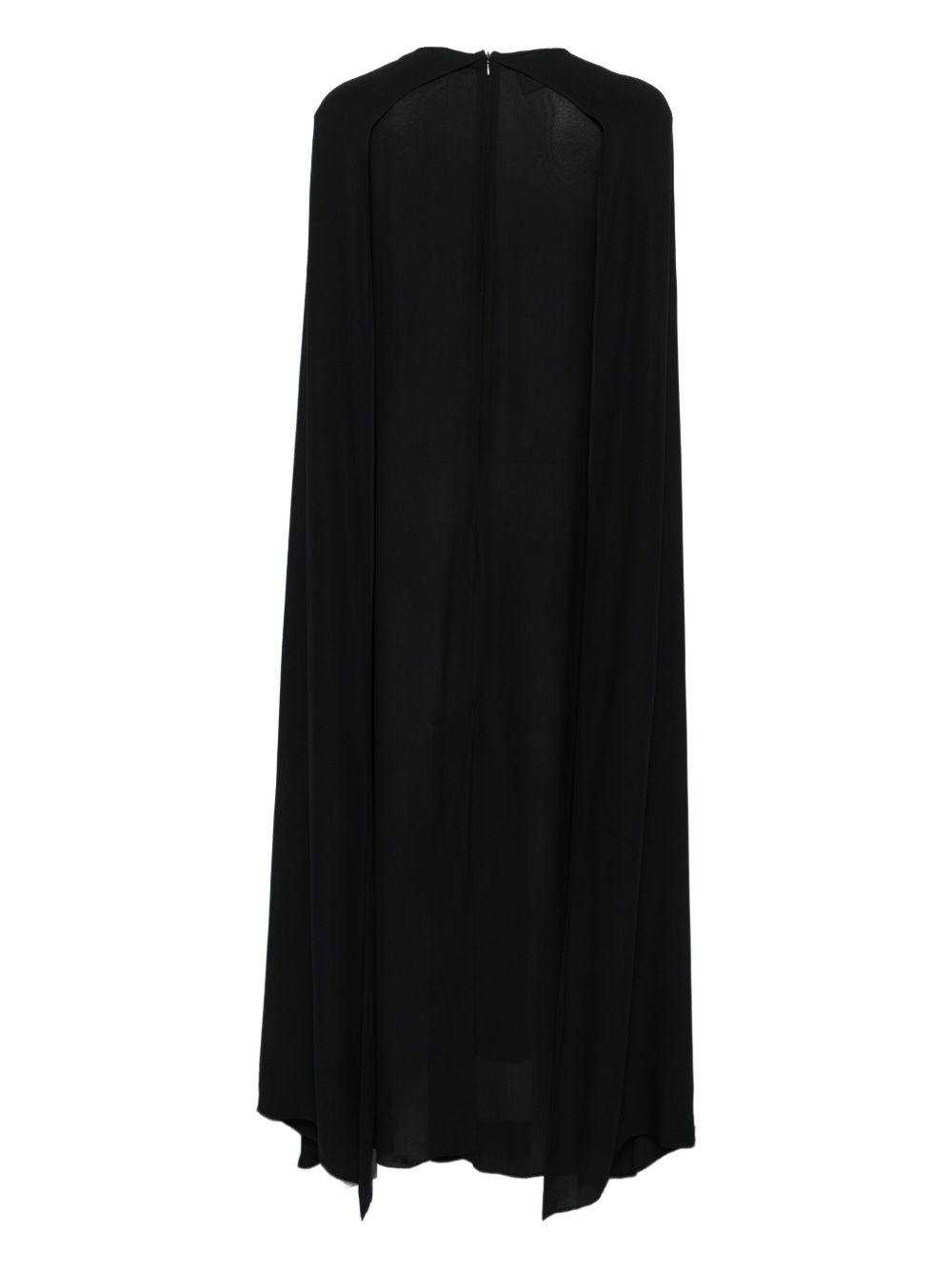 abito lungo, girocollo, manica lunga, polsini con bottoni, tessuto su spalle con effetto mantella, chiusura con zip posteriore, spacco posteriore