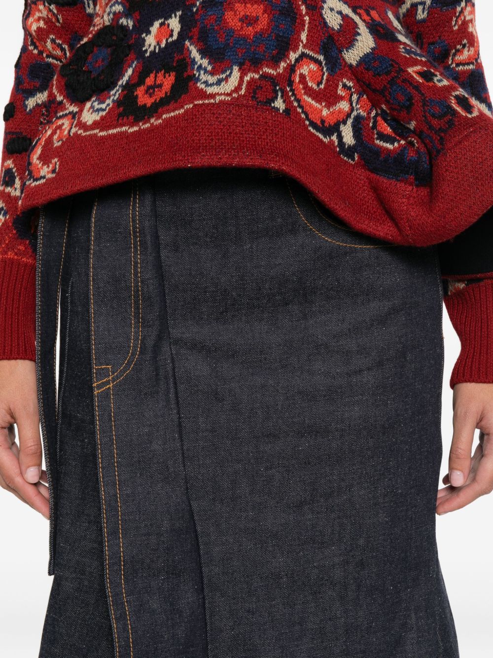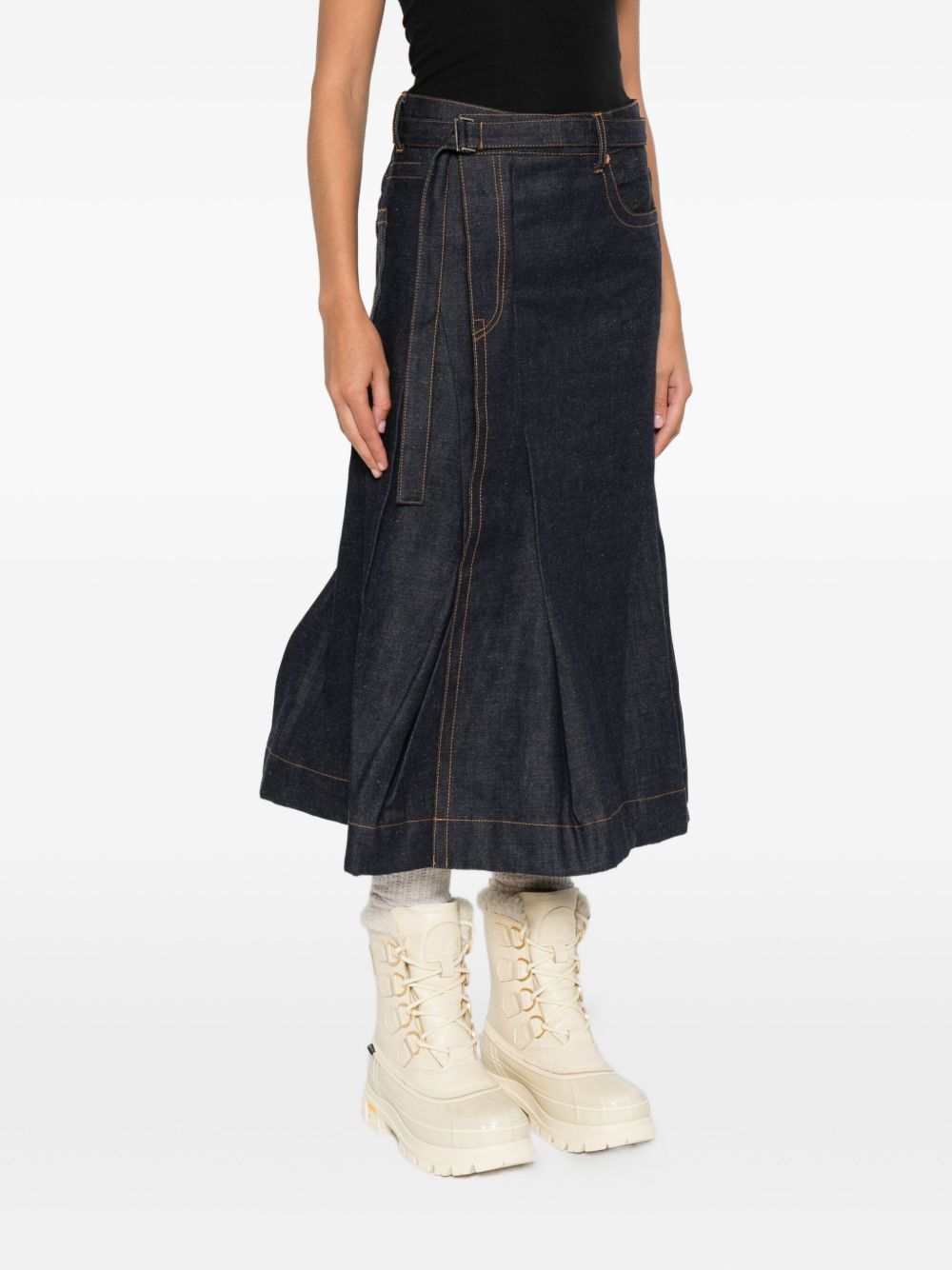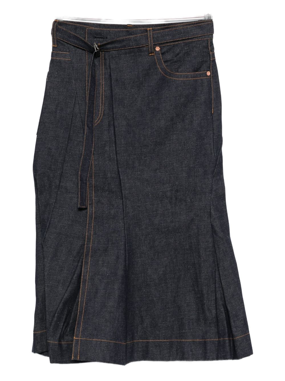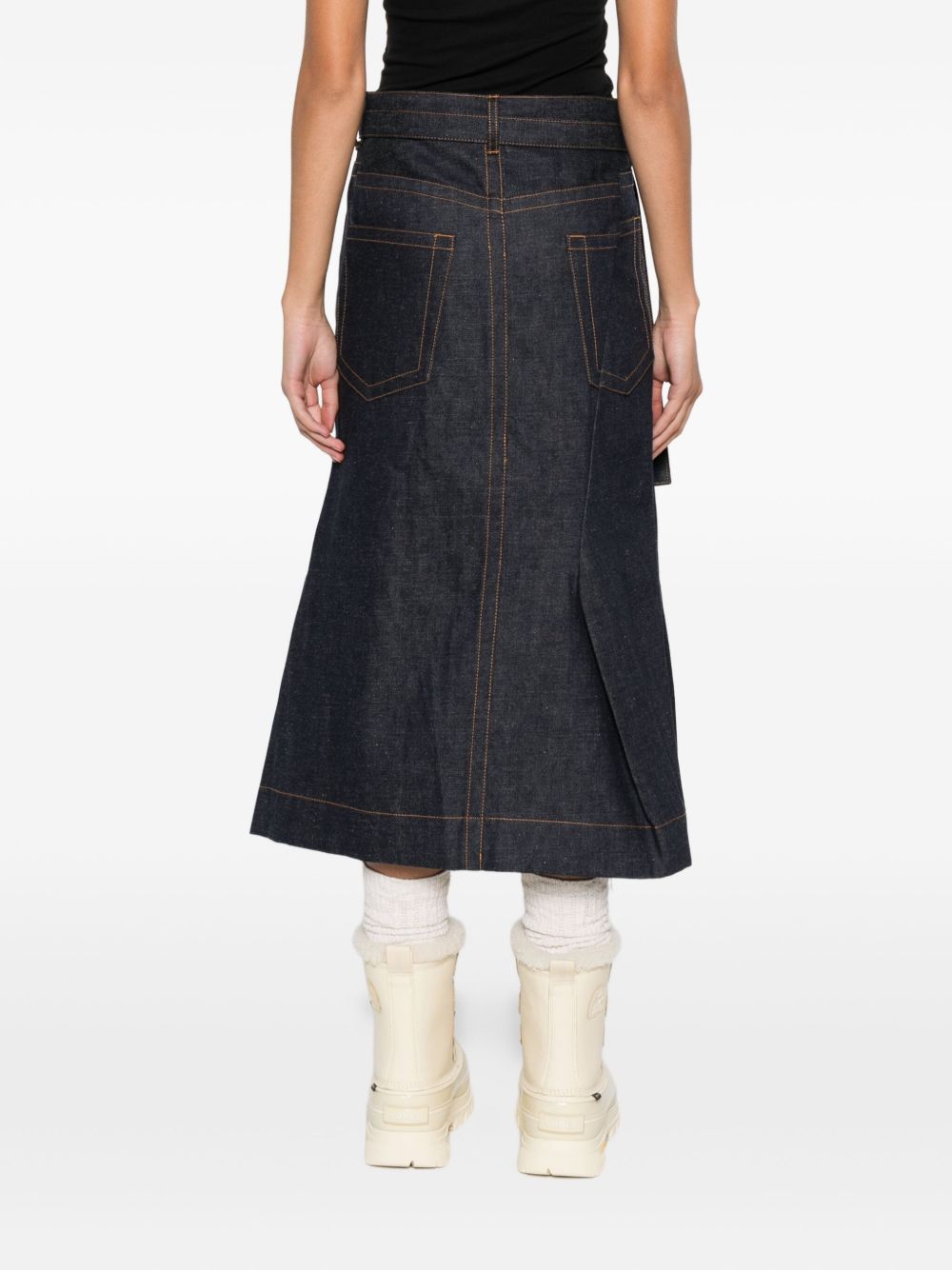 gonna, denim, design a portafoglio, passanti per cintura, cintura removibile, chiusura con zip, spacco frontale, tasca laterale, tasche posteriori applicate, fondo svasato