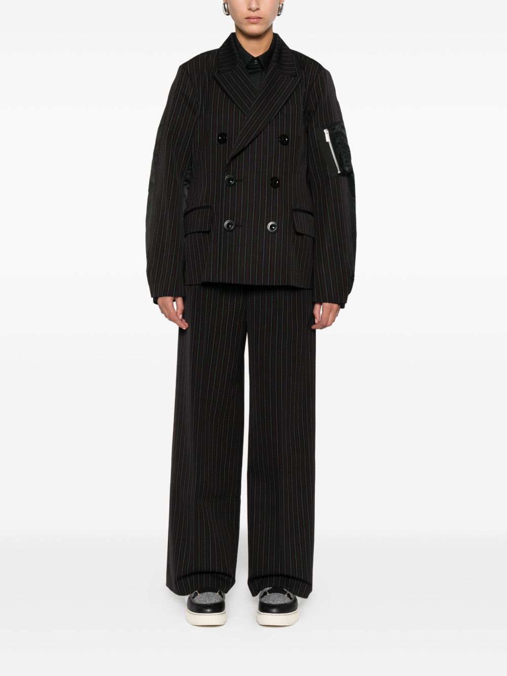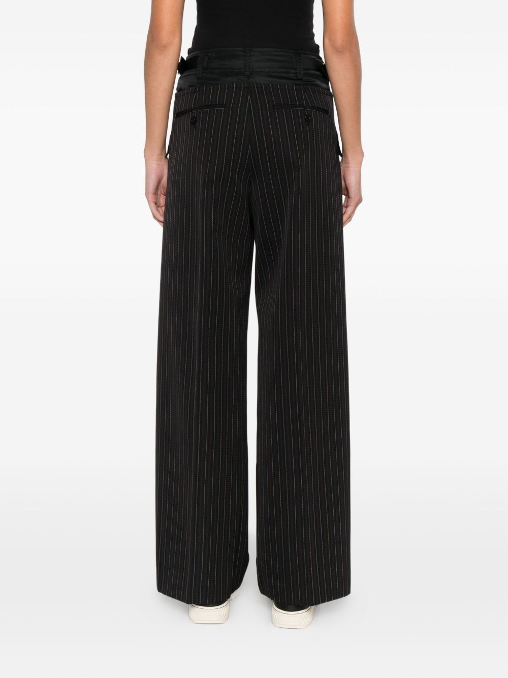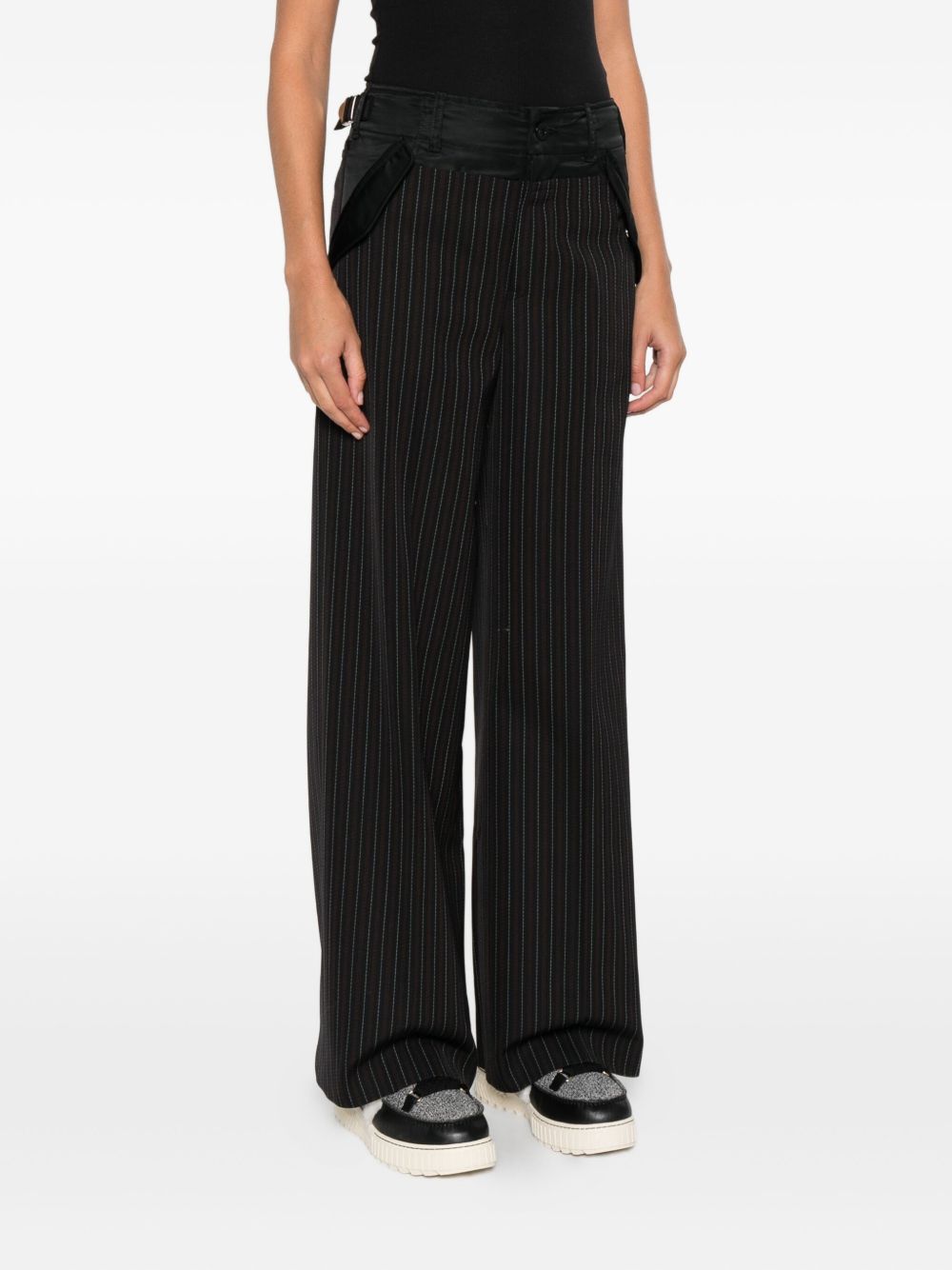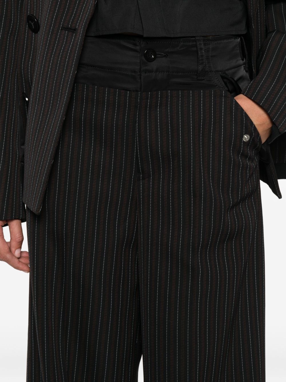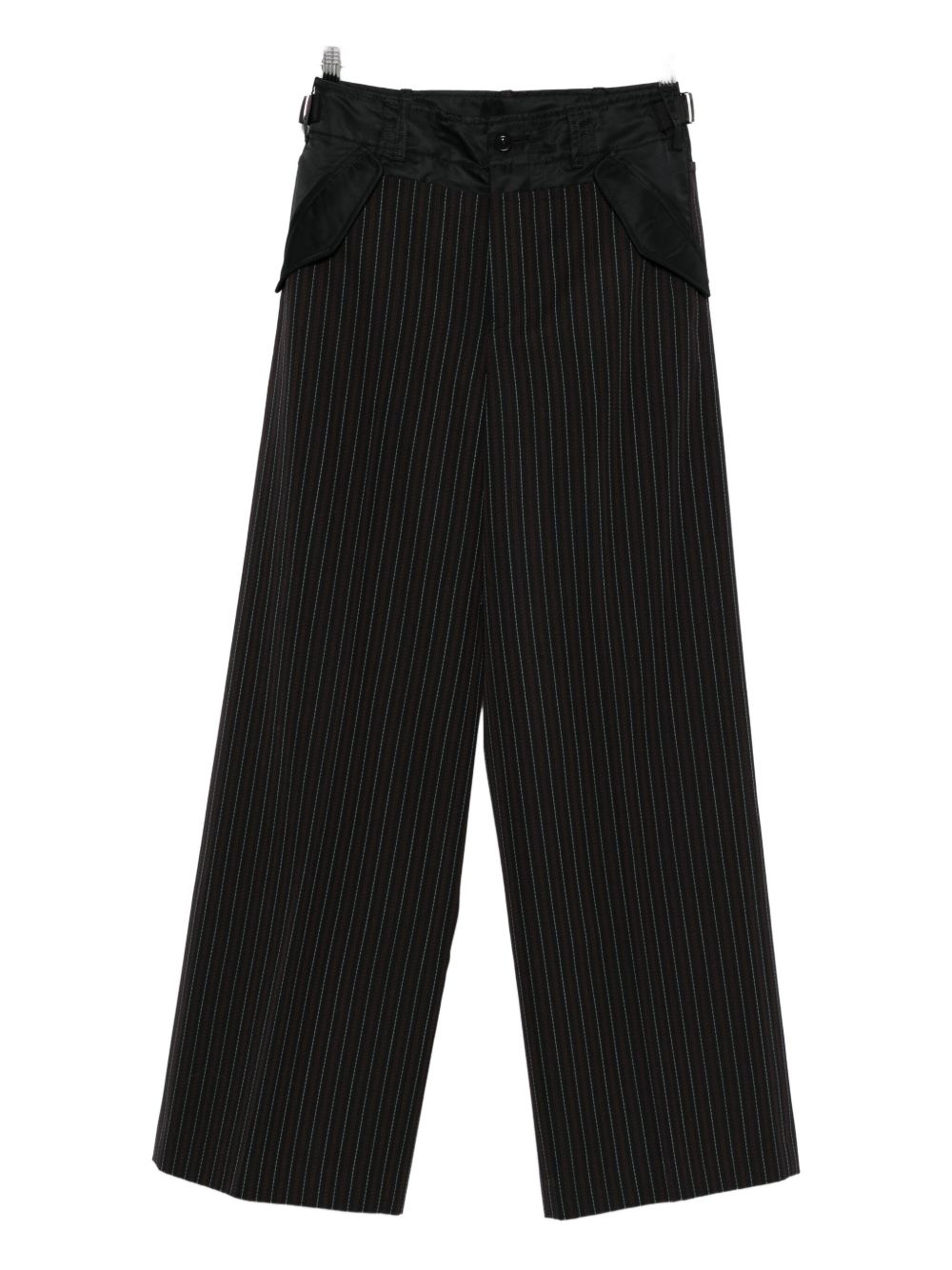 pantalone sartoriale, tessuto gessato, parti in nylon, chiusura con bottone e zip, passanti per cintura, cinturini regolabili laterali, tasche laterali con pattine e bottone a pressione, tasche posteriori a filo con bottone, gamba larga