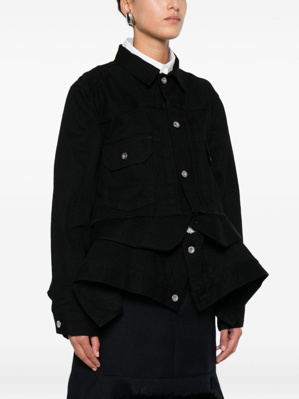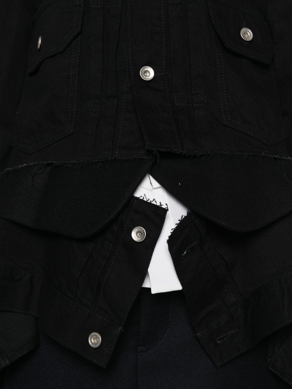 giacca, denim e panno, colletto a punta, chiusura con bottoni, tasche frontali con pattine e bottoni, fondo a strati asimmetrico e svasato, manica lunga, polsi con bottoni