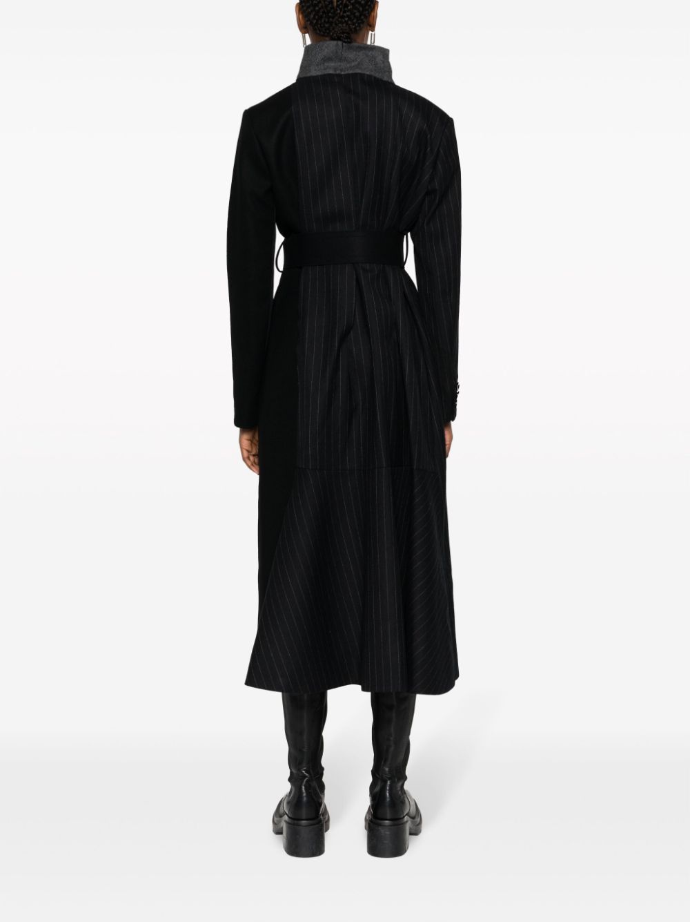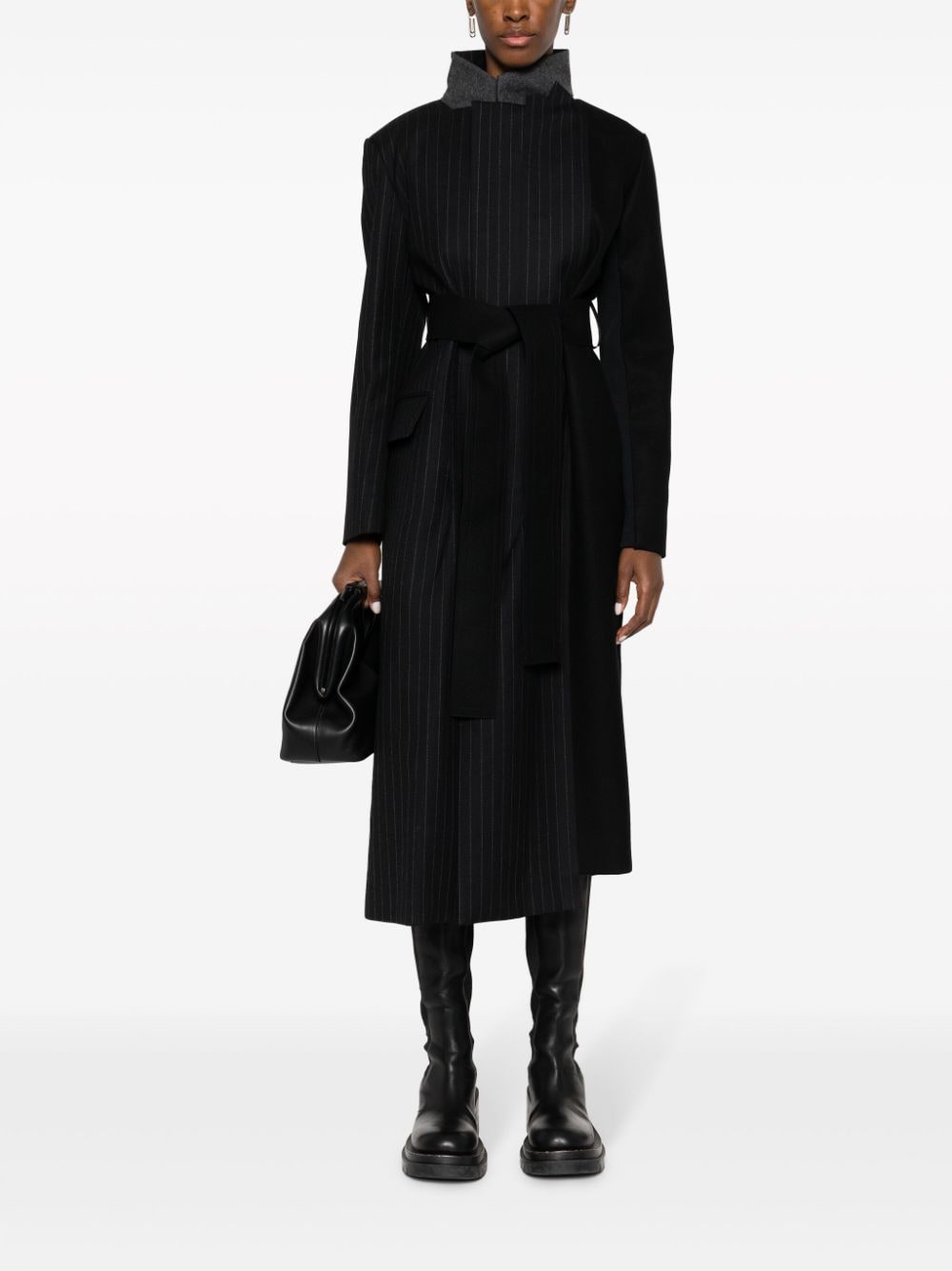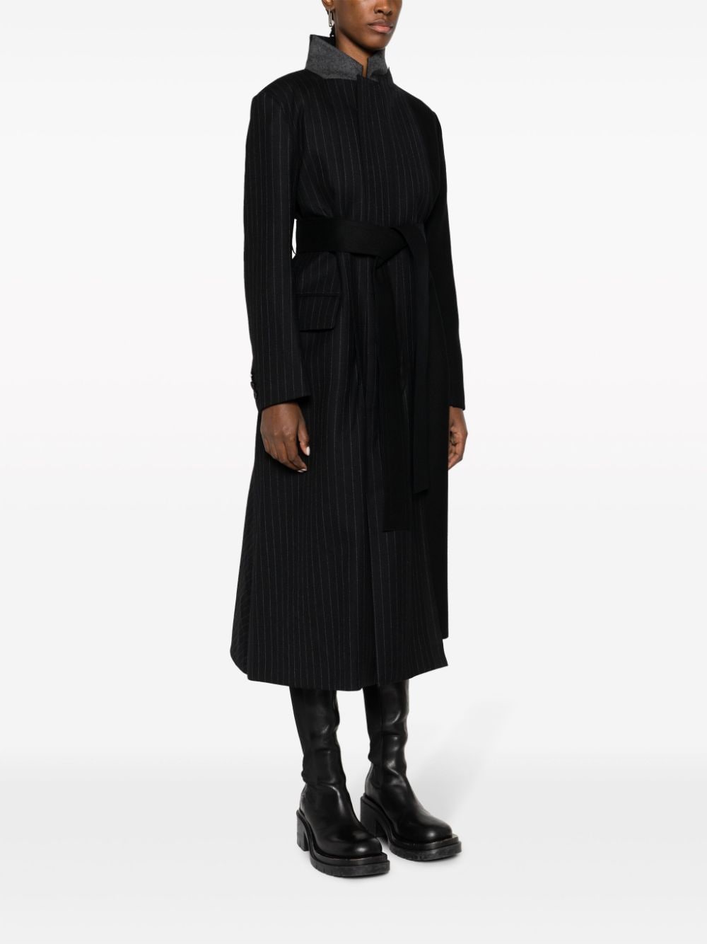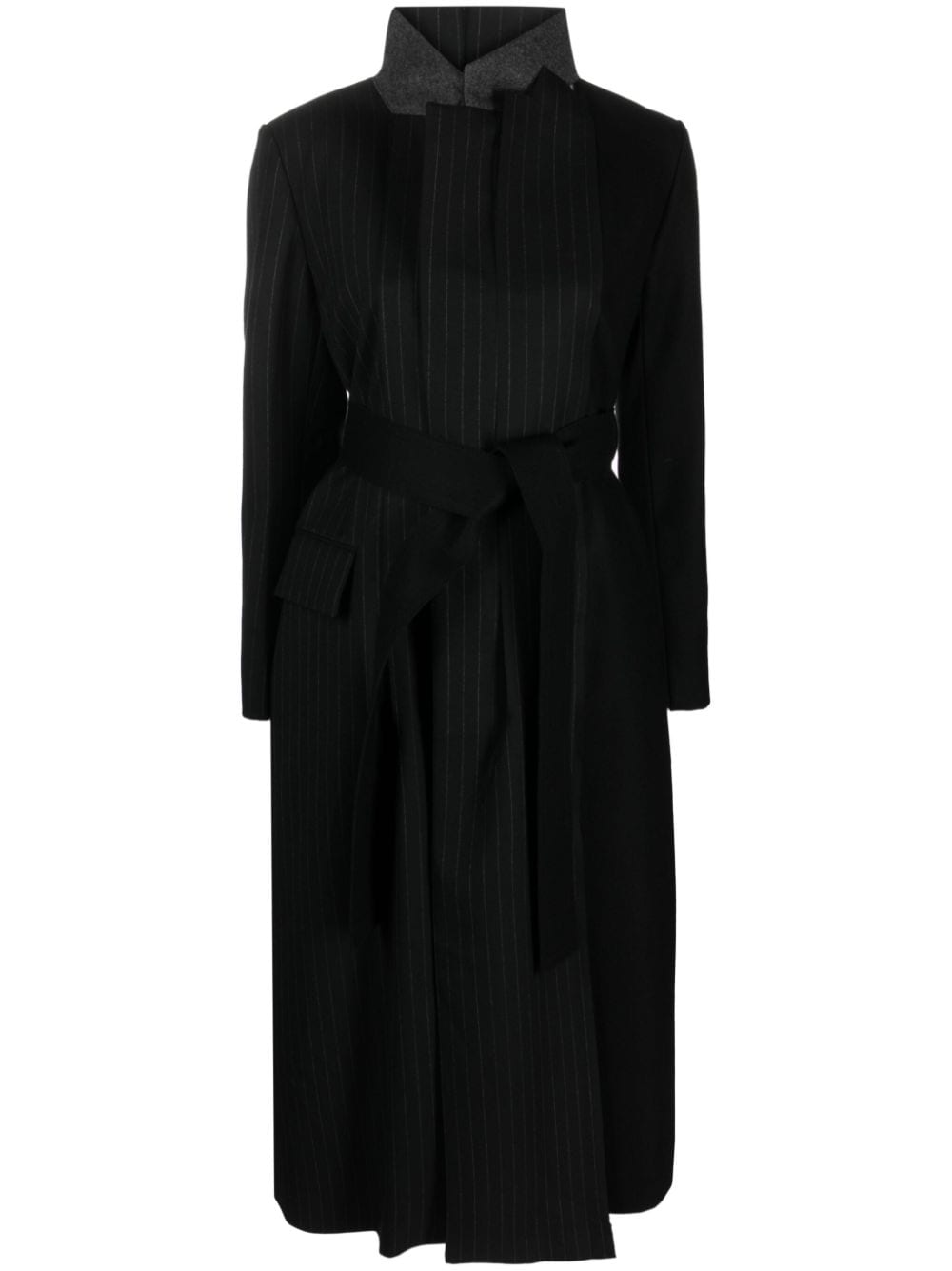 coat, pinstripe and solid color fabric, belt, pocketsComposition: 100% wool, 100% polyesterWashing Instructions: Dry clean