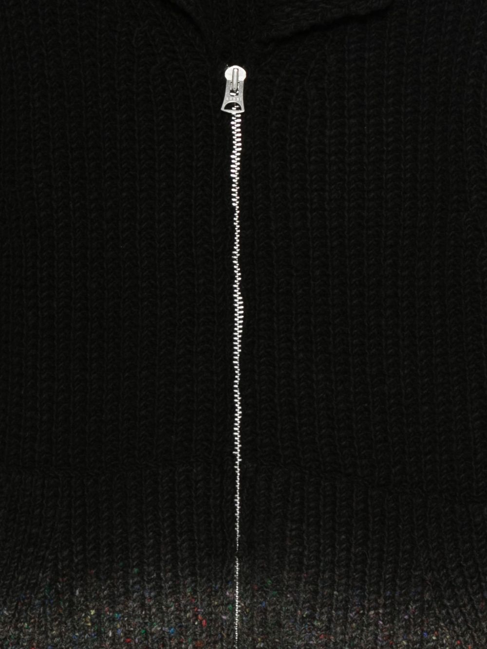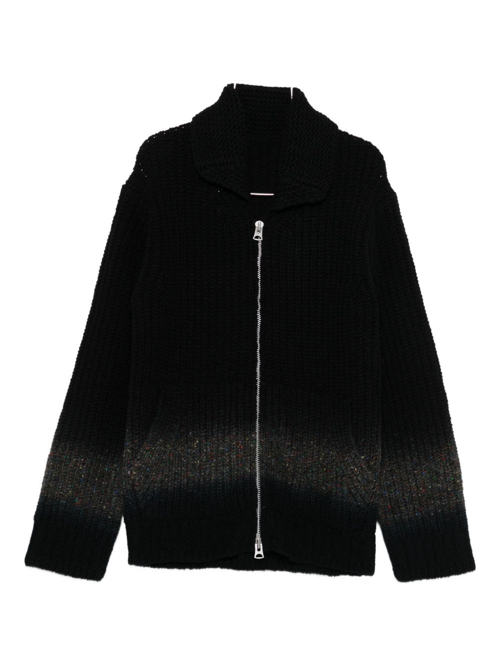 cardigan, chiusura con zip, colletto stondato, tasche laterali a marsupio, manica lunga, fondo con sfumatura a contrasto