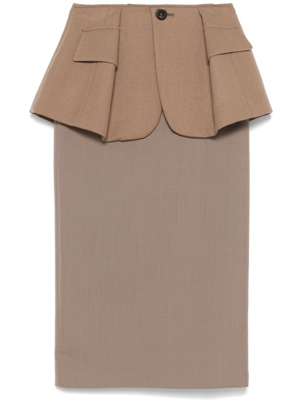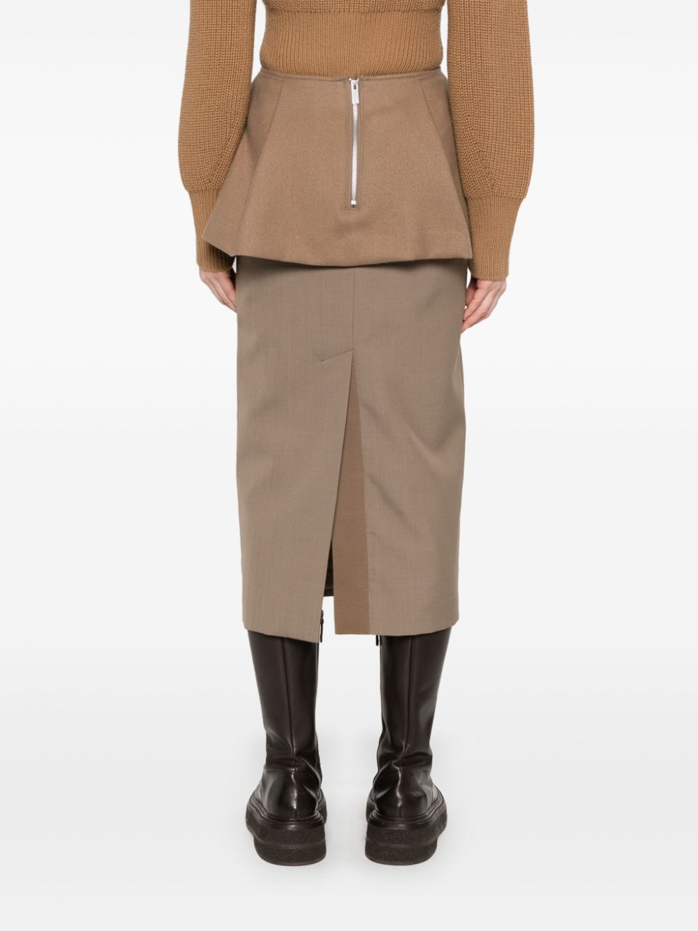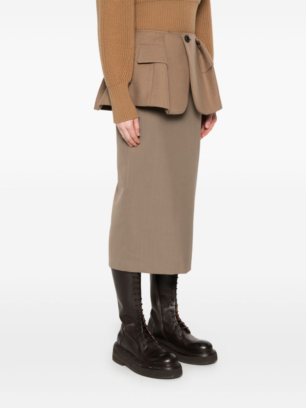 gonna, longuette, baschina con tasche e bottone, chiusura con zip posteriore, spacco posteriore con gros grainComposizione: 100% lana Istruzioni per il lavaggio: lavare a secco