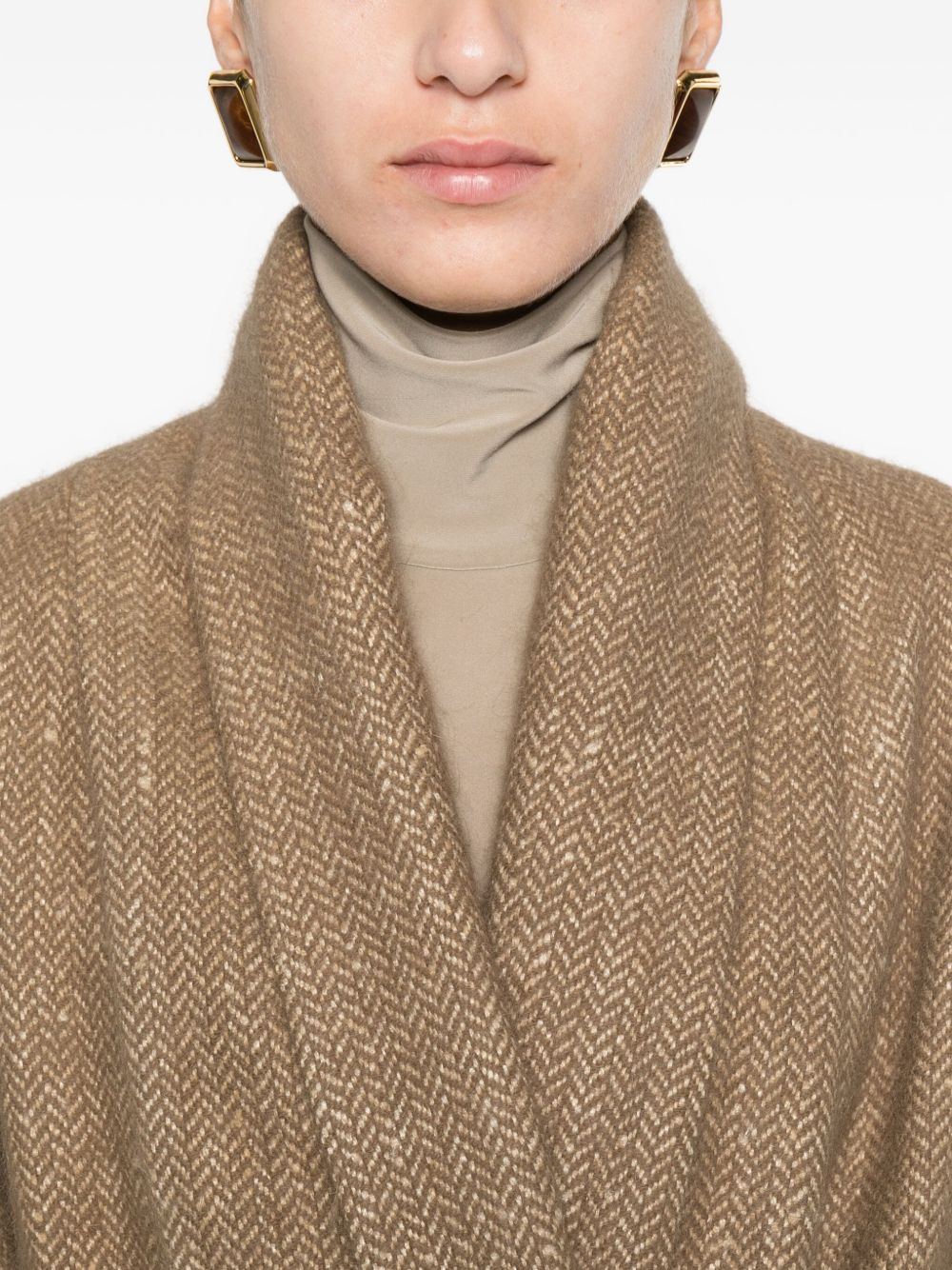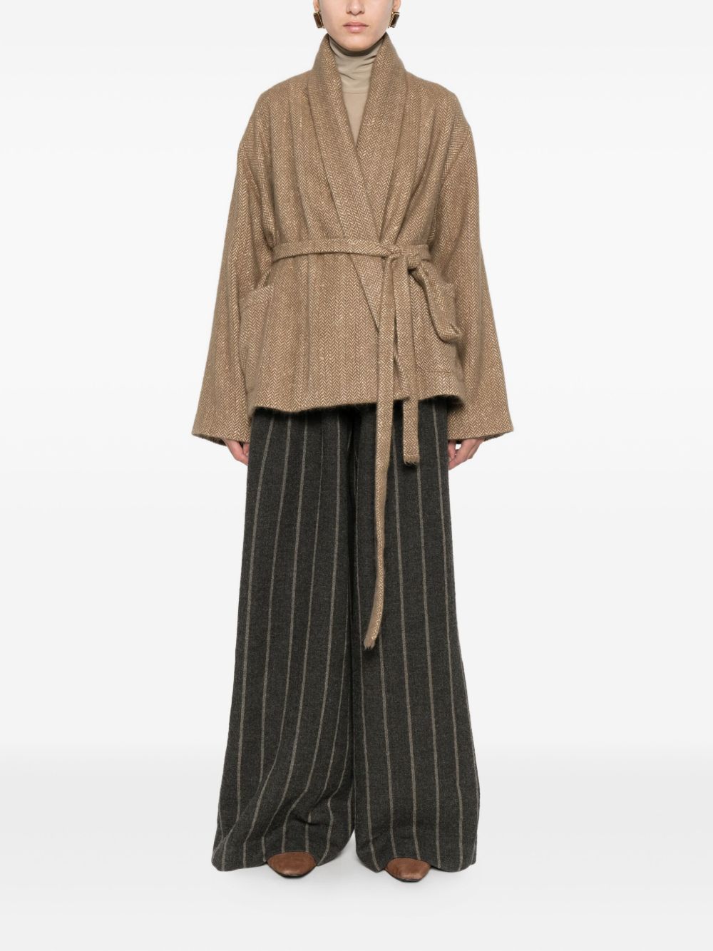 giacca, collo sciallato, chiusura con cintura removibile, passanti, , tessuto spigato, tasche applicate lateralmente, maniche lunghe, foderata, vestibilità ampia