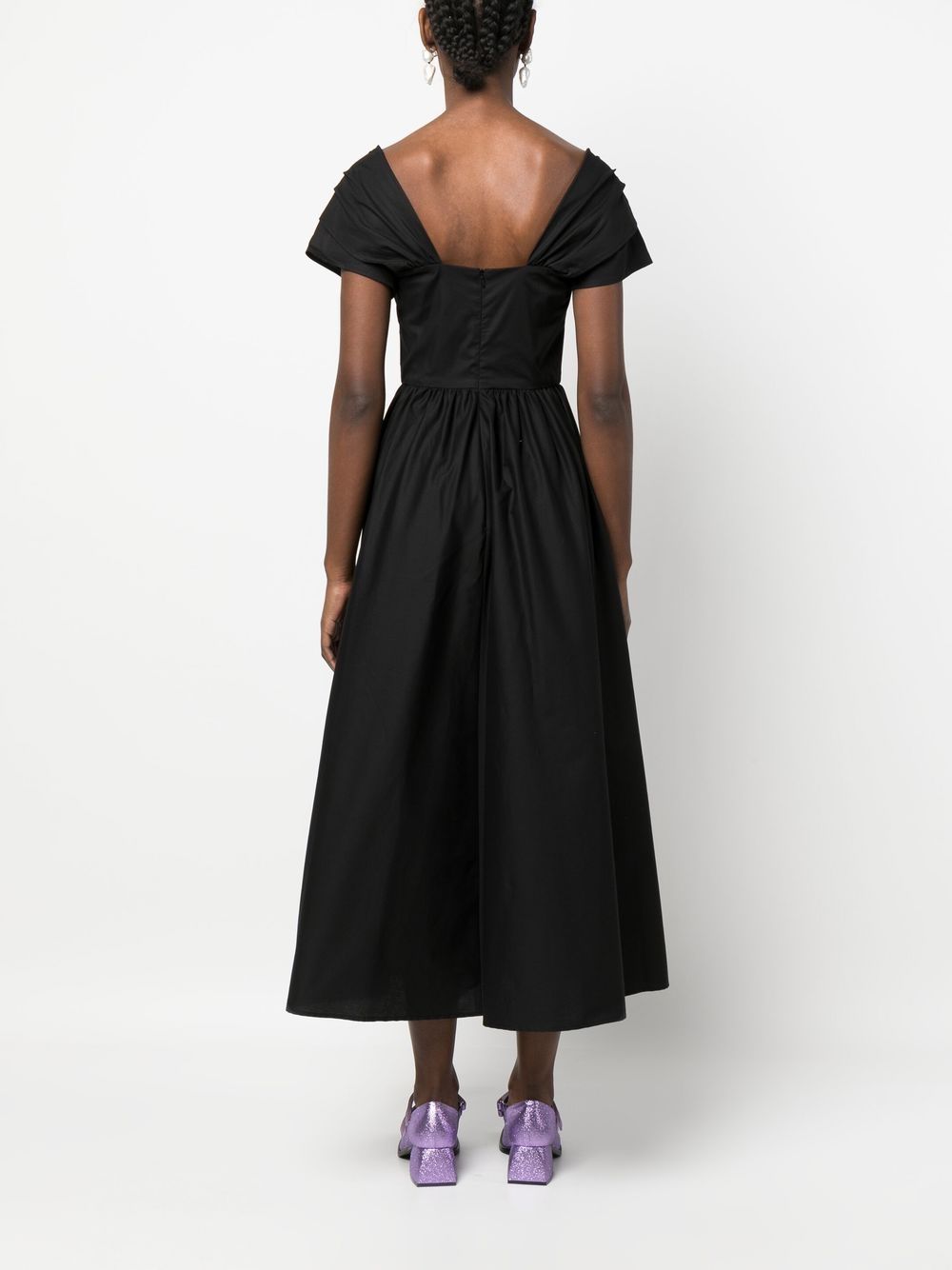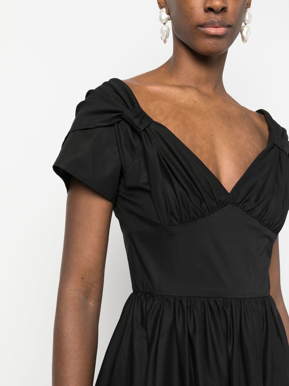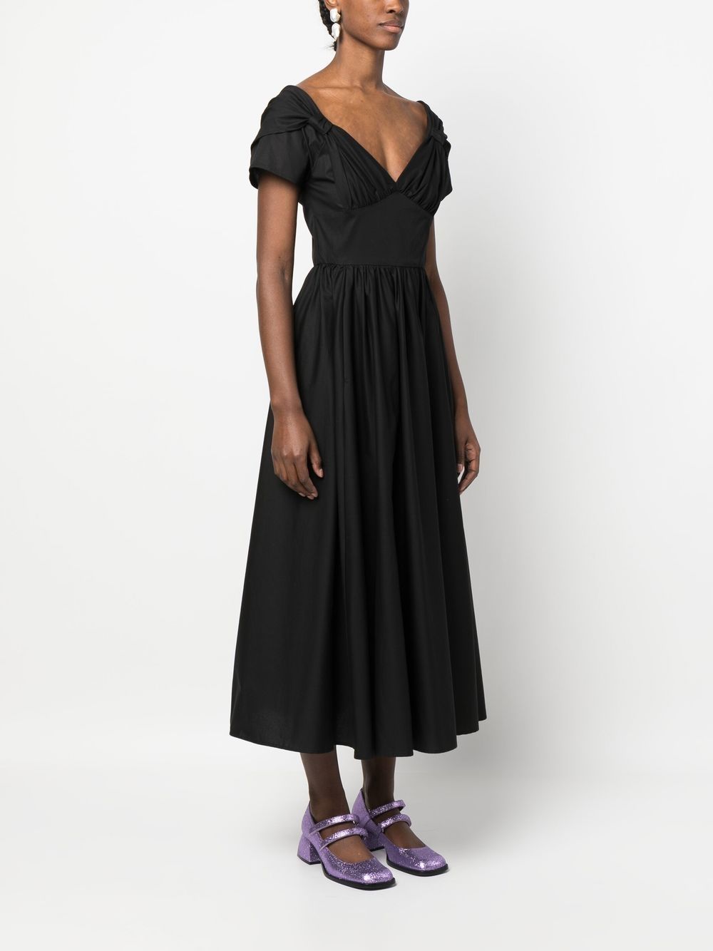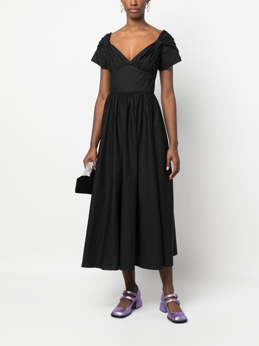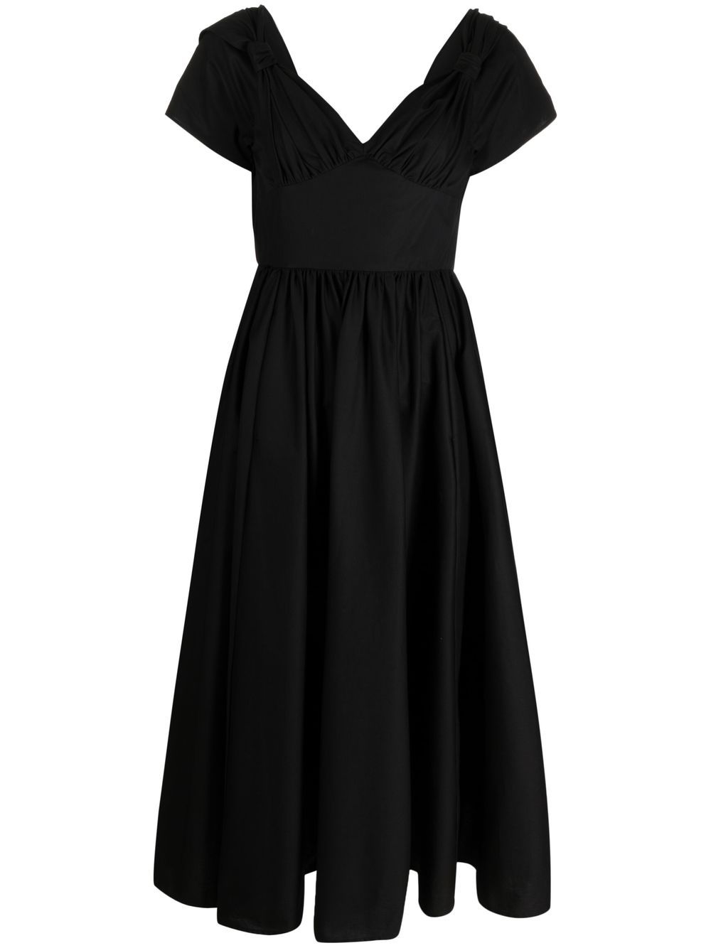 abito midi , popeline, scollatura a cuore, nodi laterali, manica corta con doppio strato, gonna ampia, zip posteriore