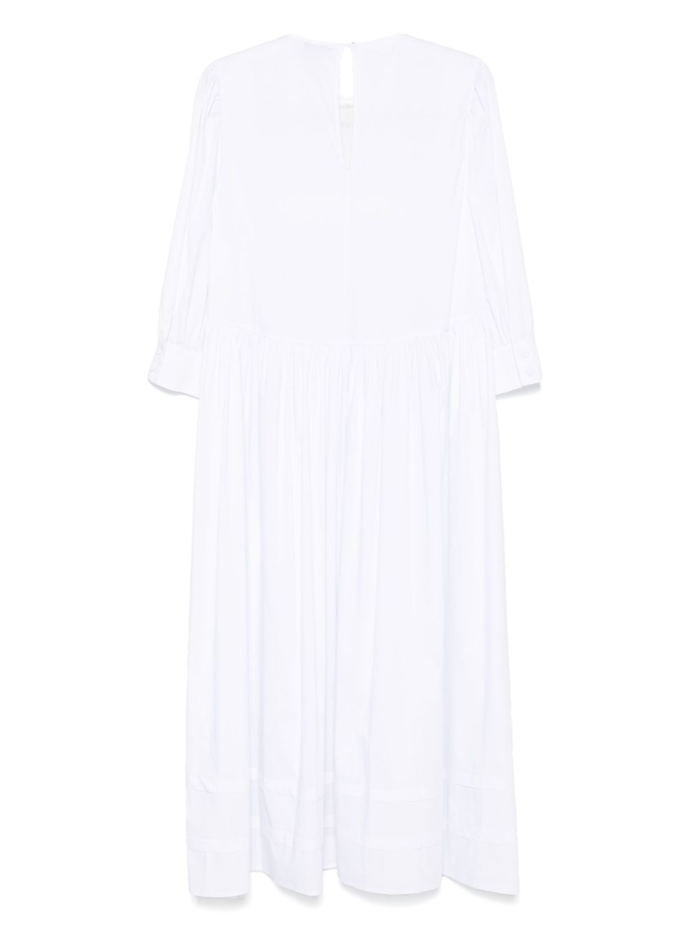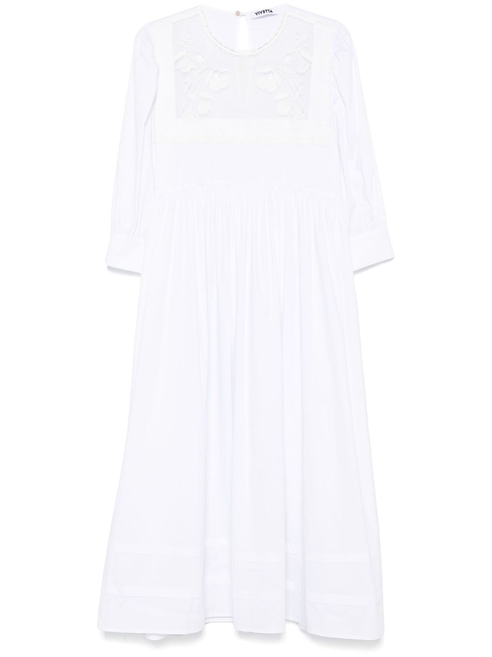 abito lungo, girocollo, plastron ricamato, chiusura con bottone posteriore, manica a tre quarti, polsino con arriccio e bottoni, vita arricciata, fondo svasato e con pieghe Composizione: 71% cotone 25% poliammide 4% elastane Istruzioni per il lavaggio: lavare a mano