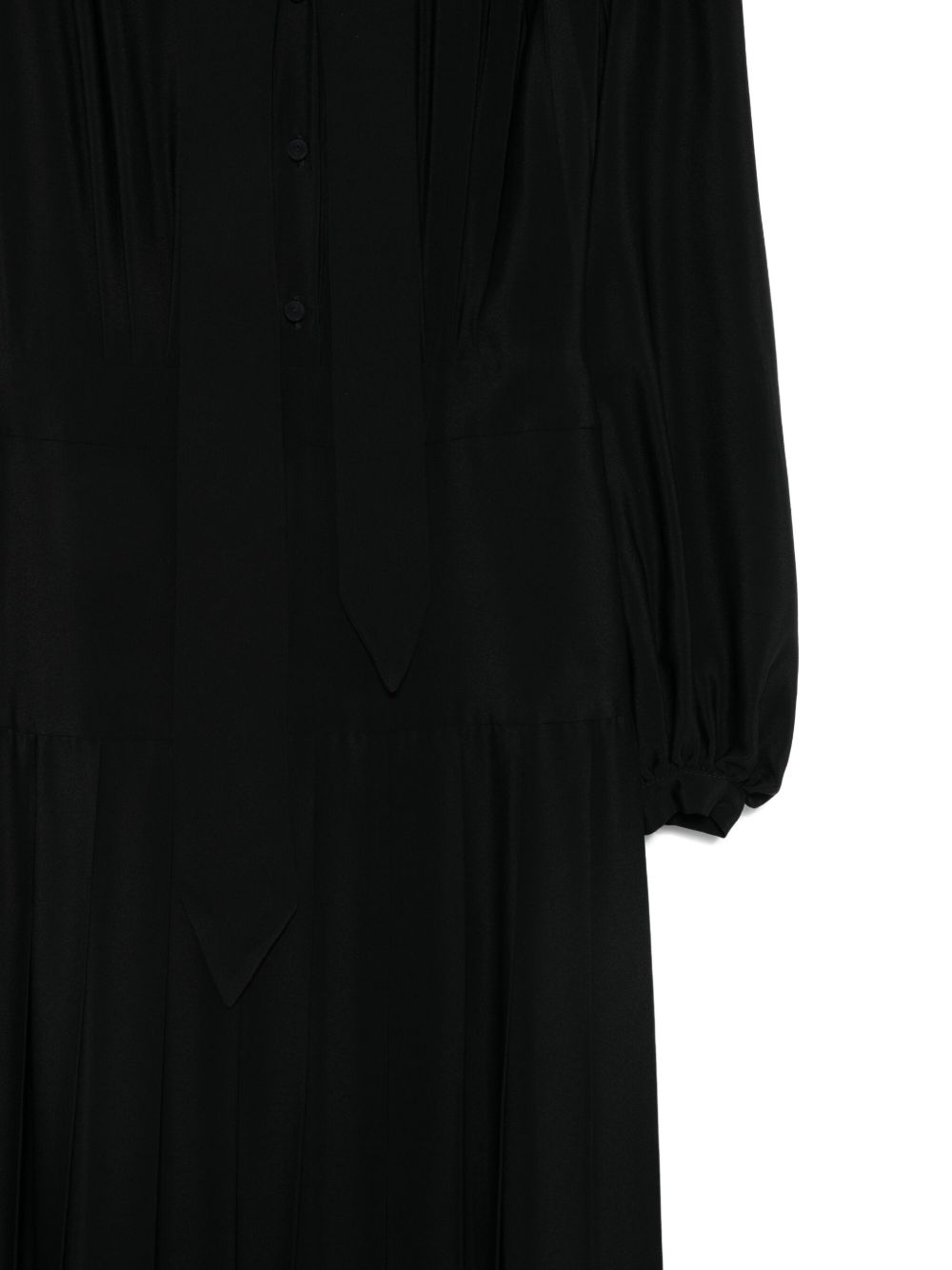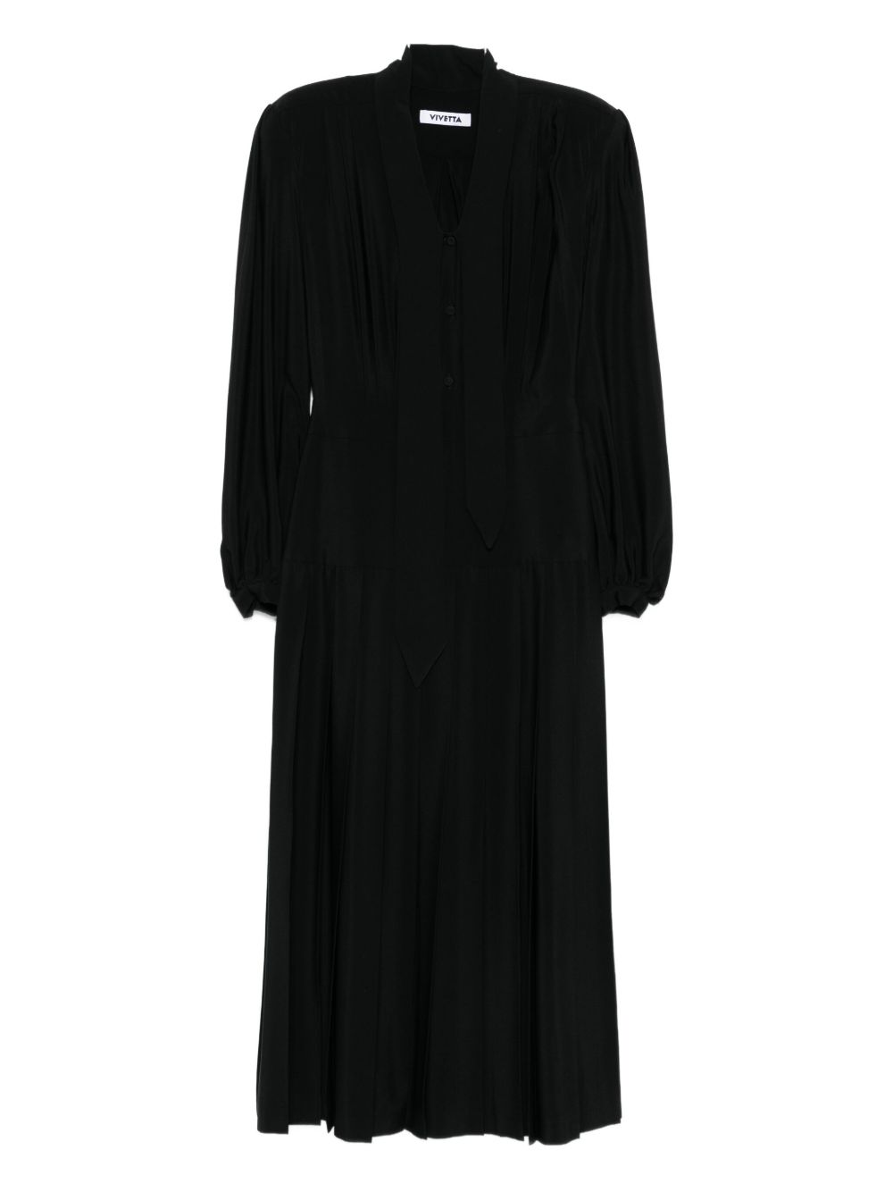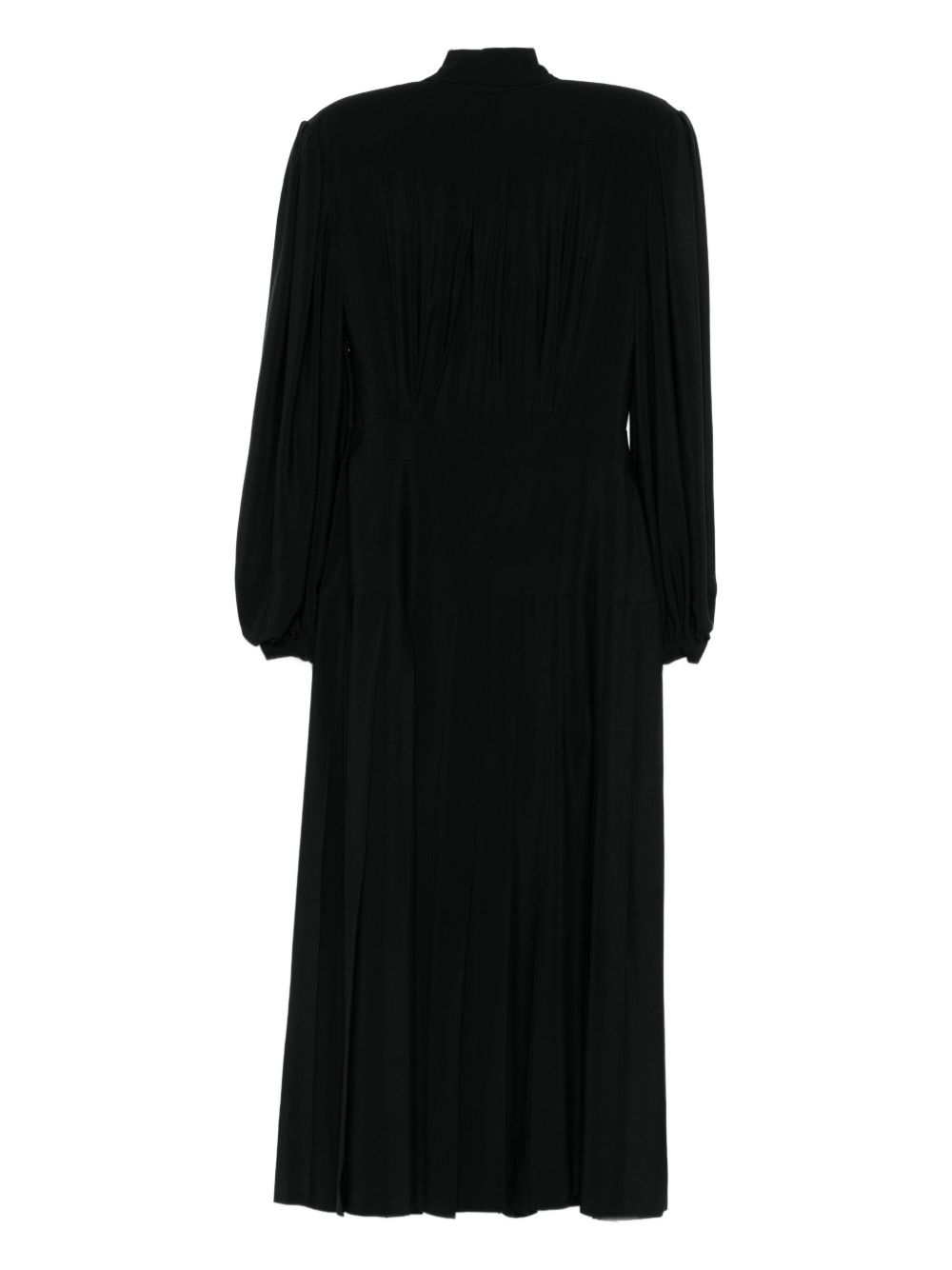 abito midi, manica lunga, polsi con arriccio e bottone, spalline, chiusura con fiocco centrale e bottoni, gonna a pieghe