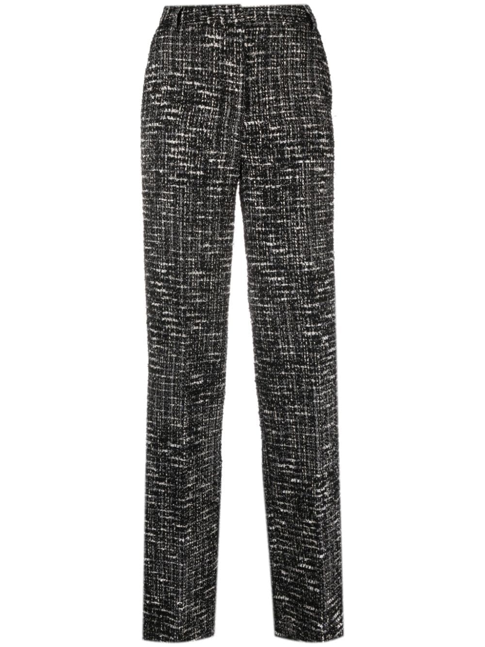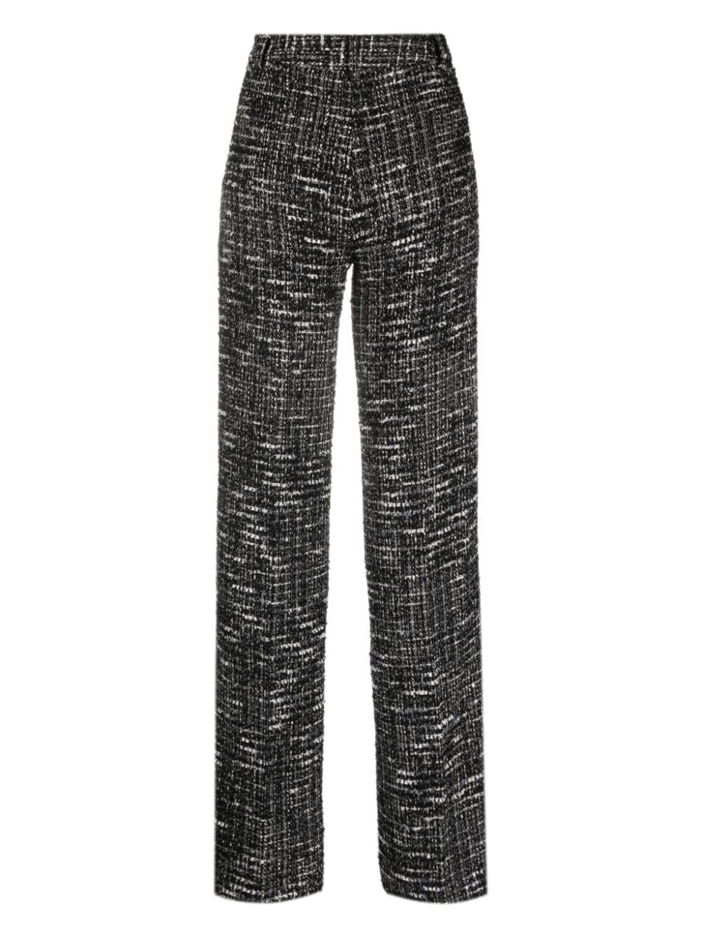 trousers, tweed fabric with silver lurex, straight leg, front closure, belt loops, side pockets