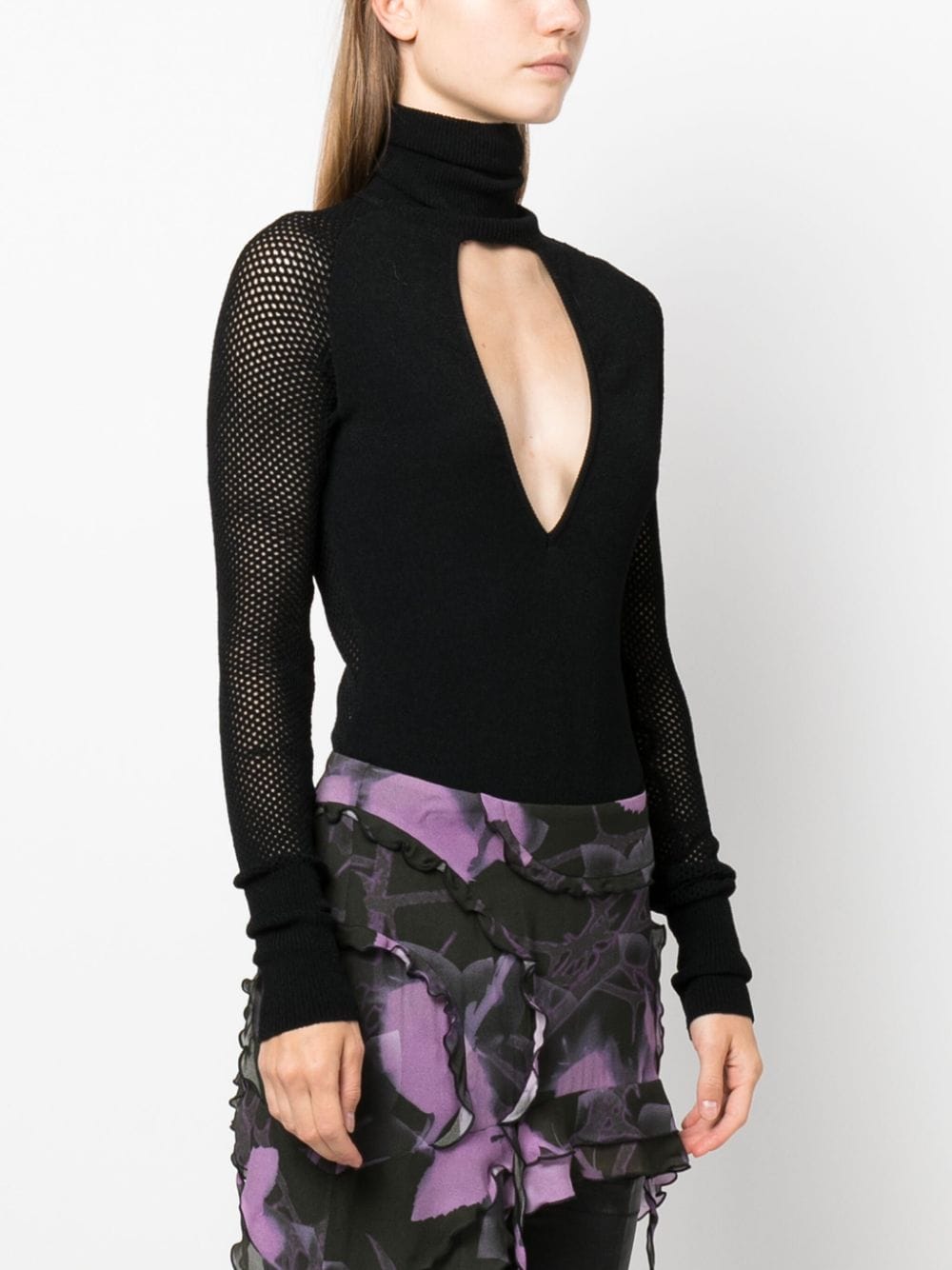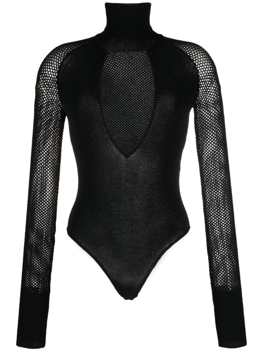 bodysuit, high neck, long sleeves, mesh jersey, front keyhole neckline