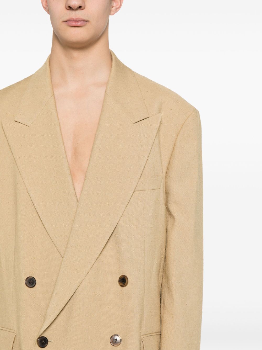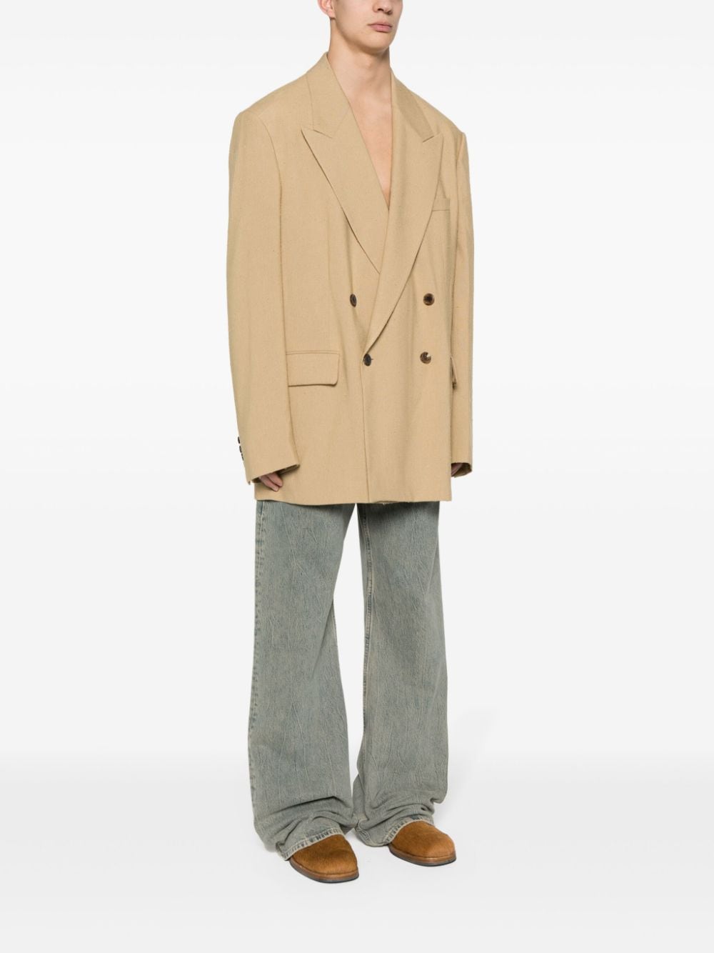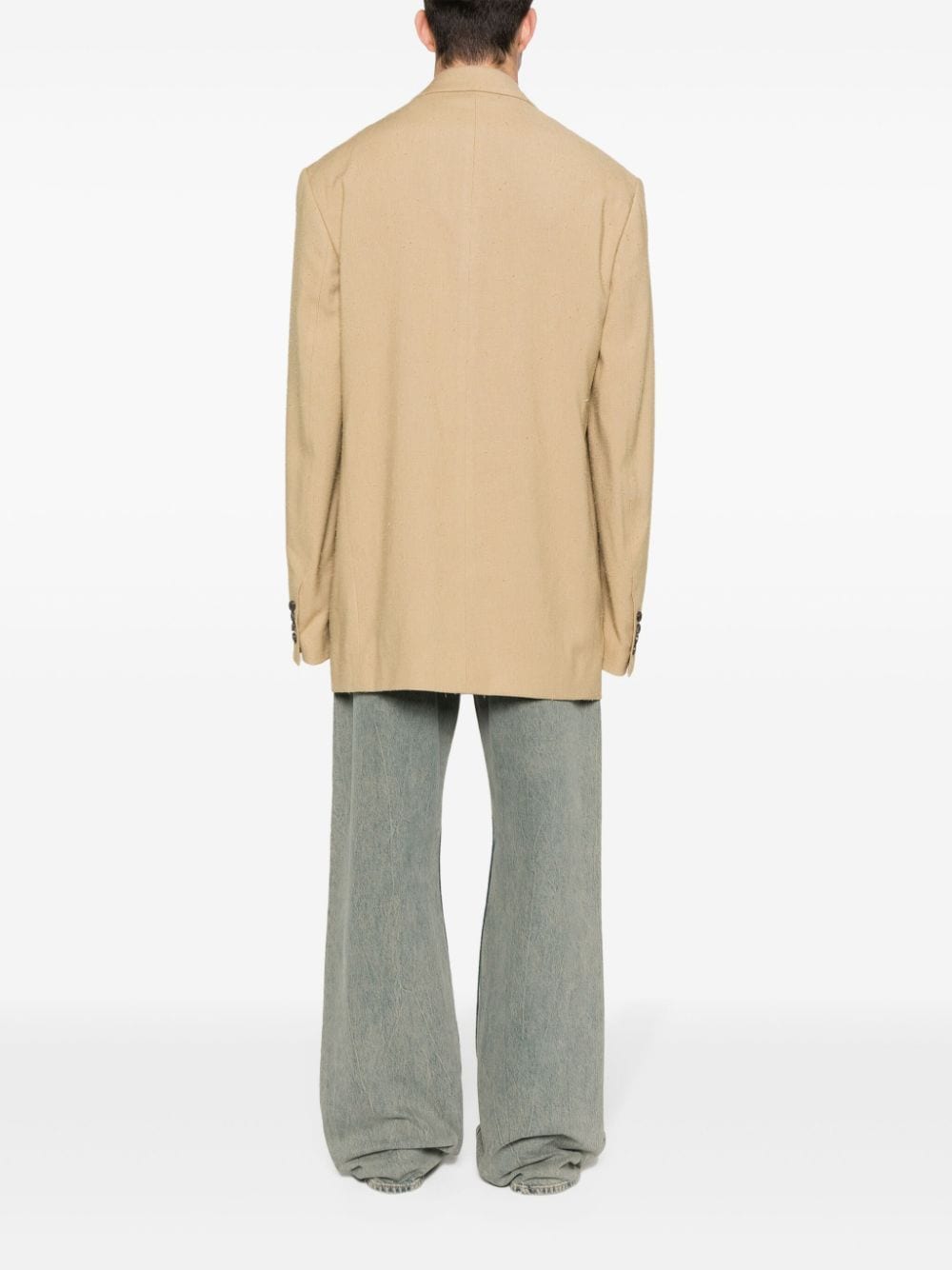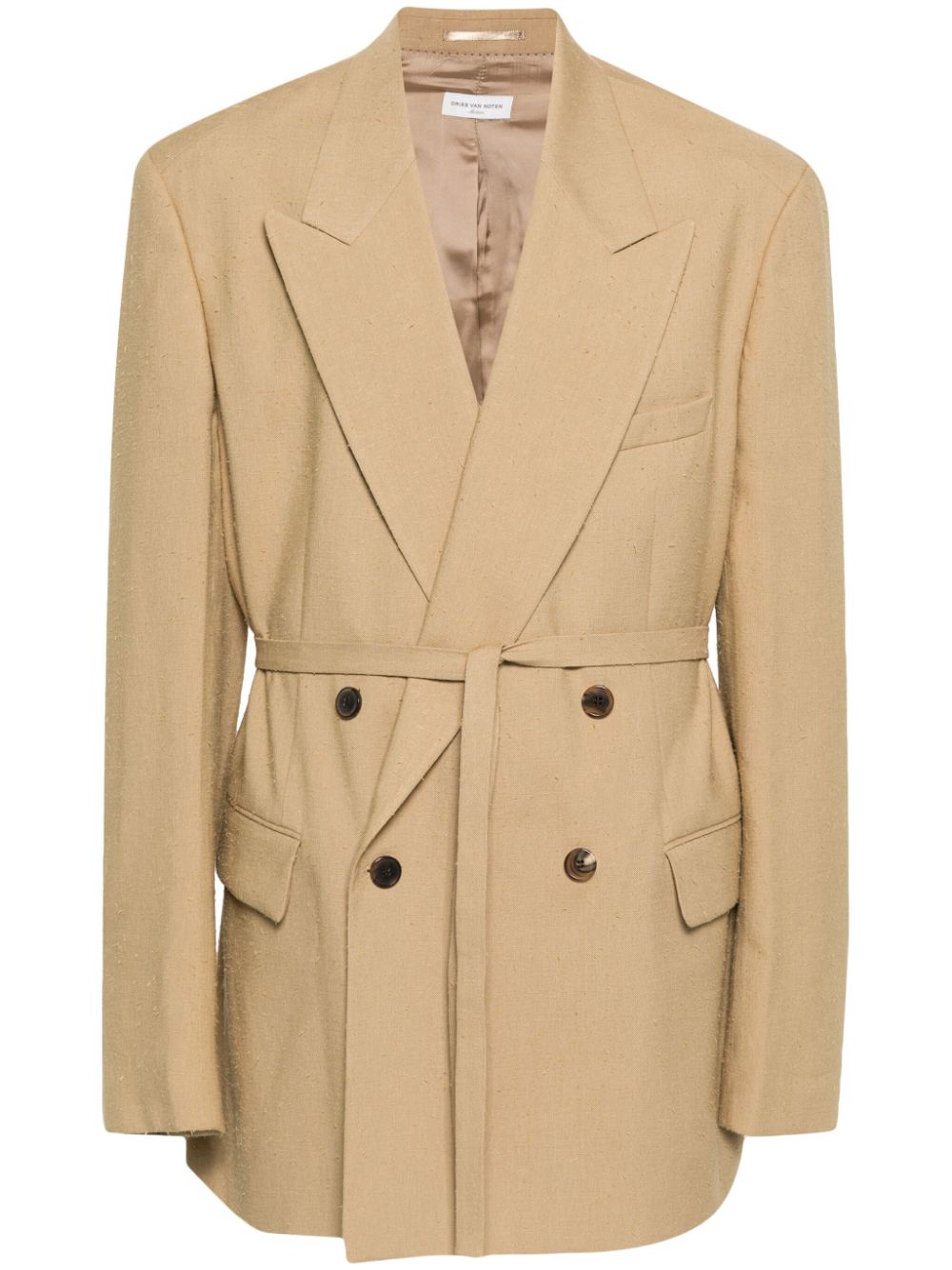 jacket, double breasted, peak lapels, loose fit, detachable belt, long sleeves, button closure, flap pockets, internal pockets