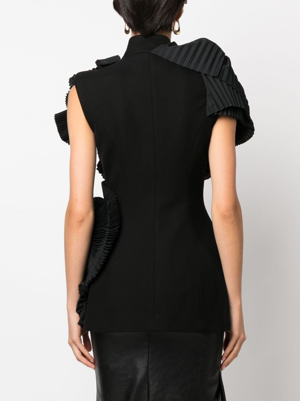 jacket, piqué fabric, collar with piping, fastening with hooks, sleeveless, rouches sewn with pleated fabric, flap pockets, lined
