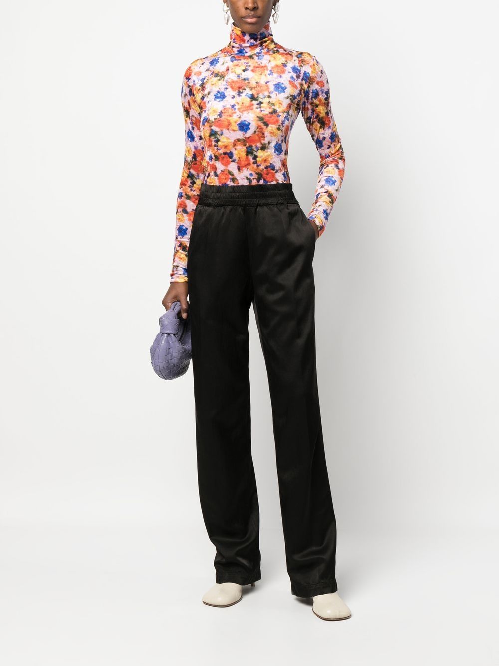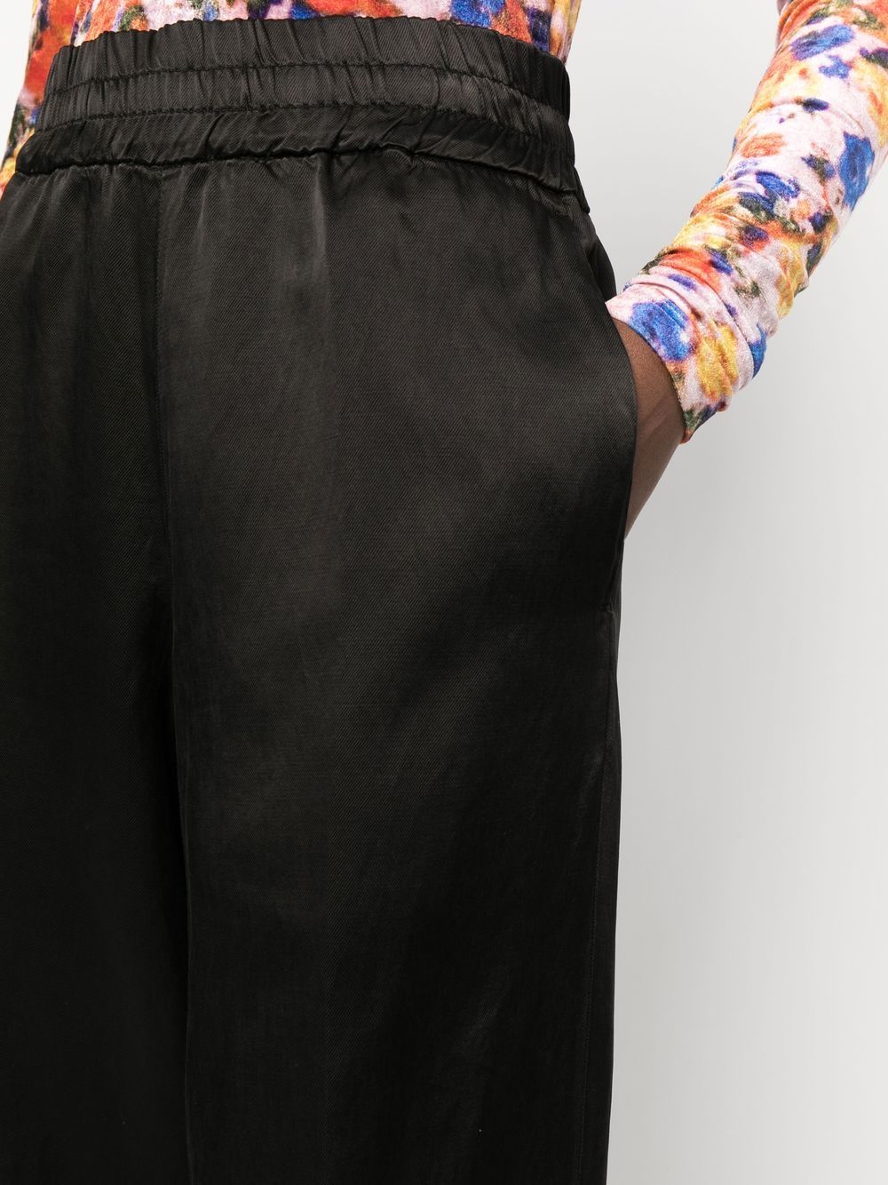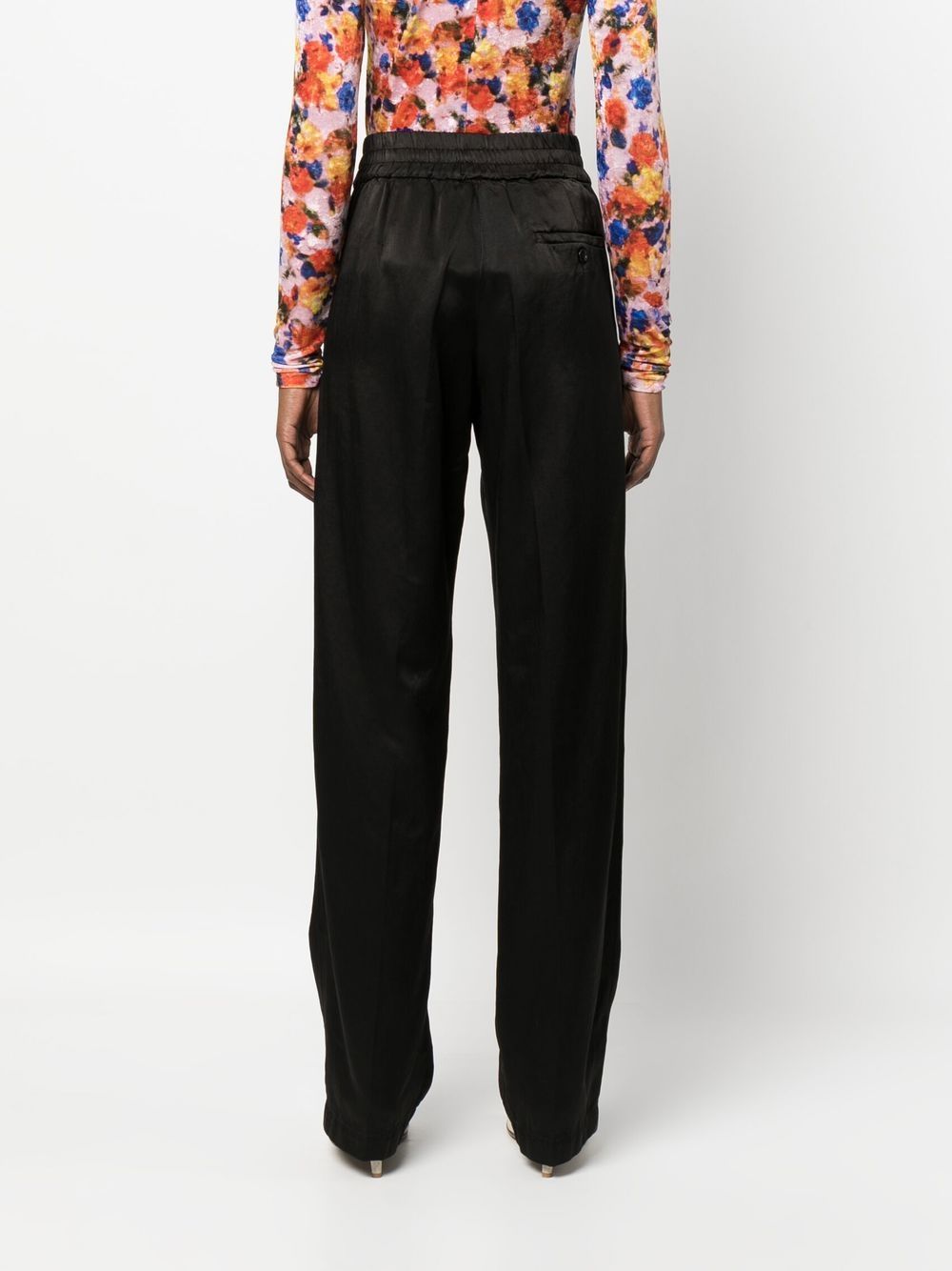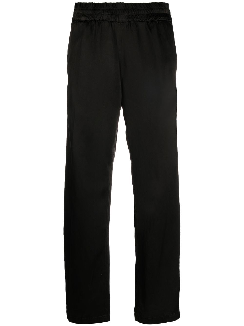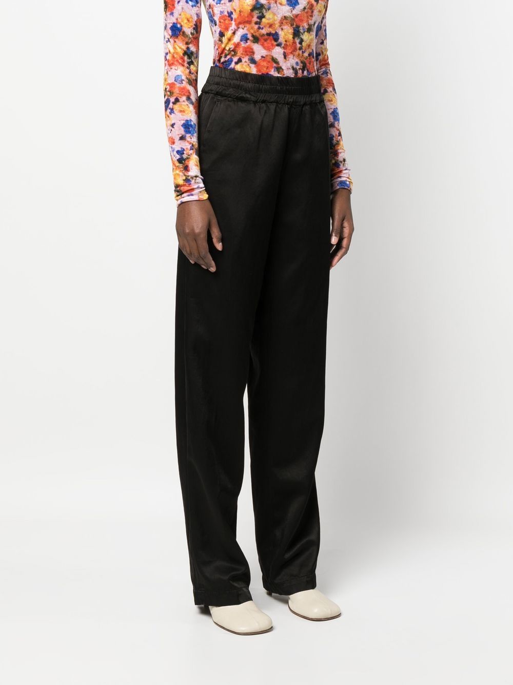 trousers, elasticated waist, internal drawstring, pockets, straight leg, washed satin