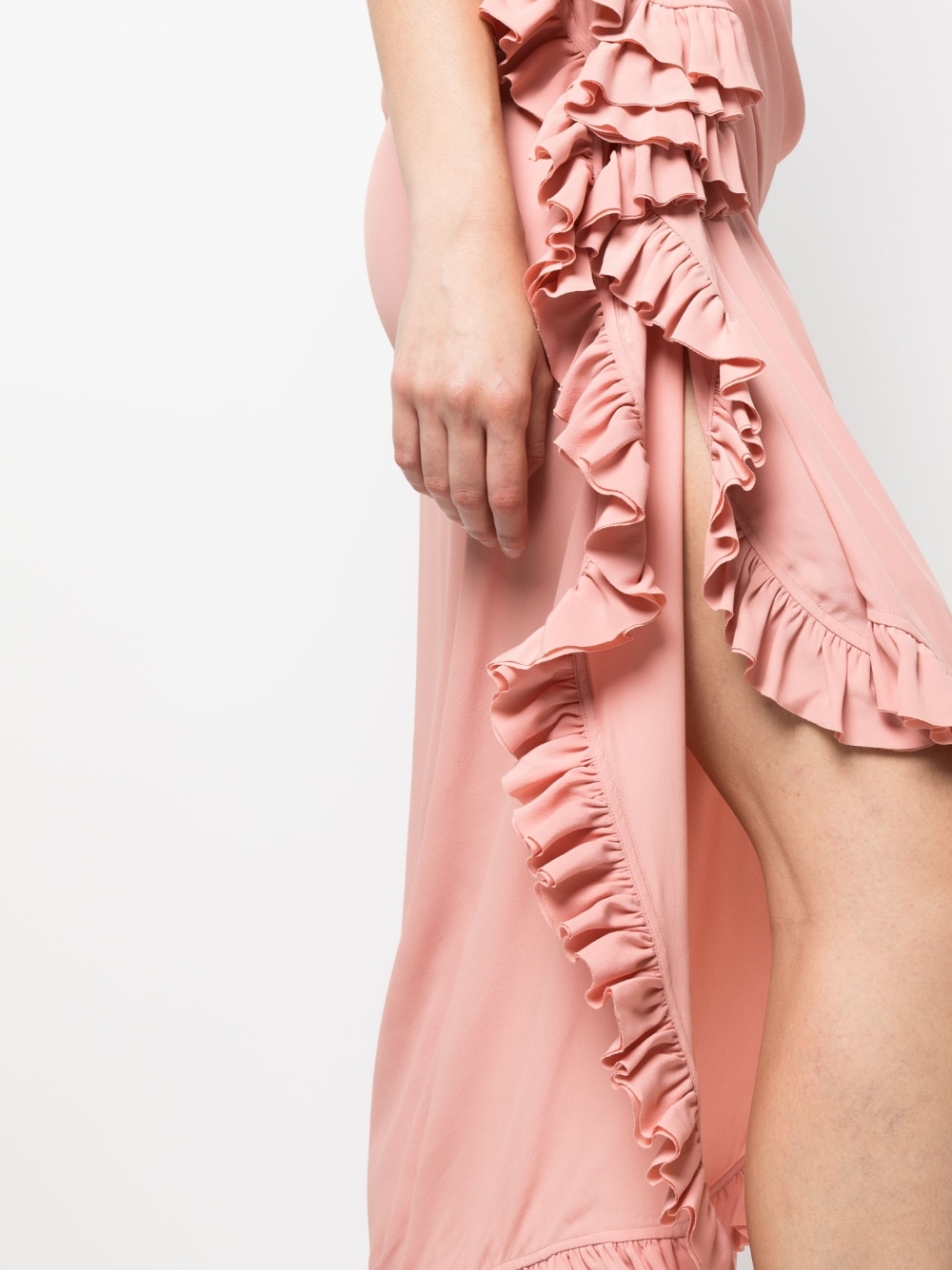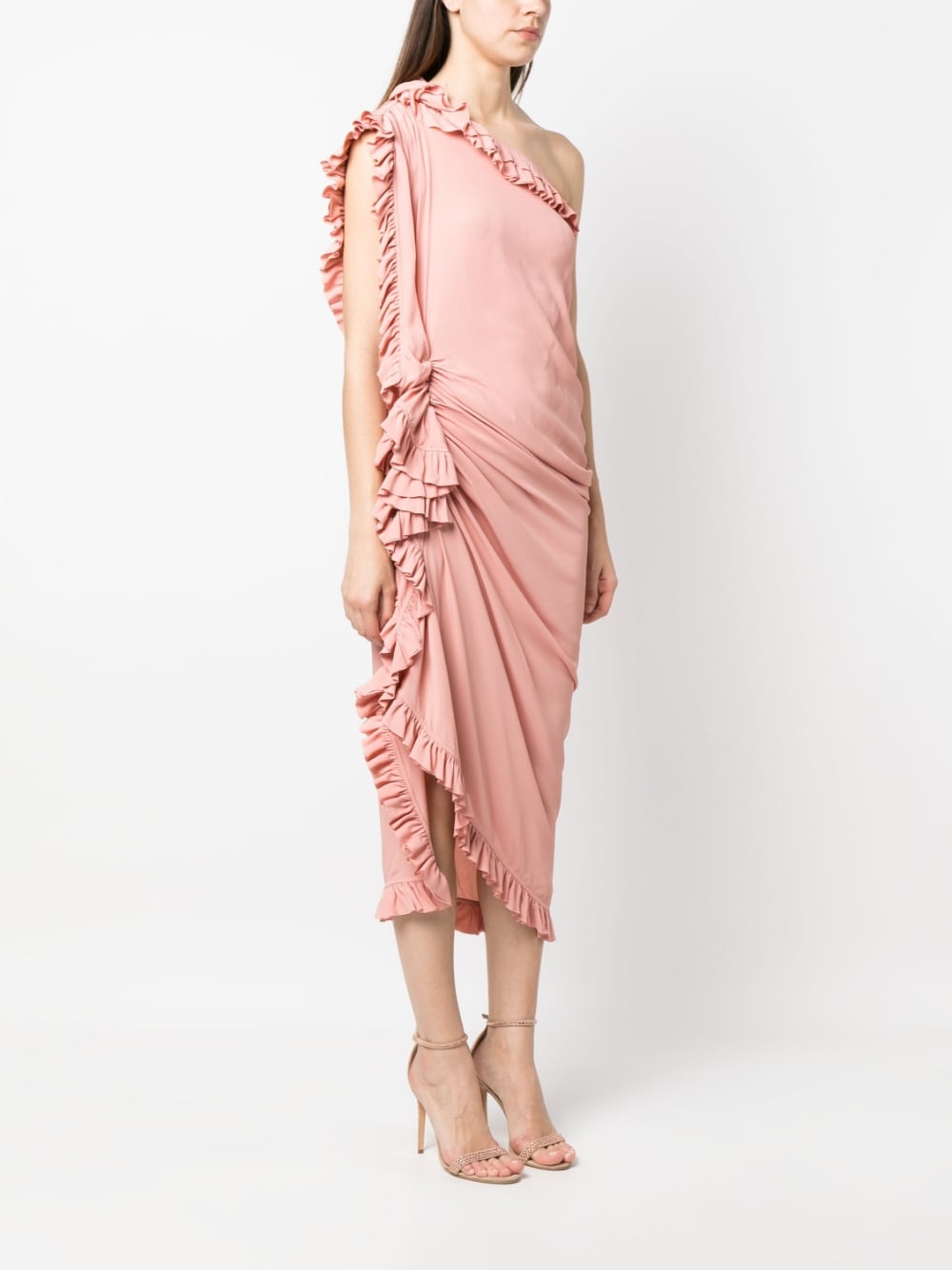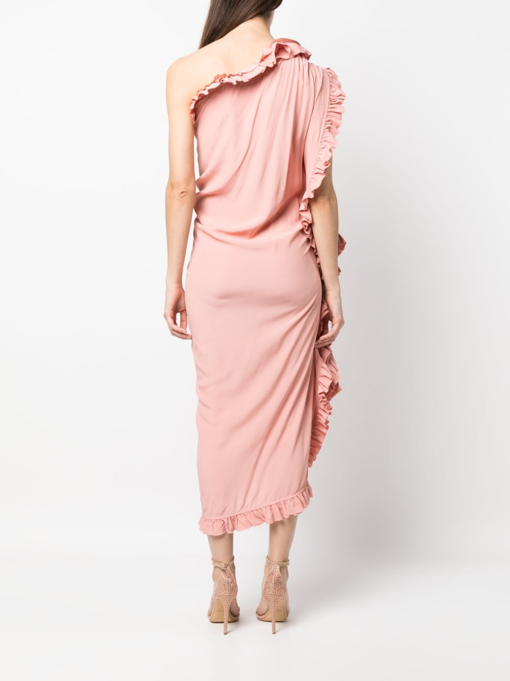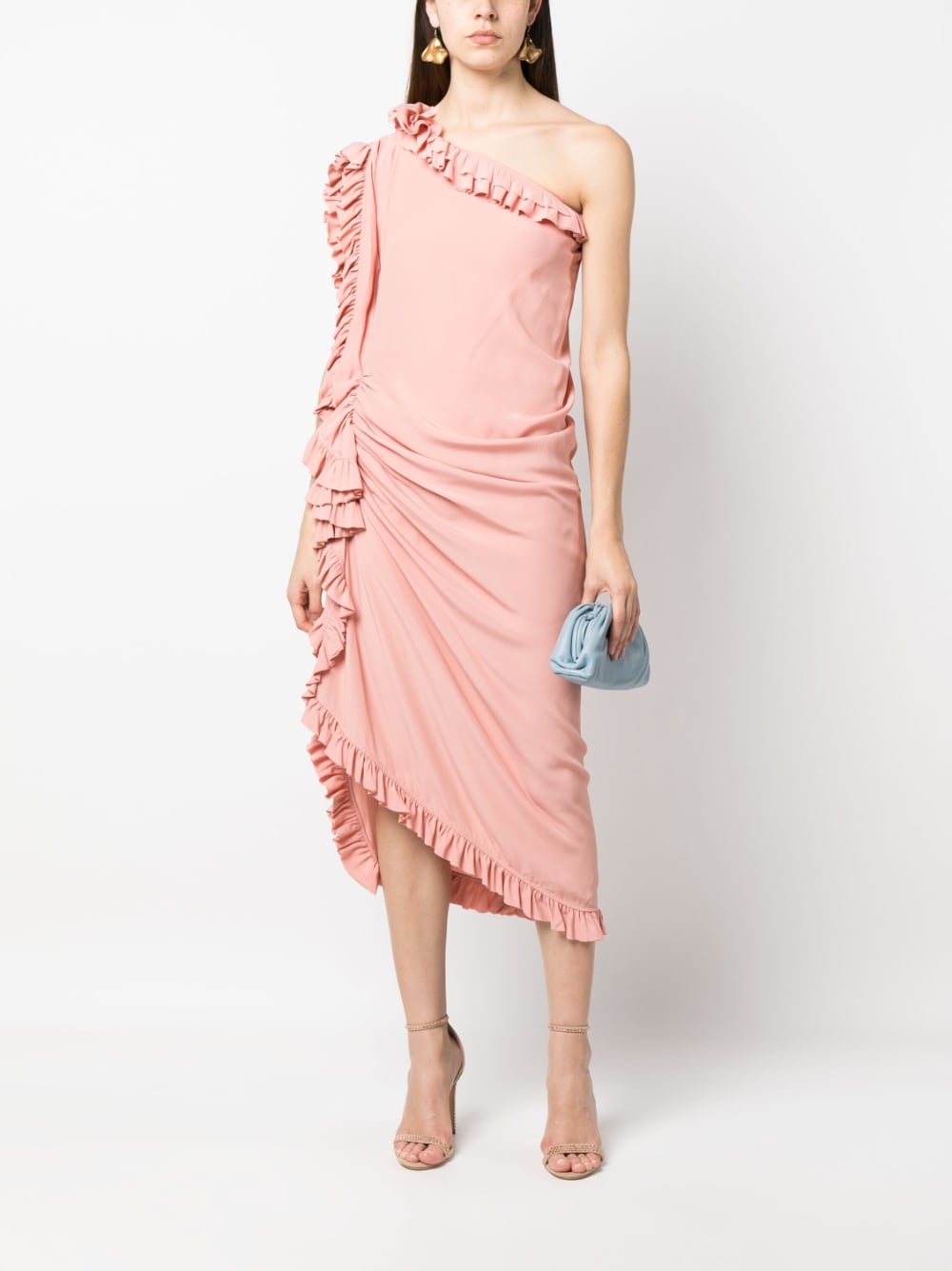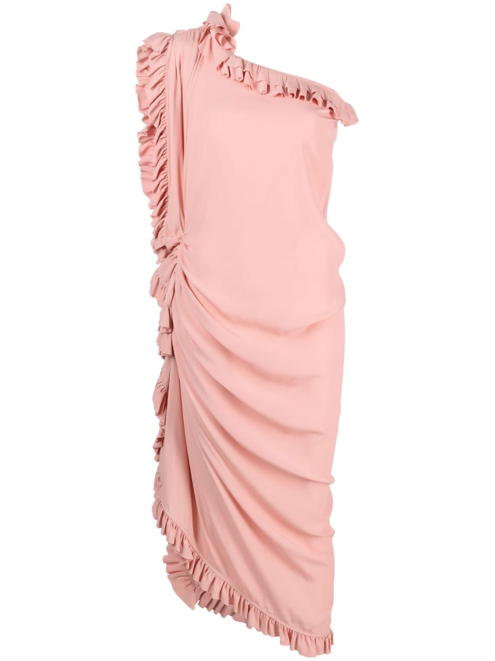 one-shoulder dress, side ruffles, draped, unlined, sleeveless