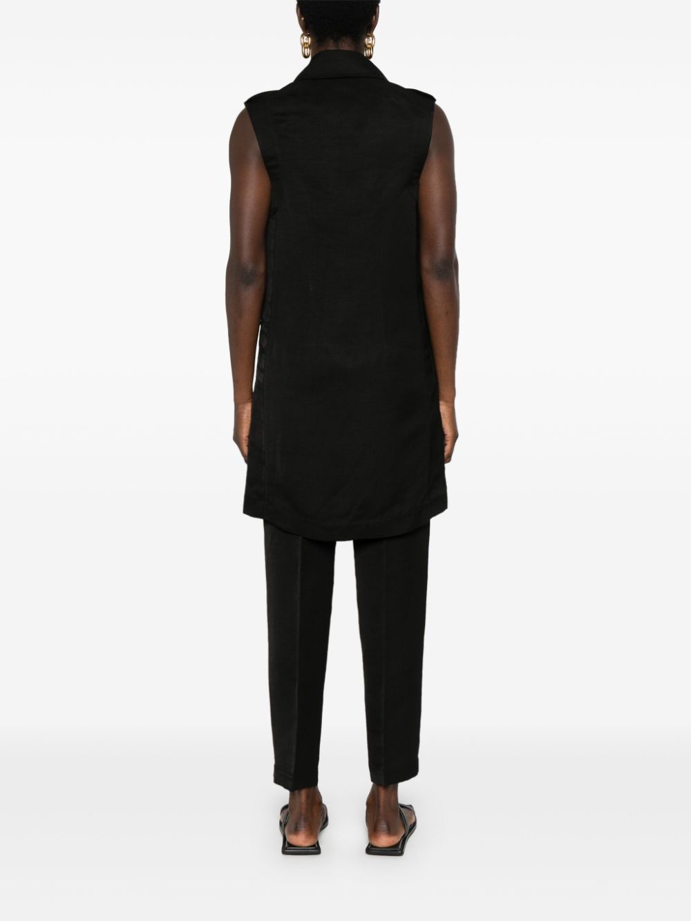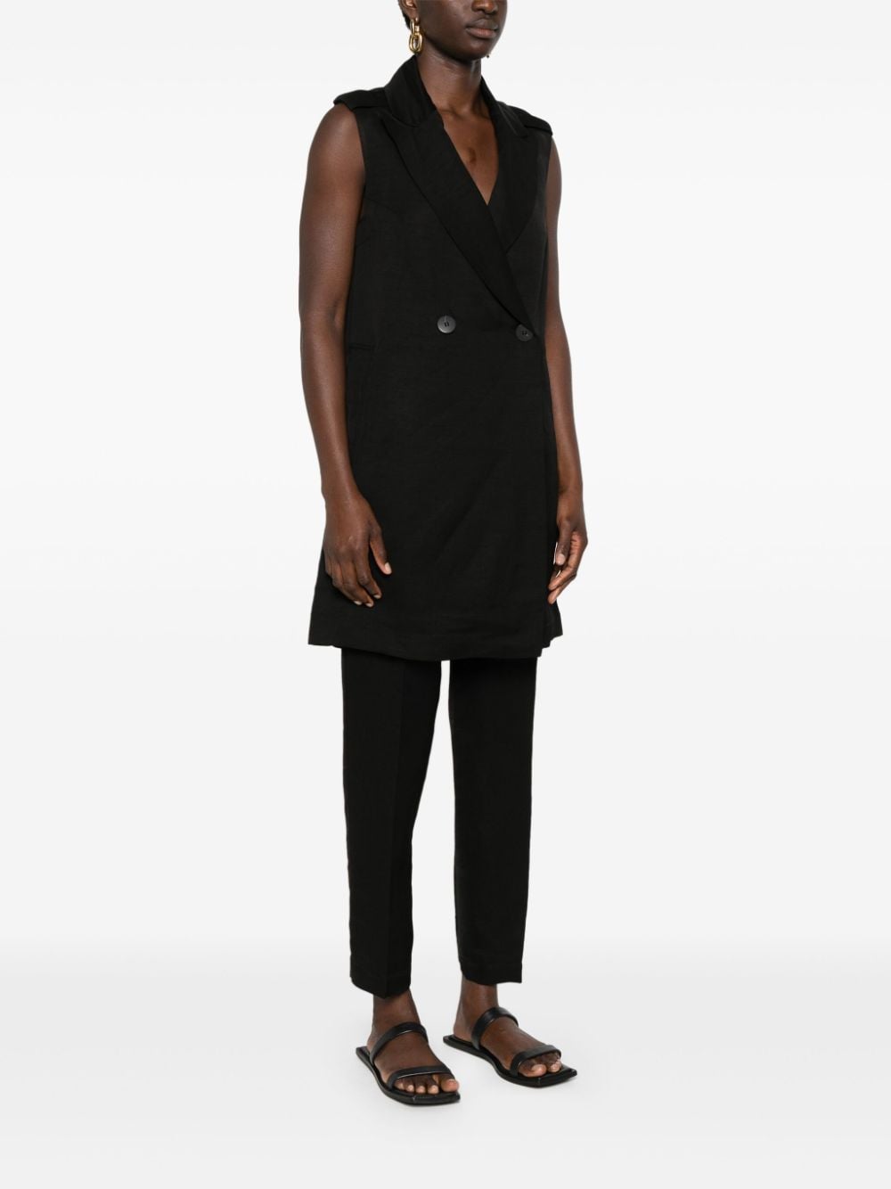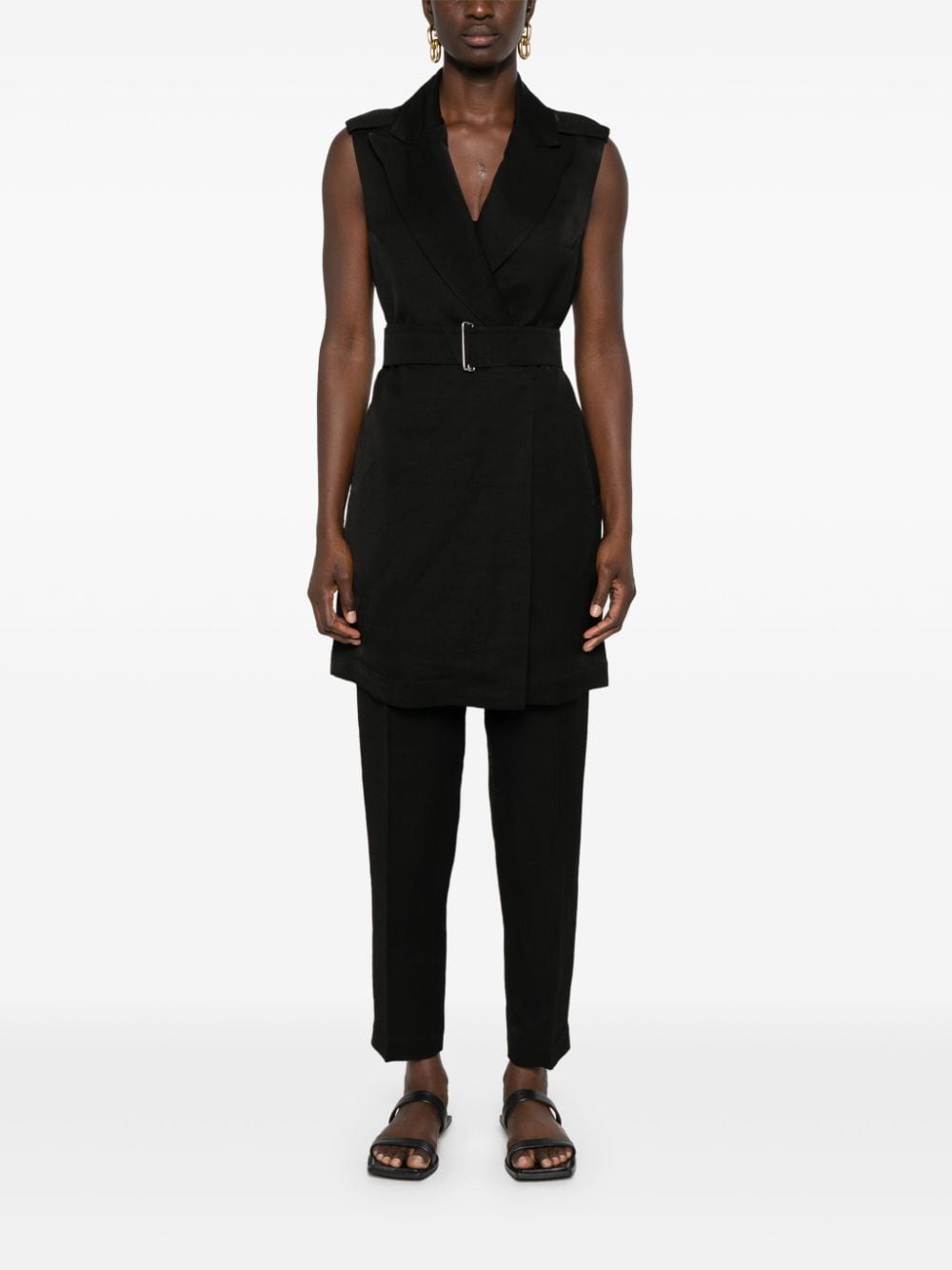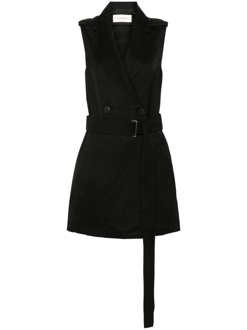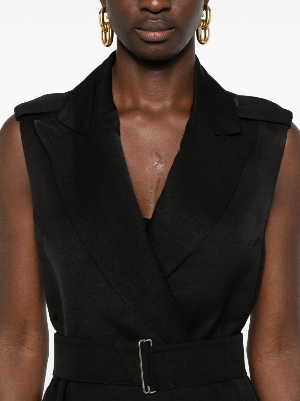 vest, double breasted, sleeveless, button closure, removable belt, belt loops, welt pockets, peak lapels, shoulder pads, unlined