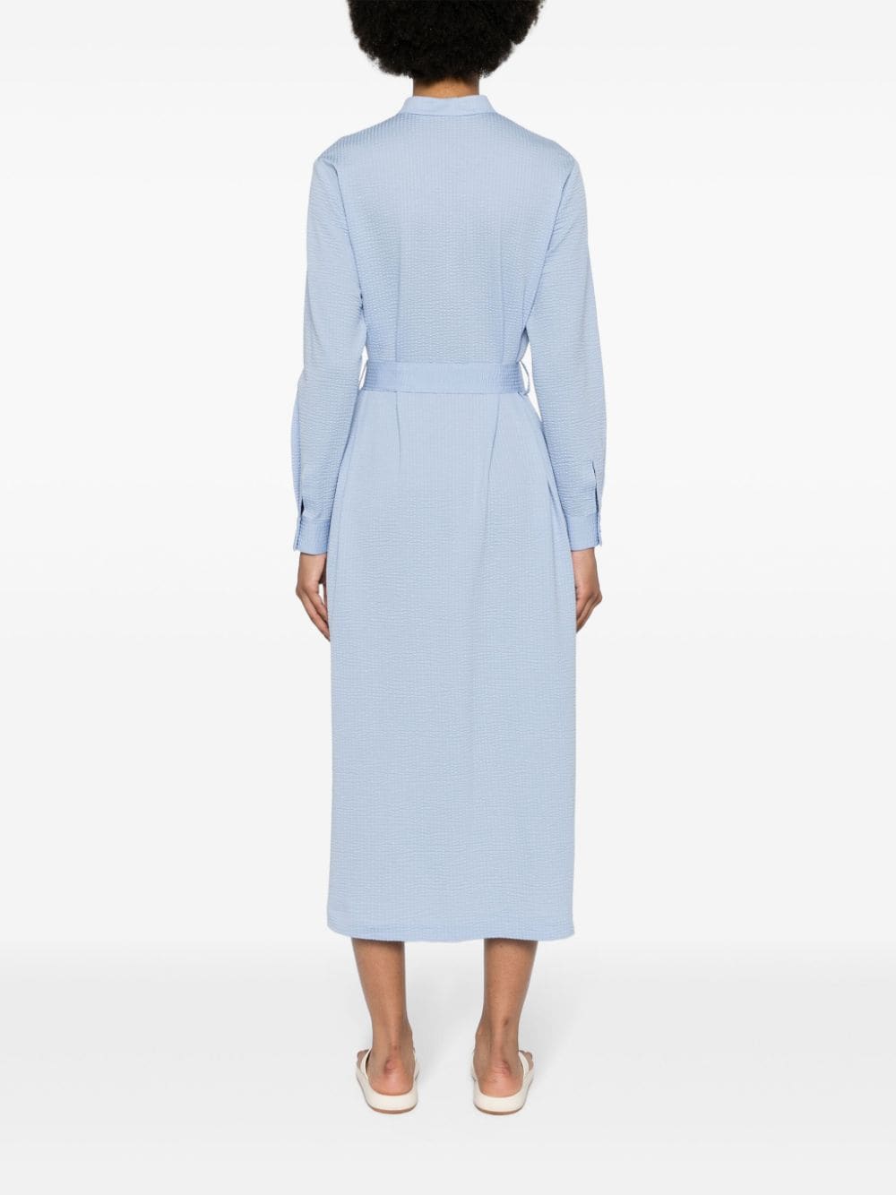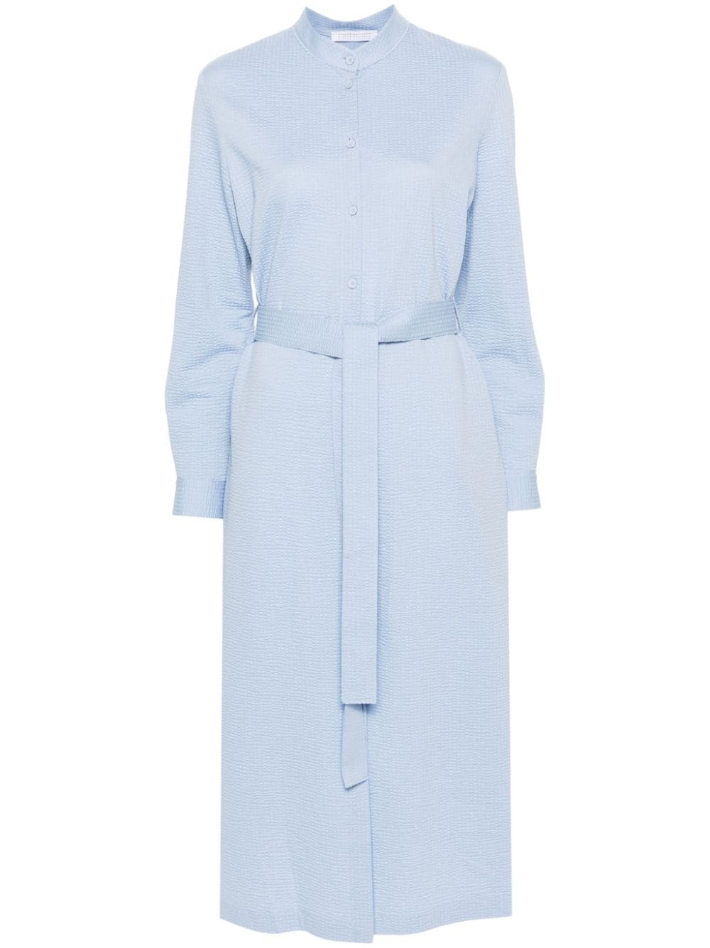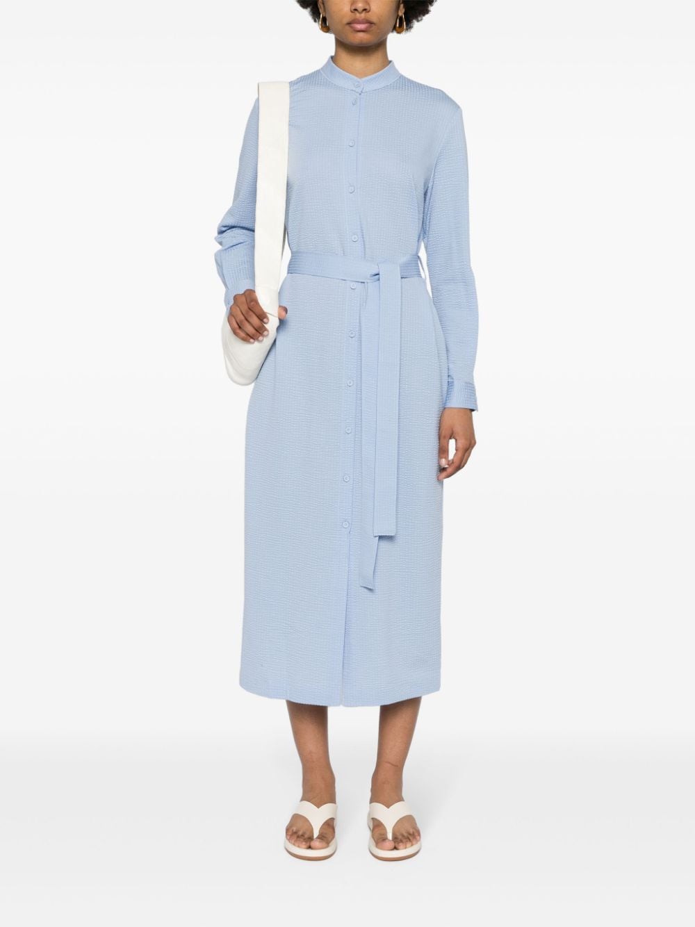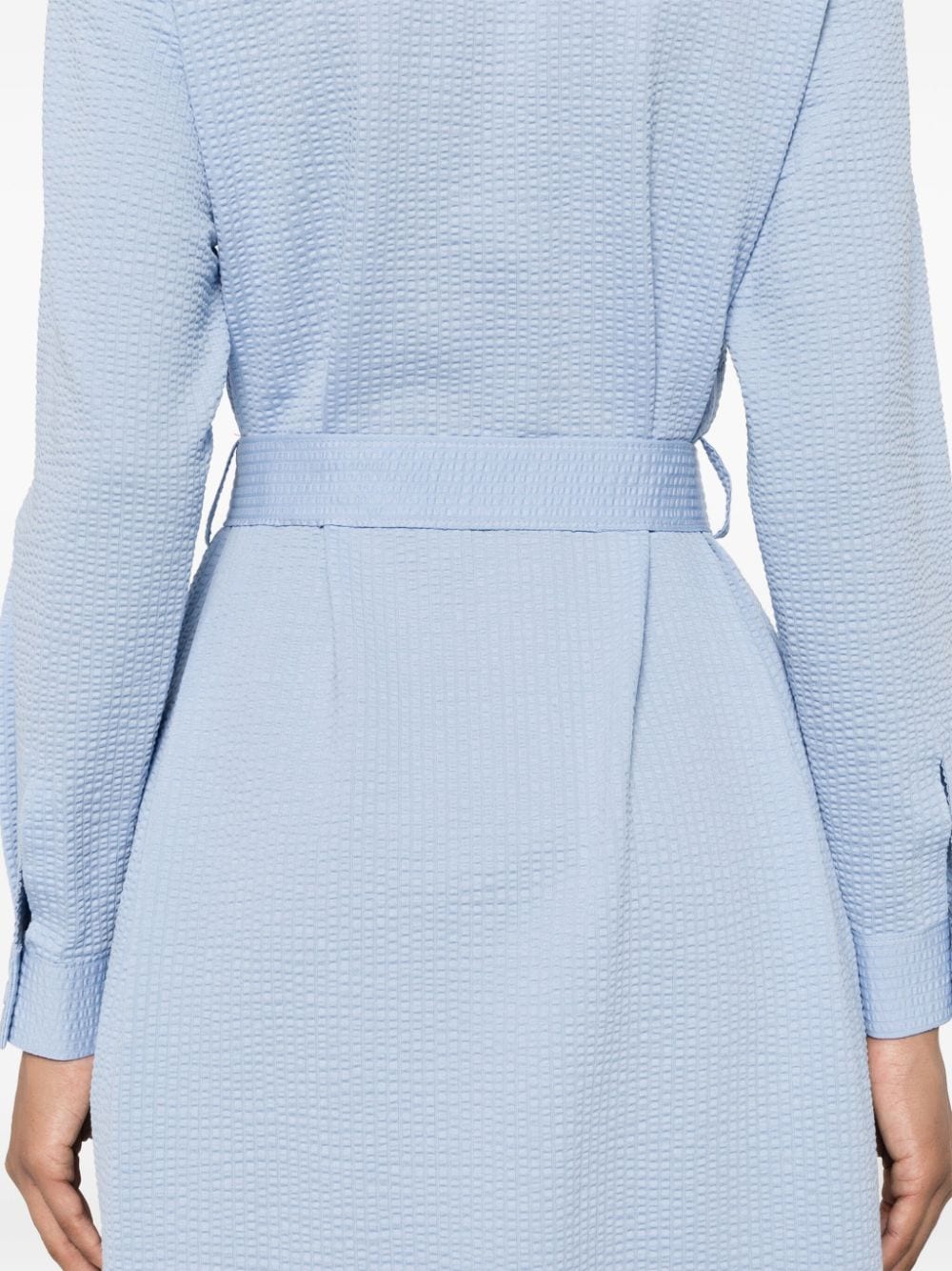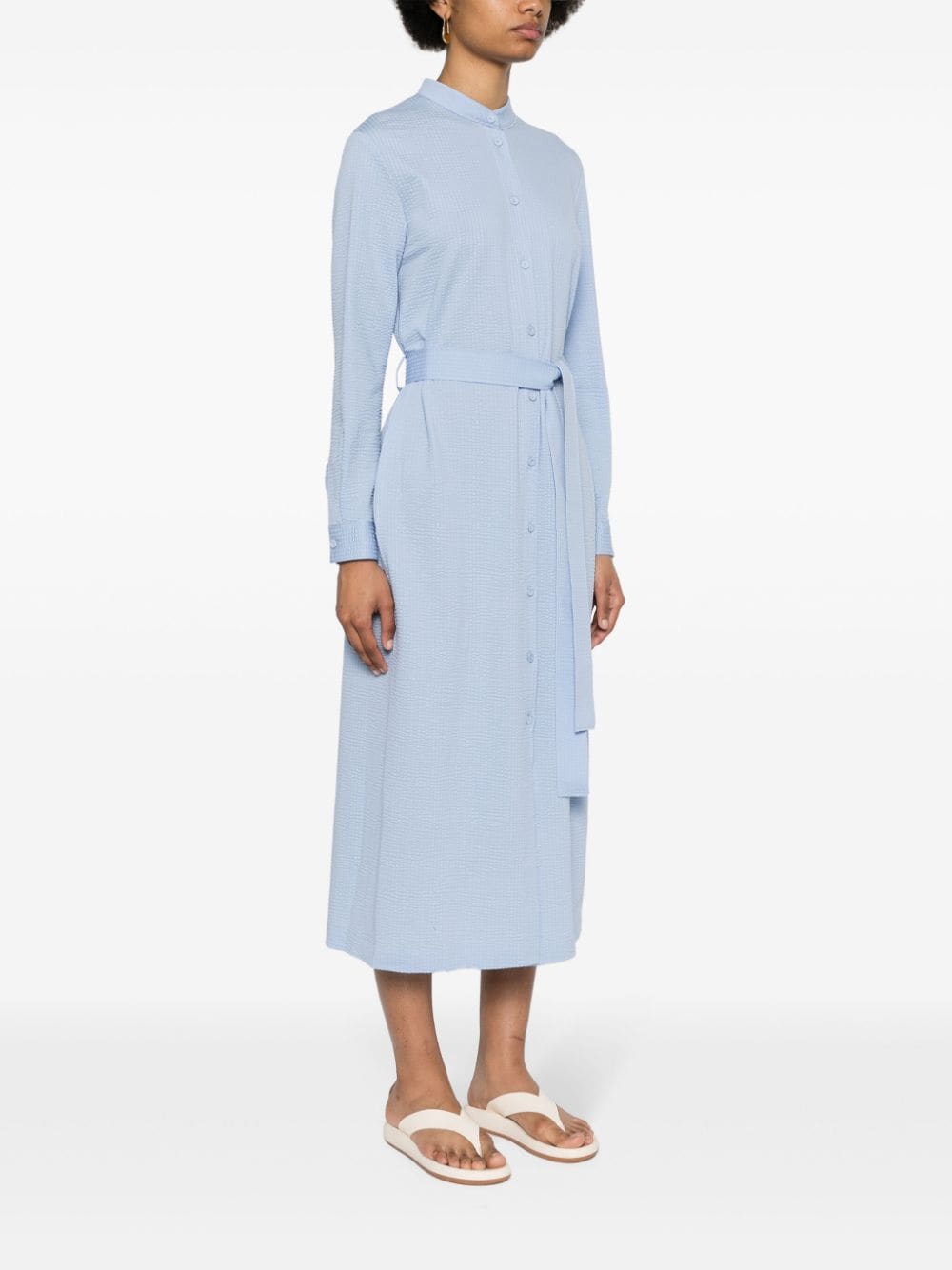 dress, seersucker fabric, mandarin collar, button closure, removable belt with loops, long sleeves with cuff and button, side pockets Composition: 65% cotton 35% polyester Washing instructions: dry clean