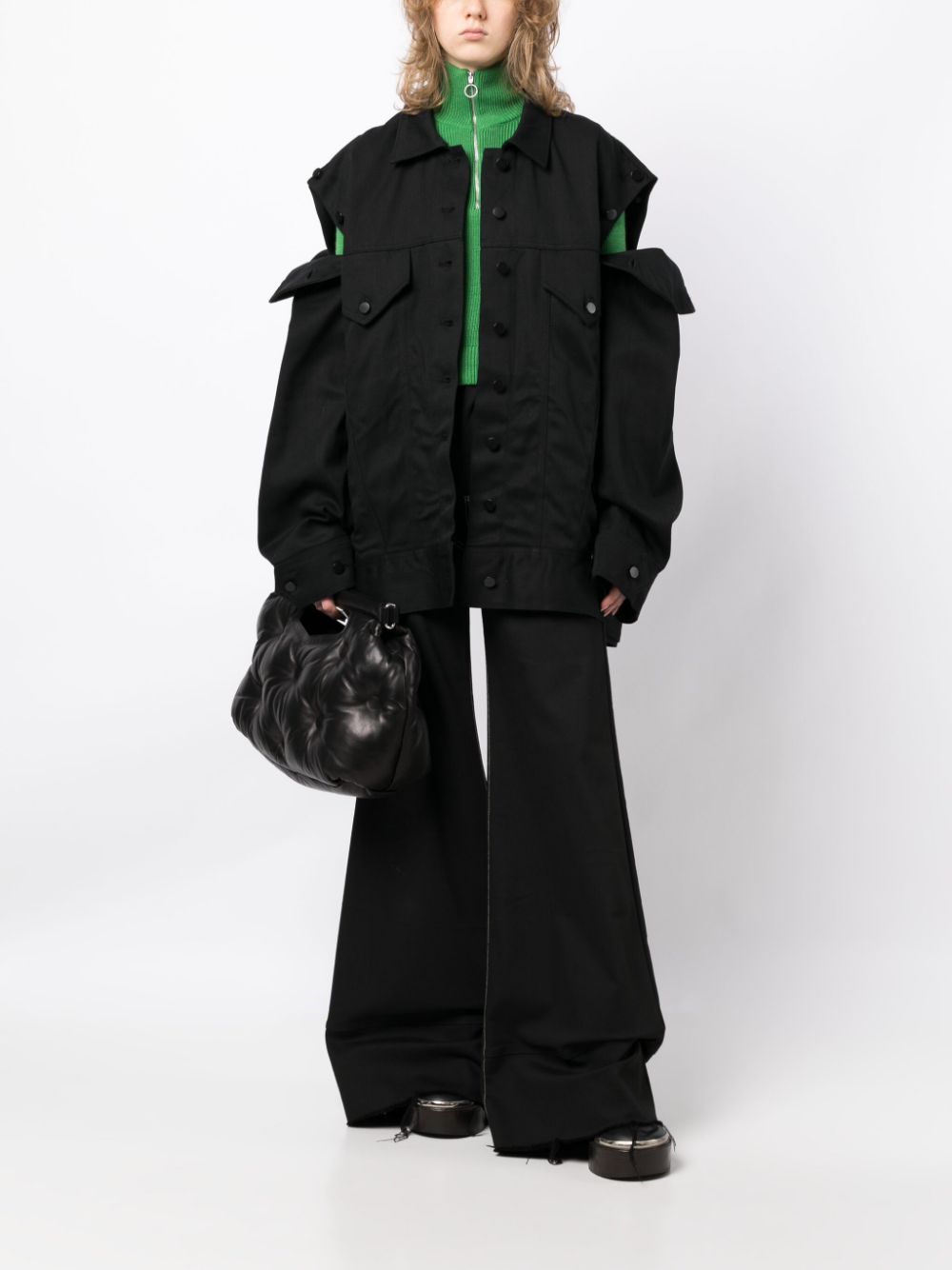 jacket, oversize, denim, collar, buttons, side pockets, front pockets with flap and button, long sleeves, cuff with adjustable strap, back logo, bottom with adjustable strap Composition: 100% cotton Washing instructions: wash at 40°