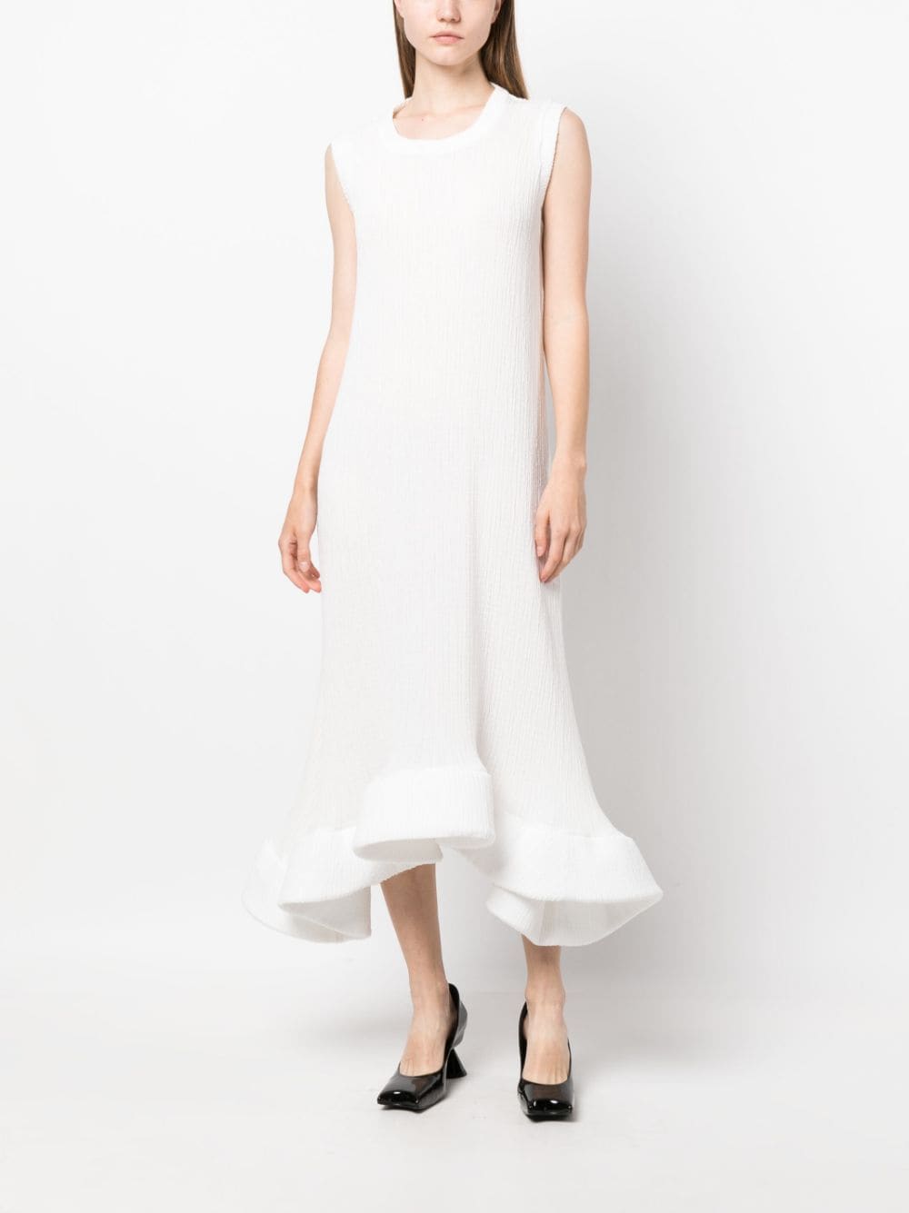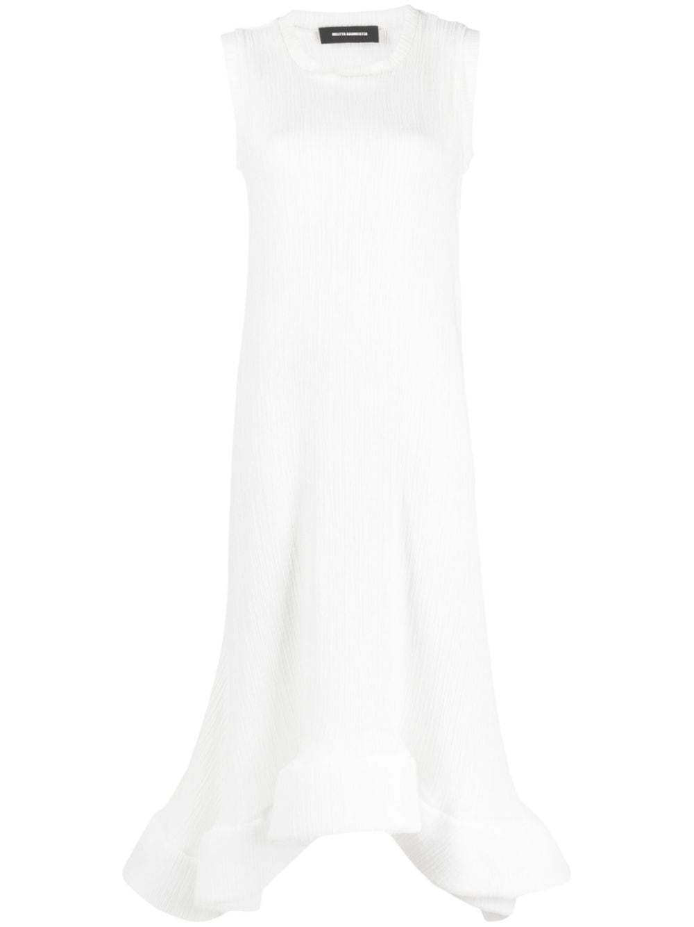 midi dress, round neck, sleeveless, ruched fabric, wavy padded bottom