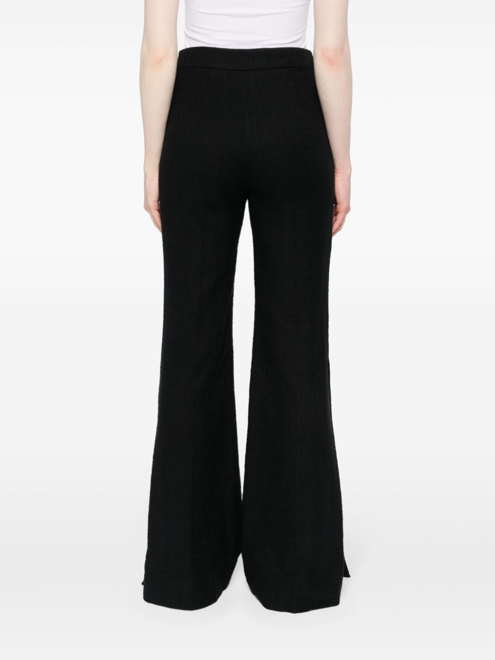 trousers, bourette fabric, front fake pockets, straight leg with flared bottom, golden buttons on the bottom of the leg, button and zip closure Composition: 97% cotton 2% polyamide 1% elastane Washing instructions: dry clean