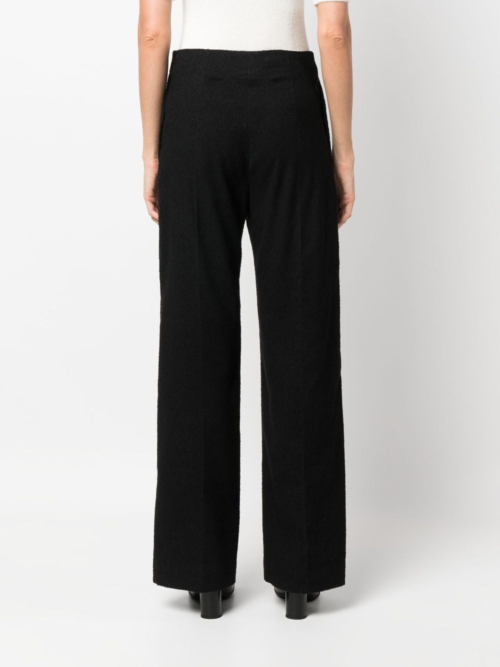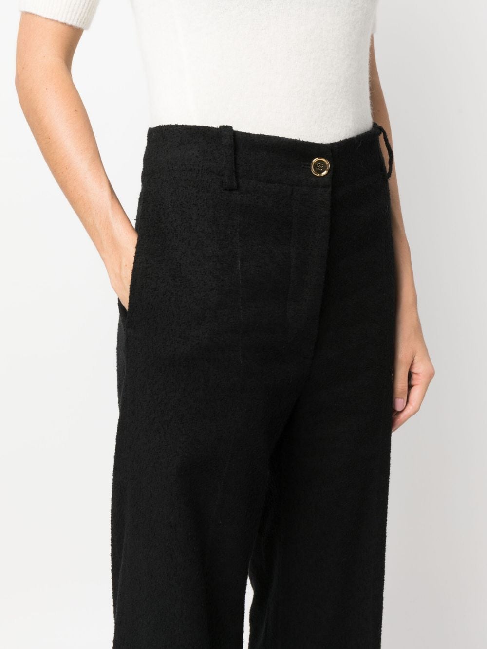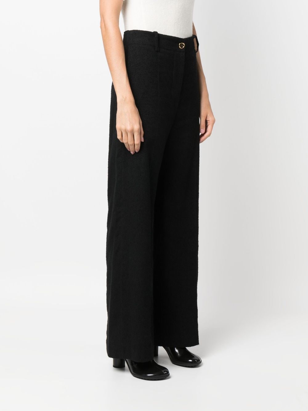 trousers, high waist, wide leg, pockets, belt loops, button fastening