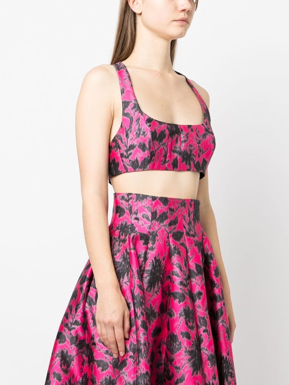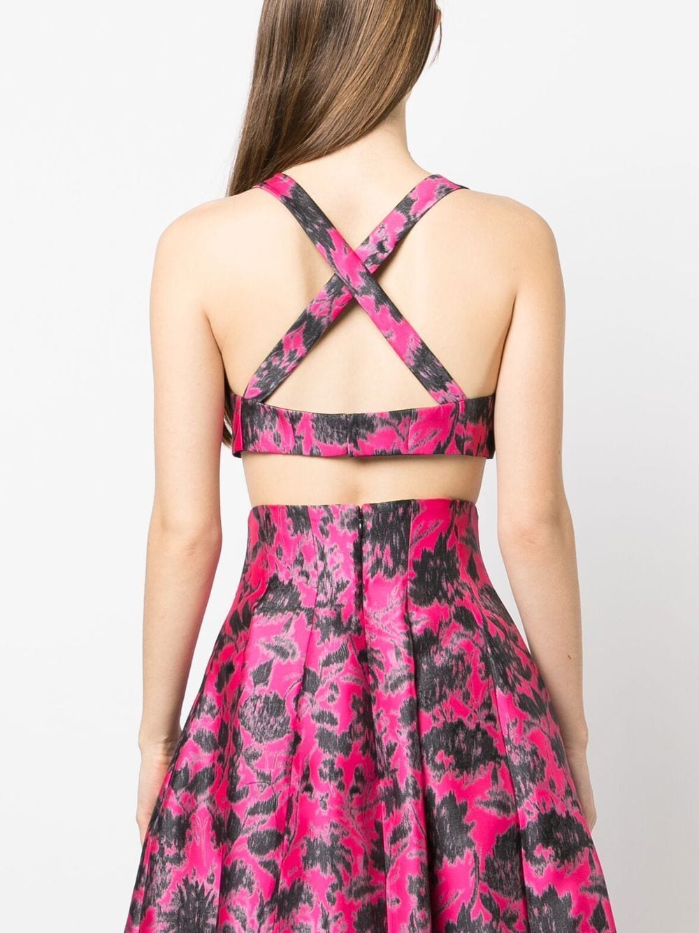 short top, crossed straps, fabric with floral pattern, lined, hook and eye closure Composition: 100% polyester Washing instructions: hand wash or dry clean