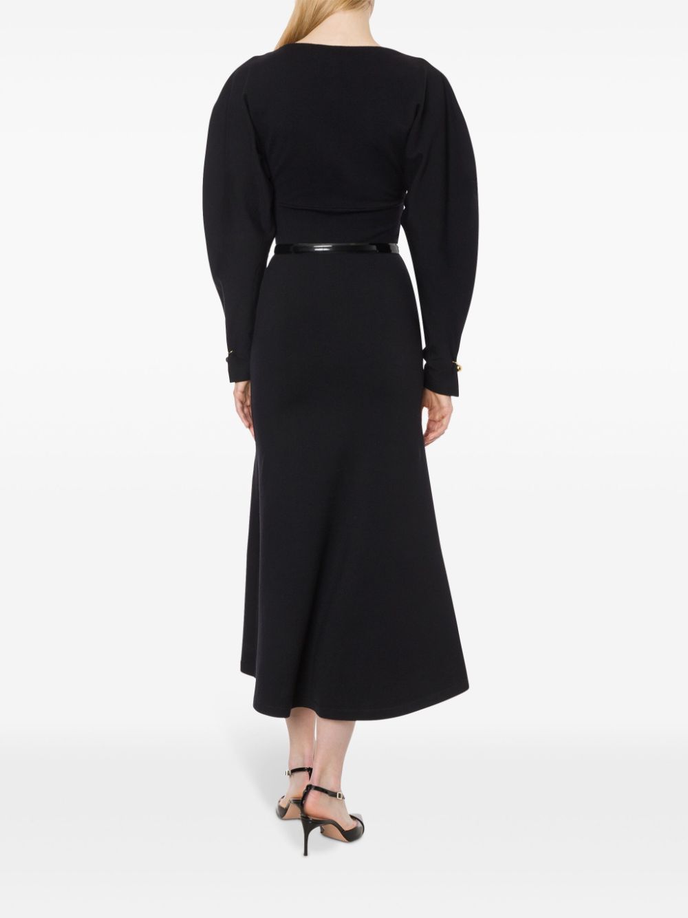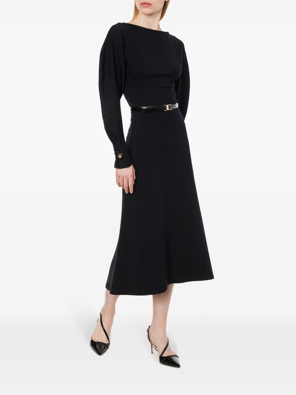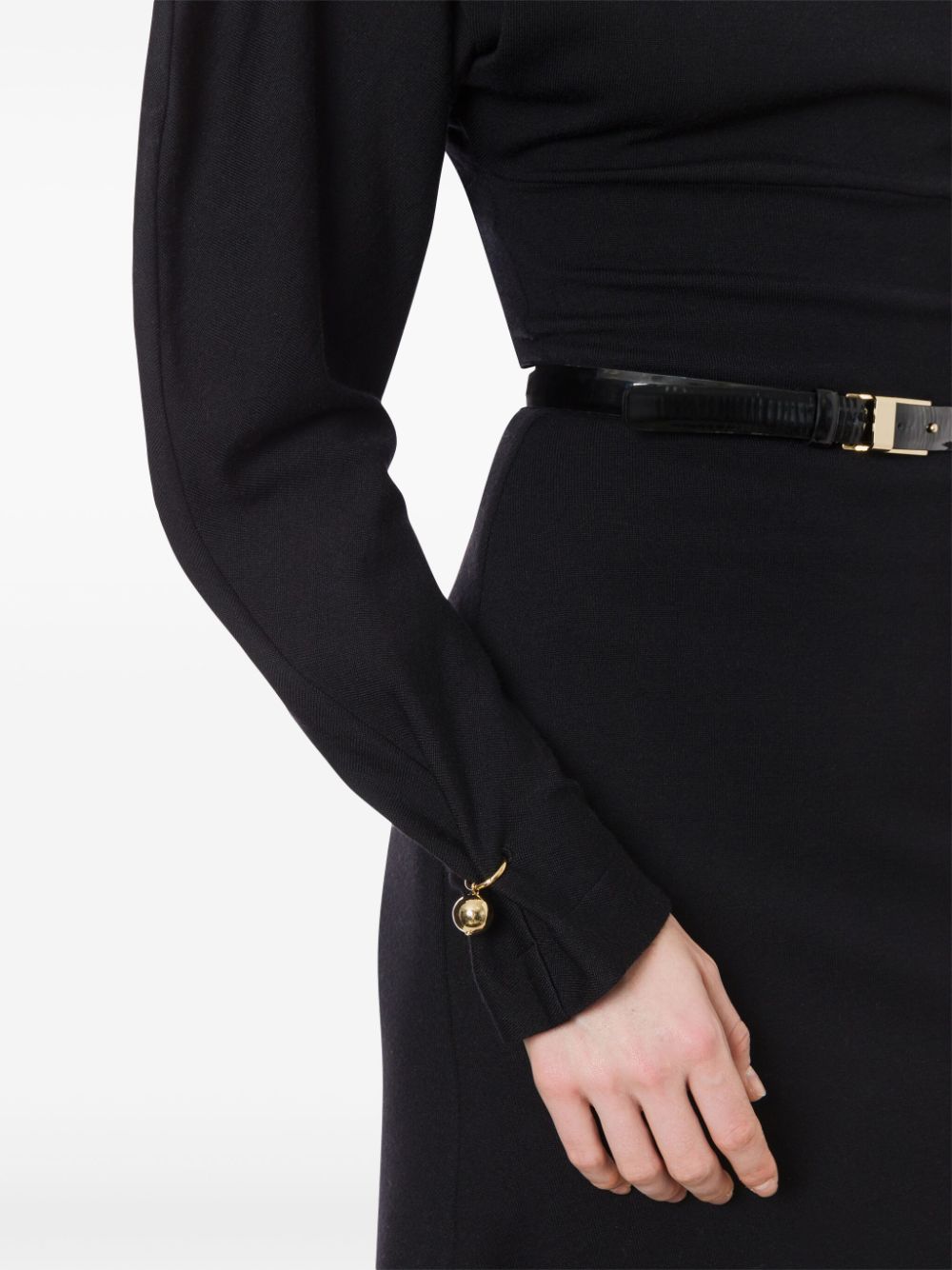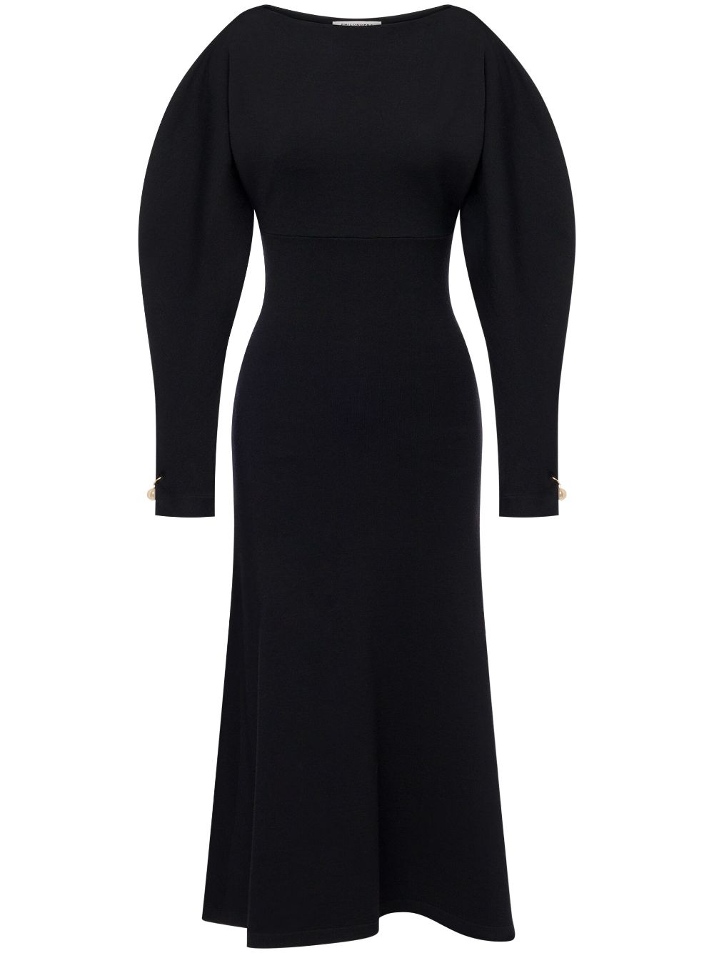 dress, sweater, boat neckline, wide sleeve, cuff stapled with gold piercing, flared bottom