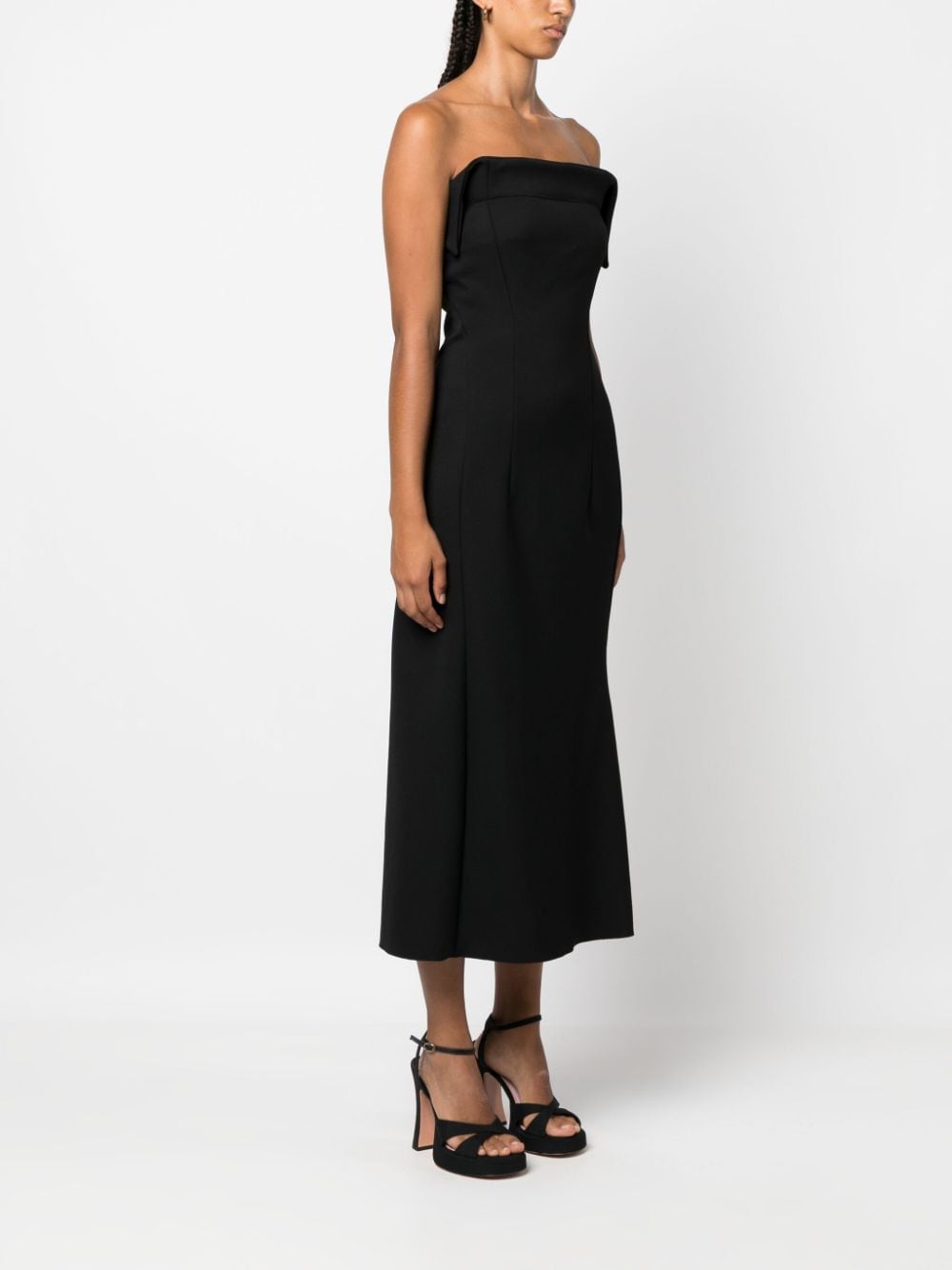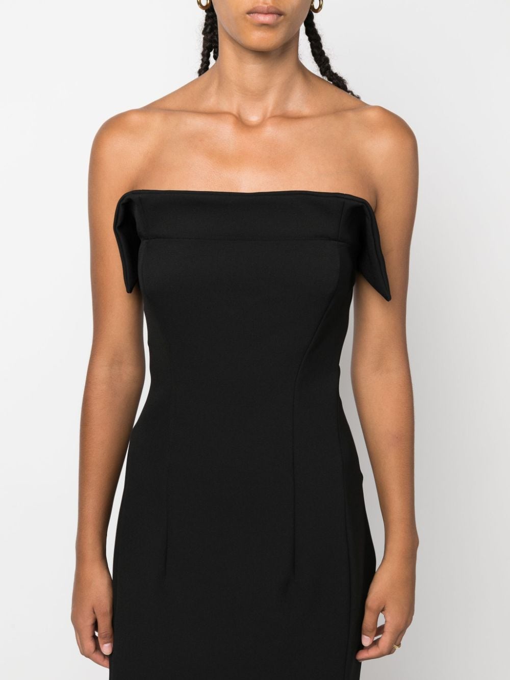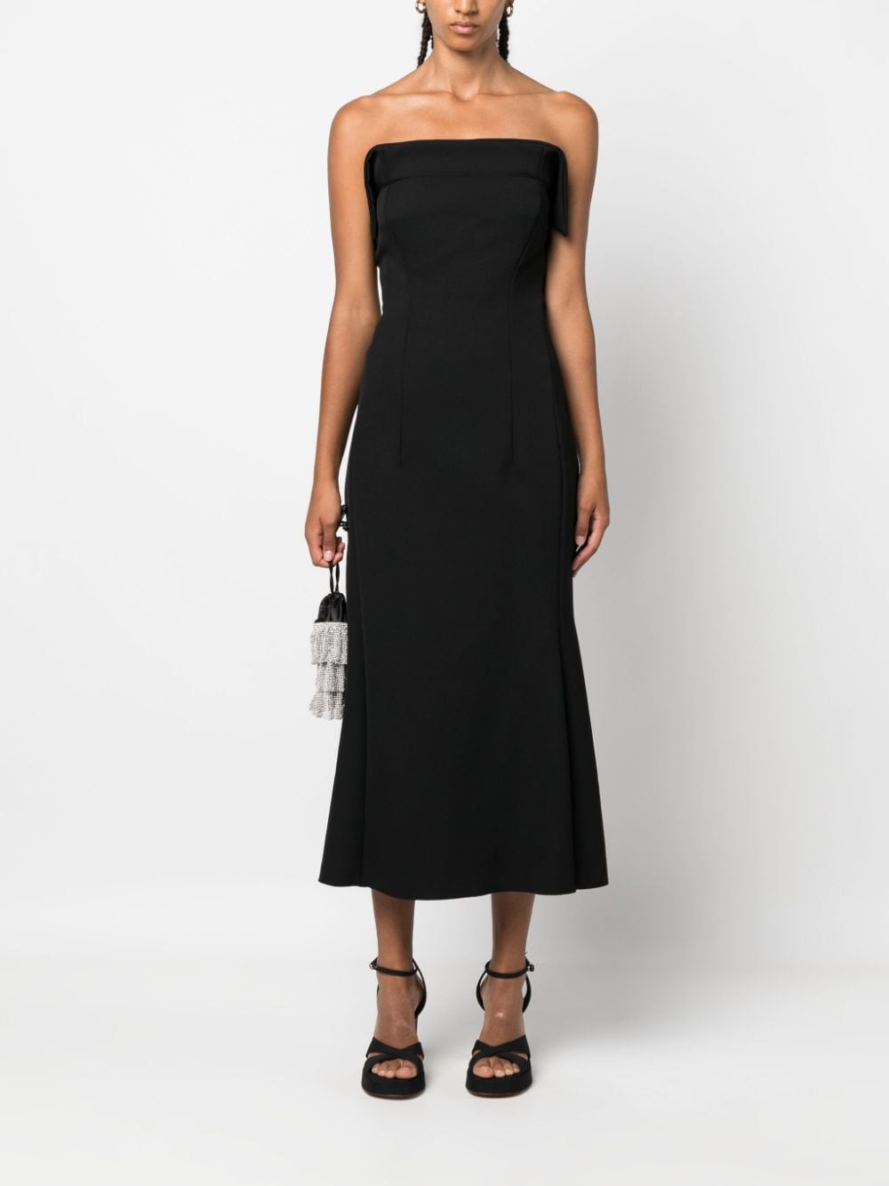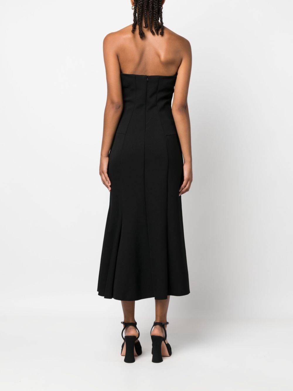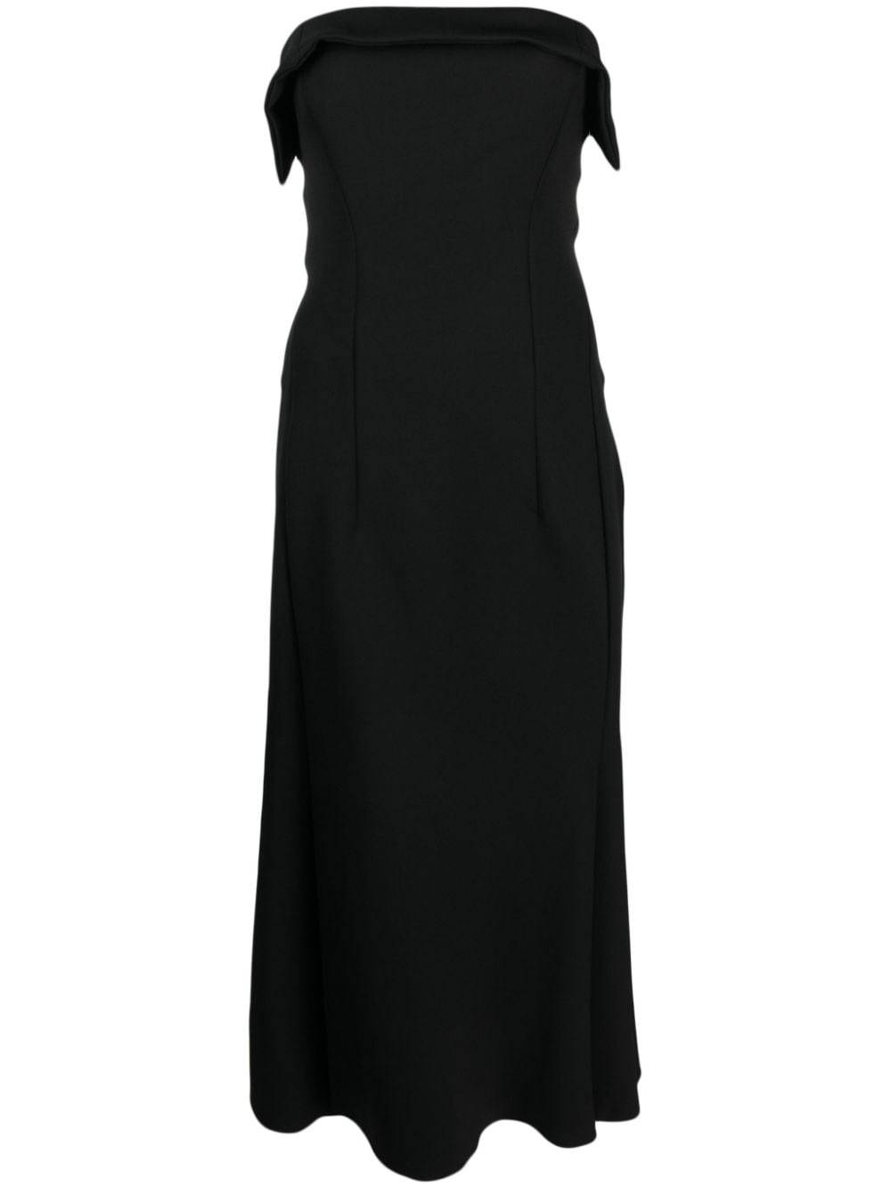 midi dress, strapless, lapel top, flared hem, back zip closure, unlined