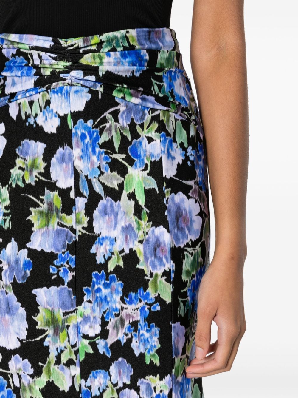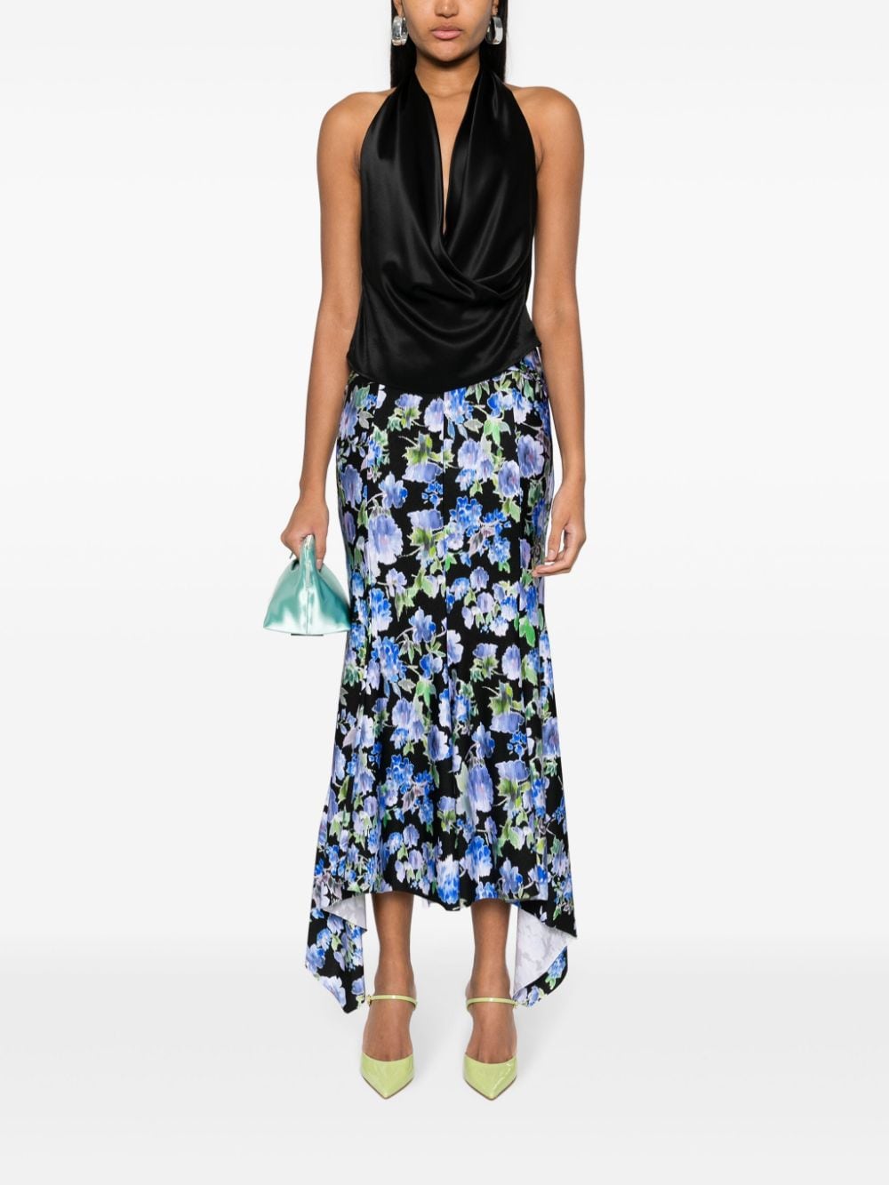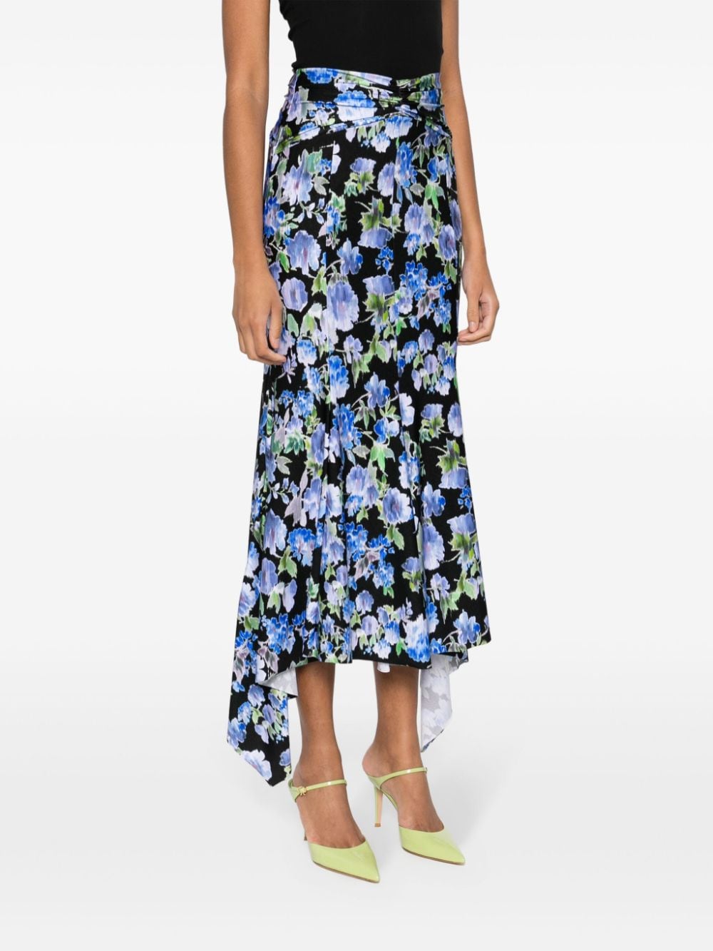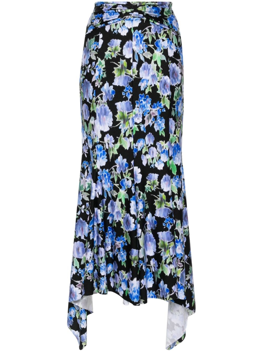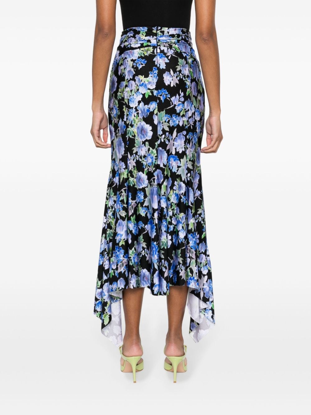 midi skirt, high waist, zip closure, draped waist, asymmetric hem, jersey, floral print