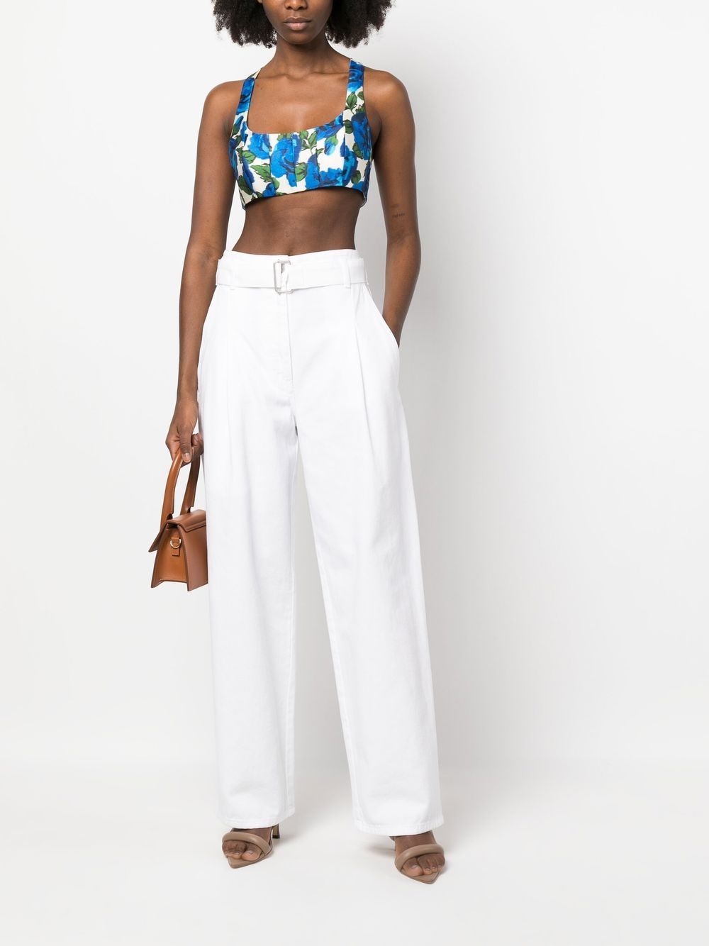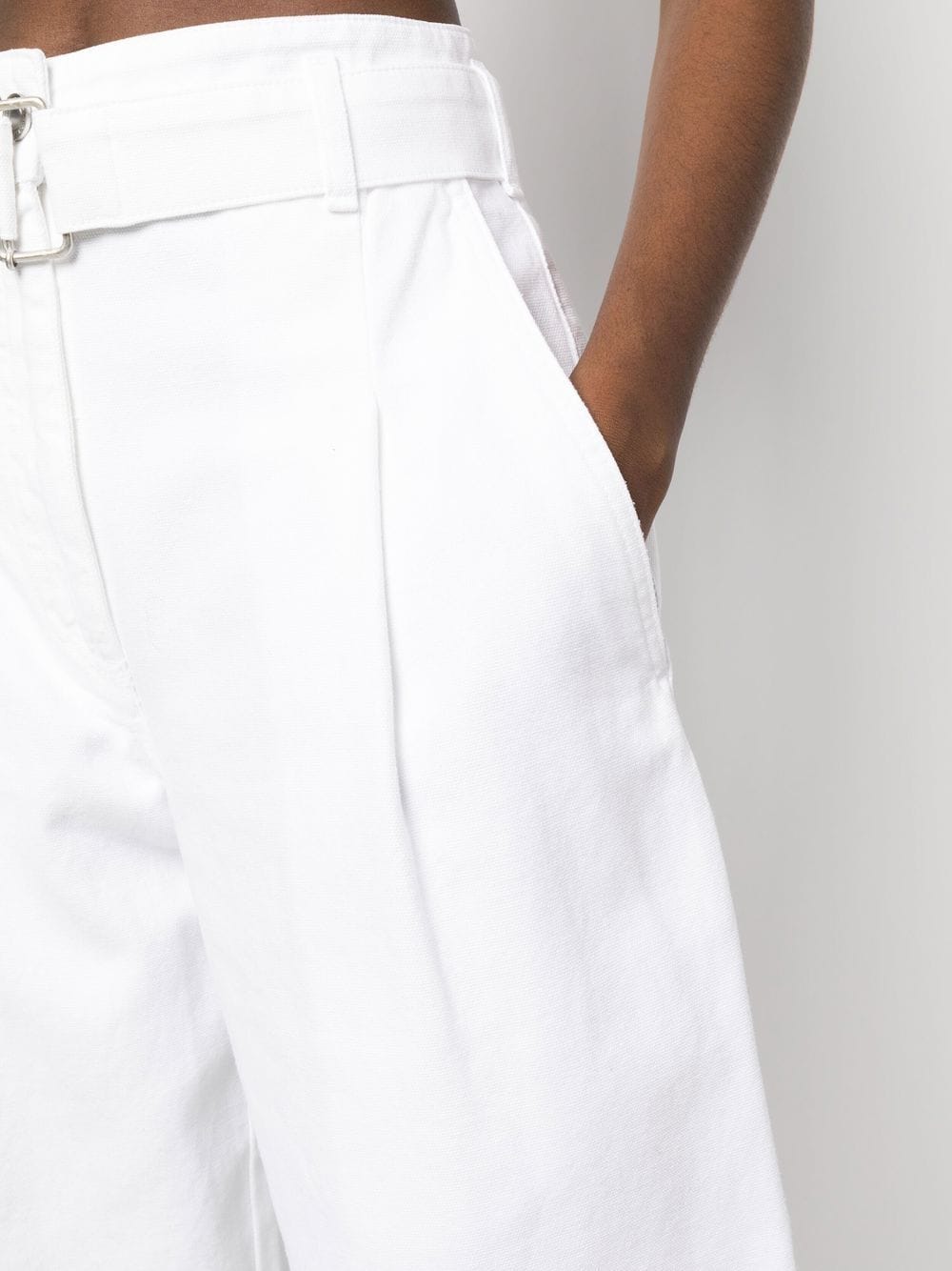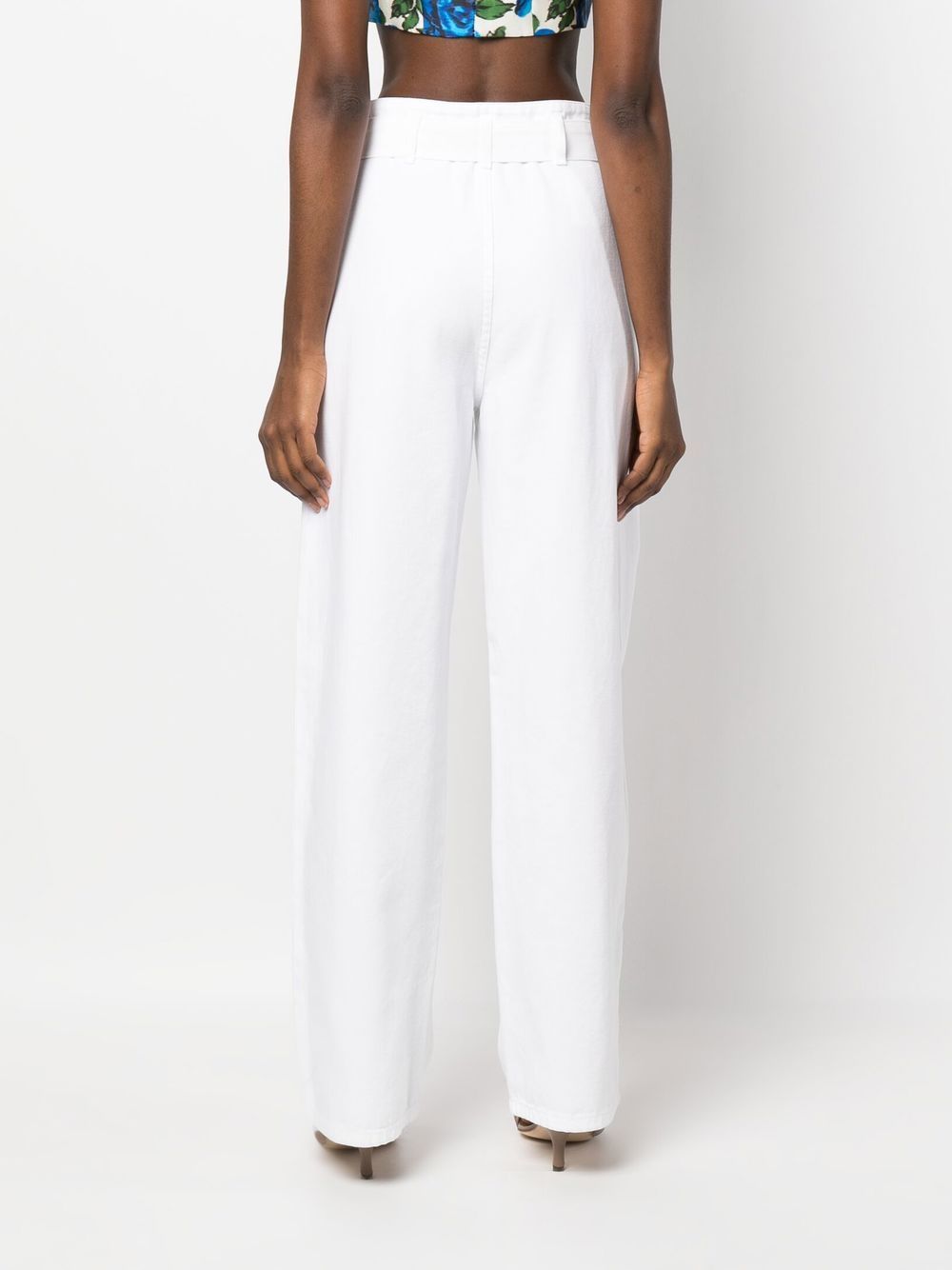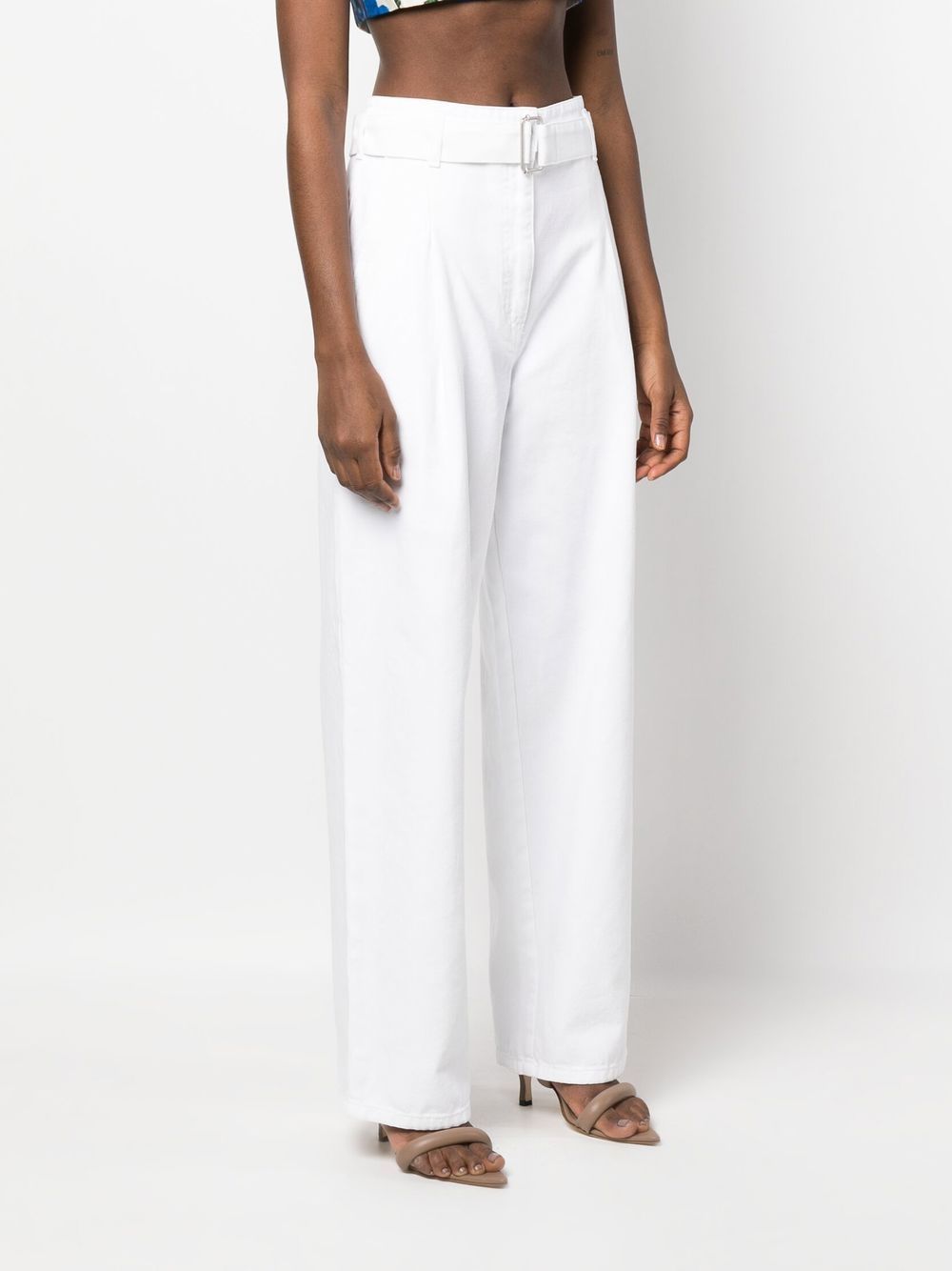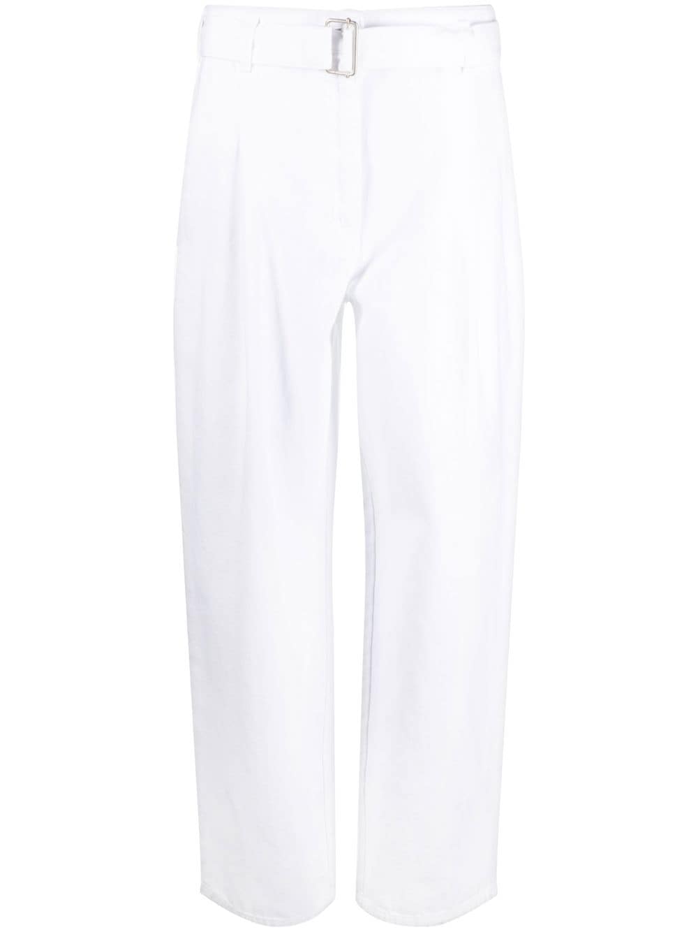 trousers, high waist, belt with fabric logo, belt loops, button and zip, pleats, pockets, wide leg Composition: 100% cotton Washing instructions: wash at 30°