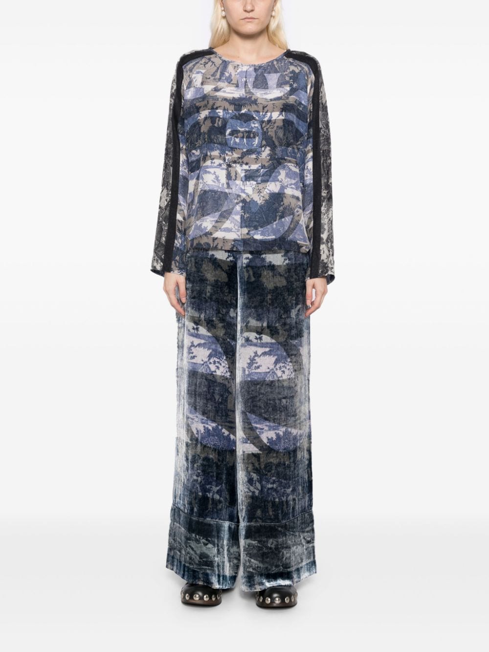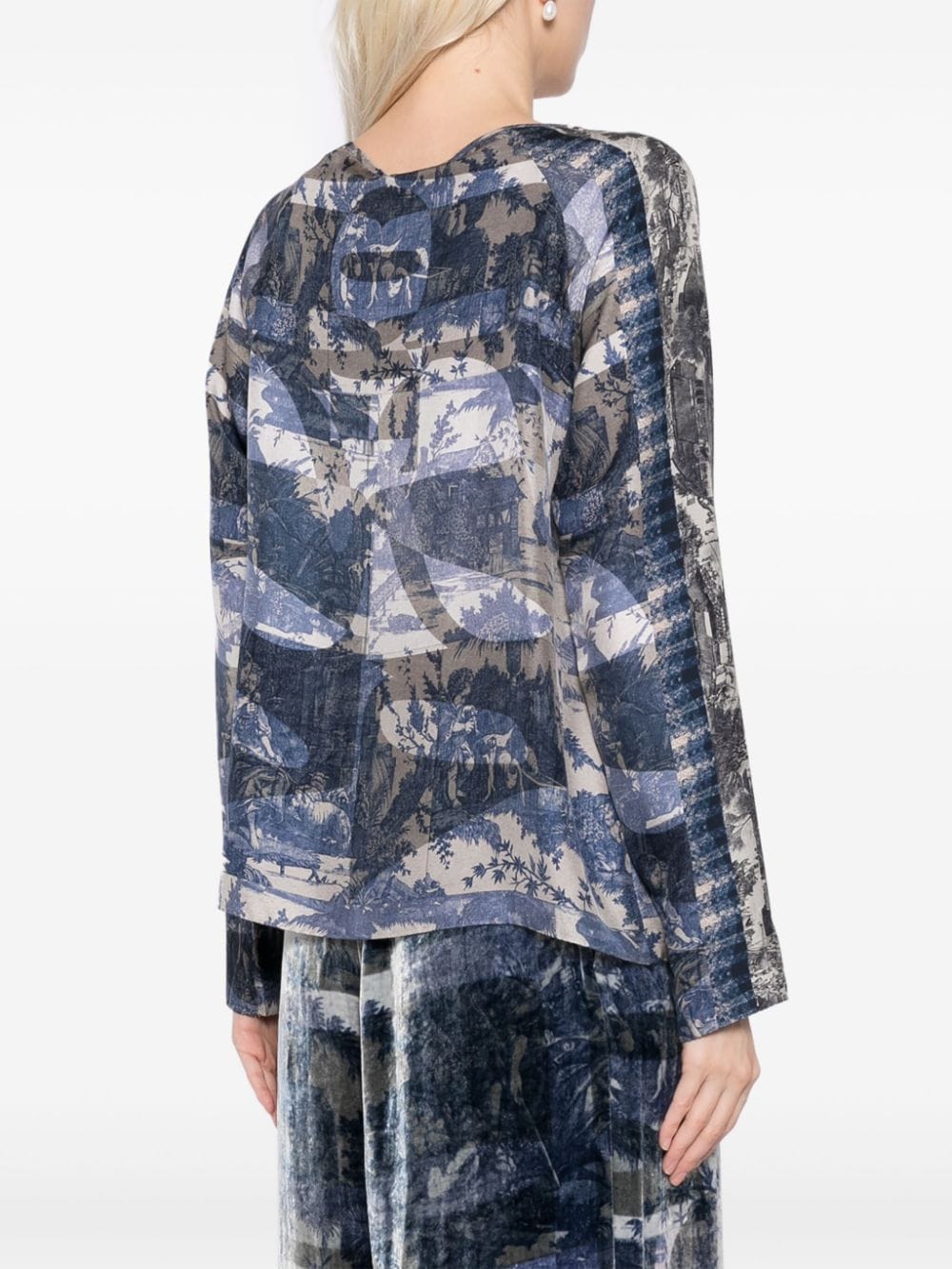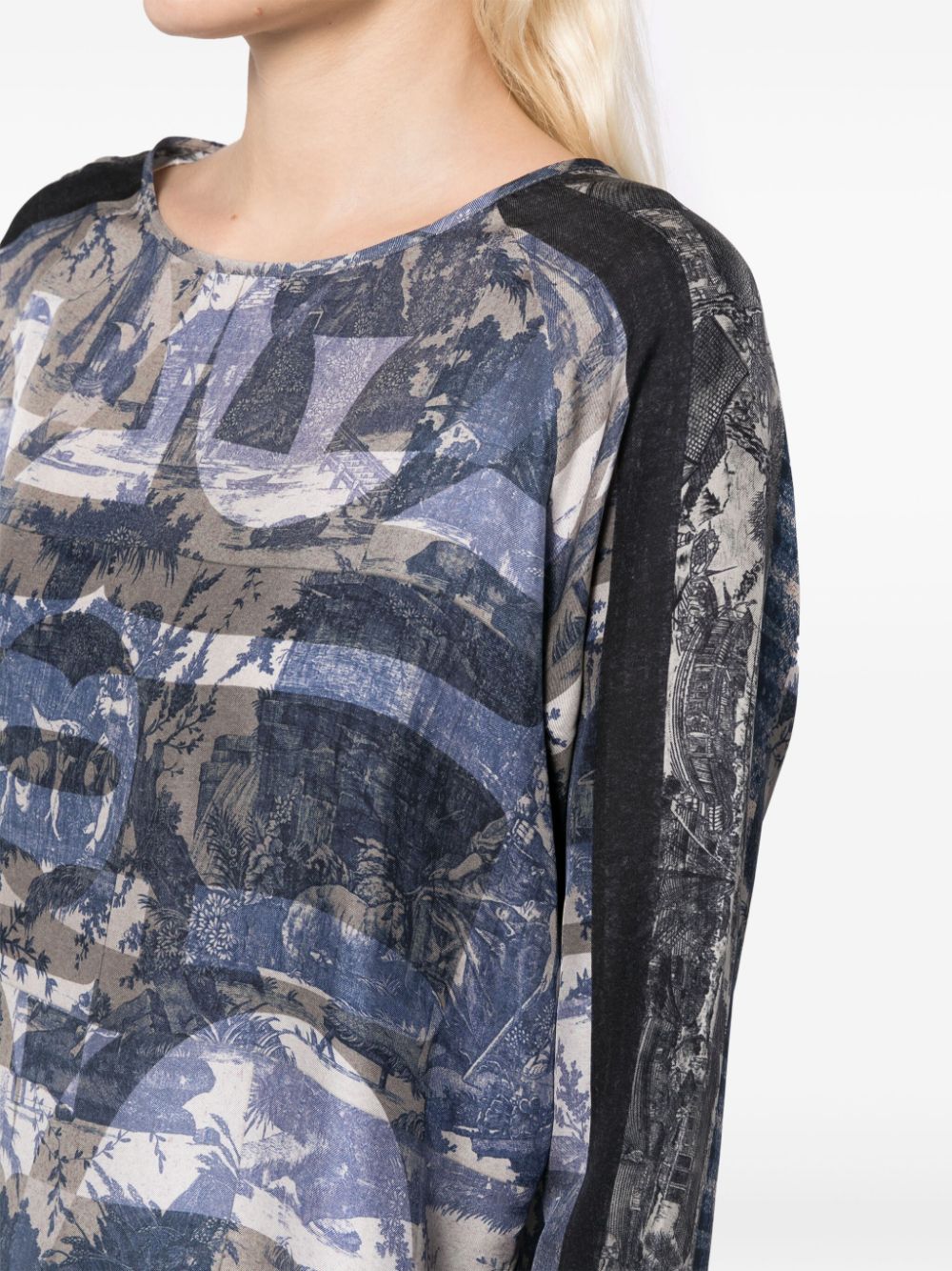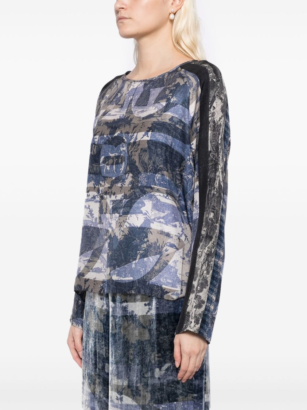 top, wide crew neck, long sleeve, relaxed fit, all-over toile de jouy print