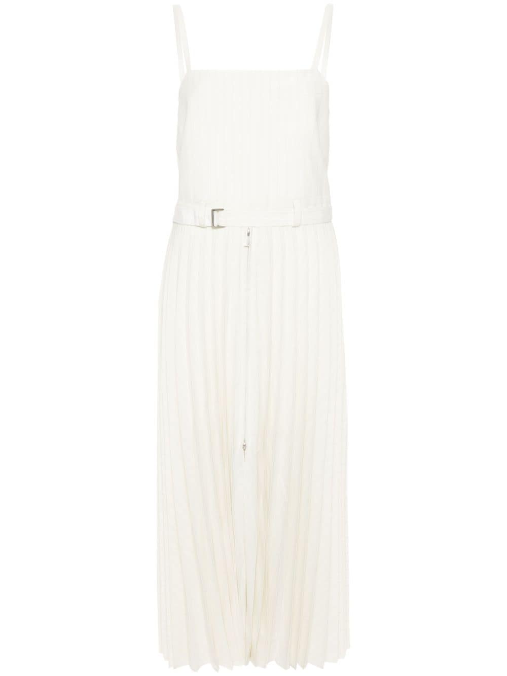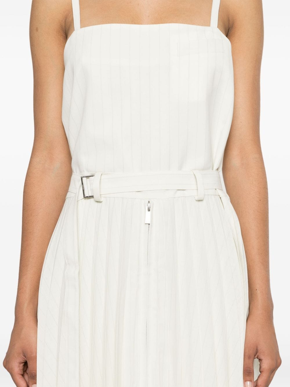 dress, pinstriped fabric, adjustable straps, square neckline, pleated skirt with central zip, removable belt, belt loops, belt with rear buckle