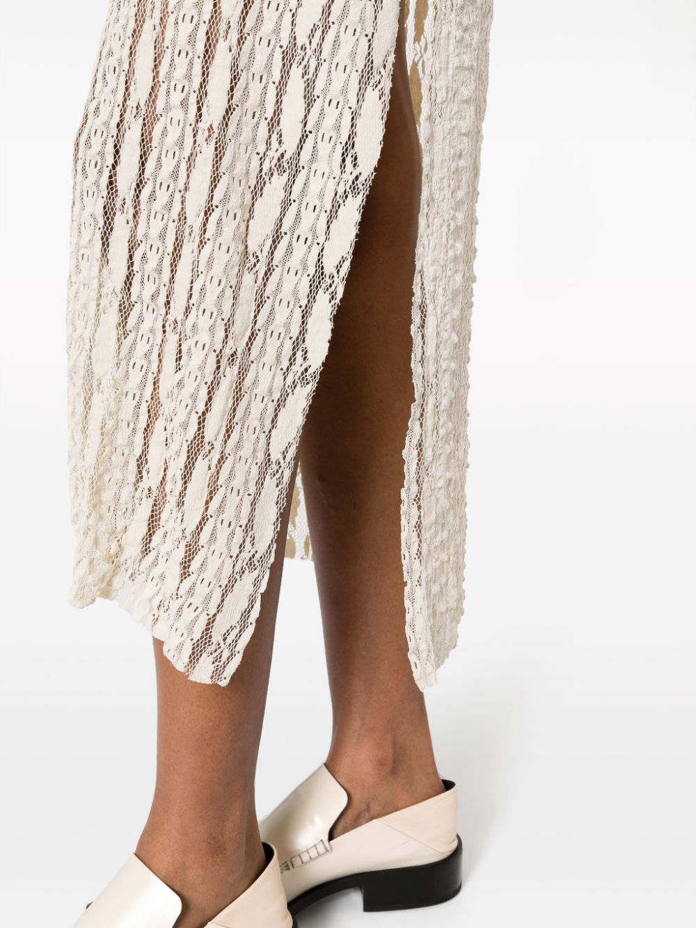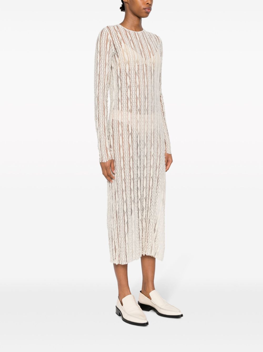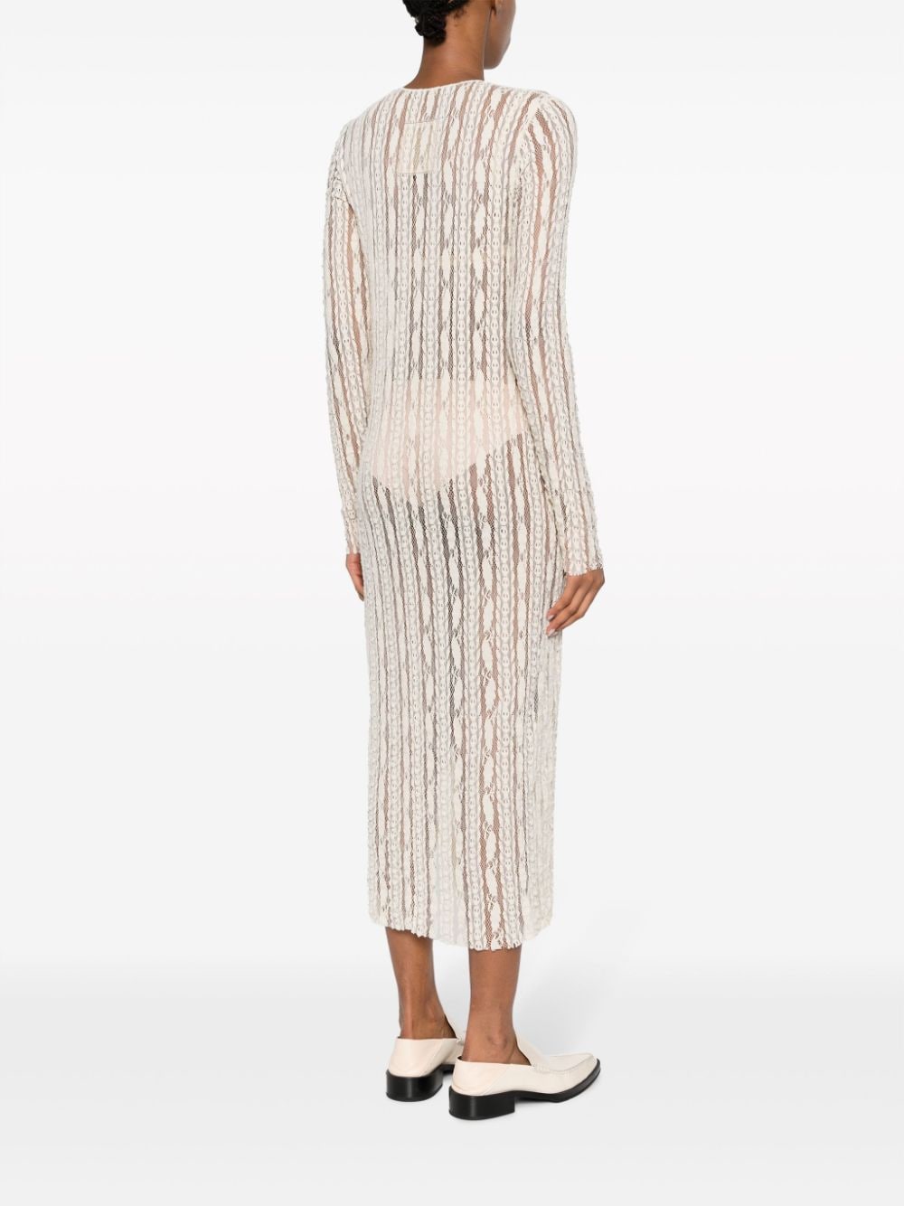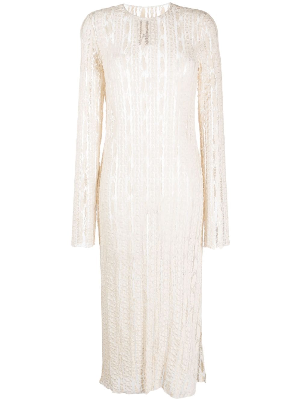 long dress, lace, unlined, crew neck, long sleeves, side slit