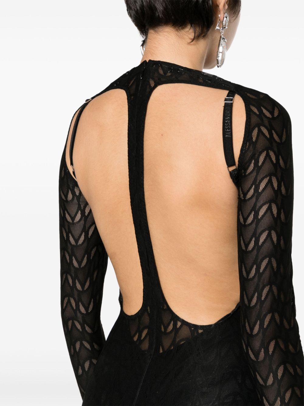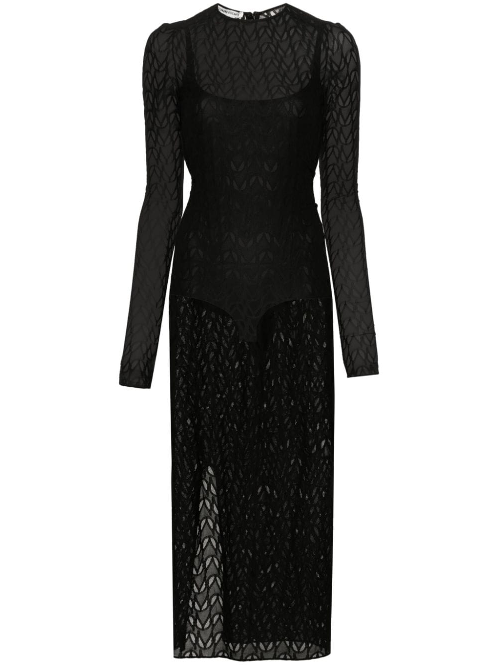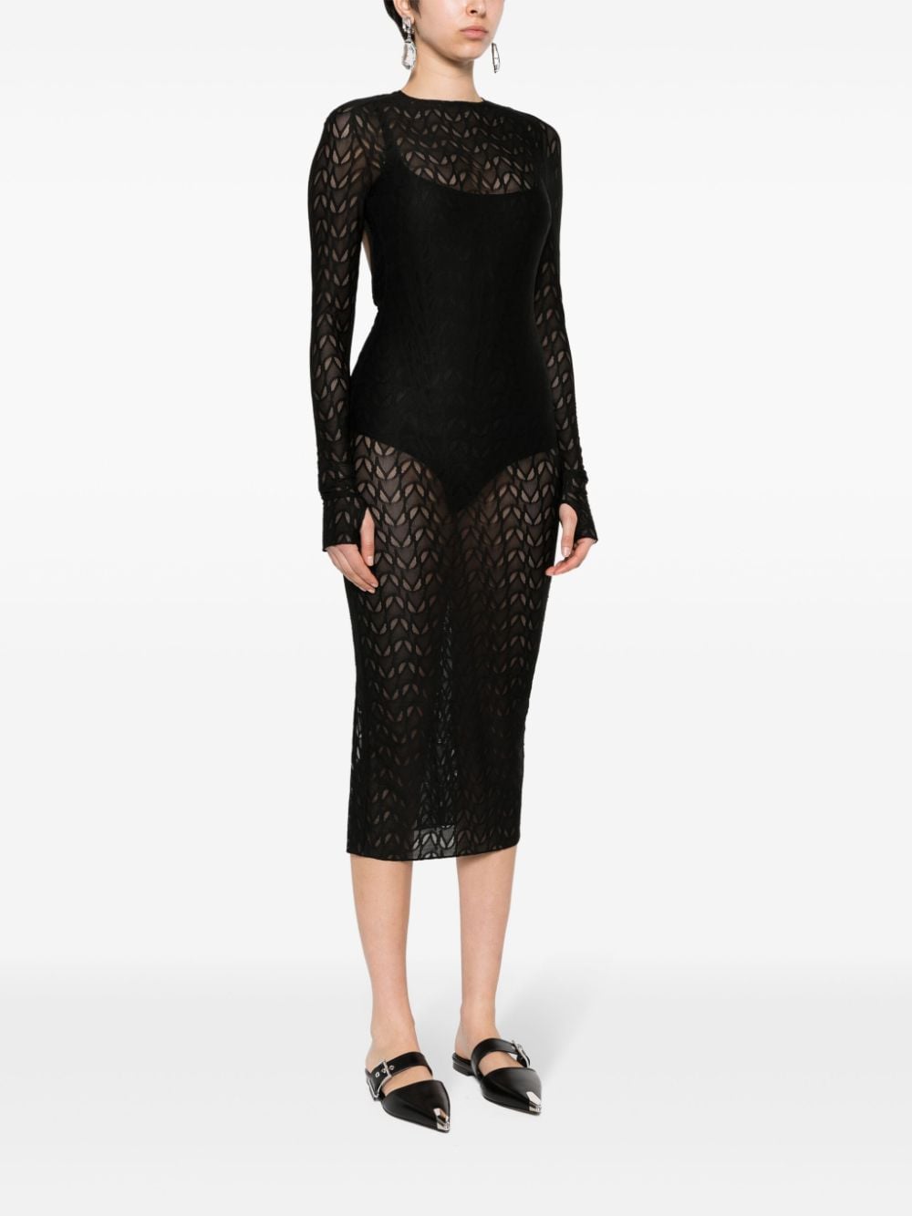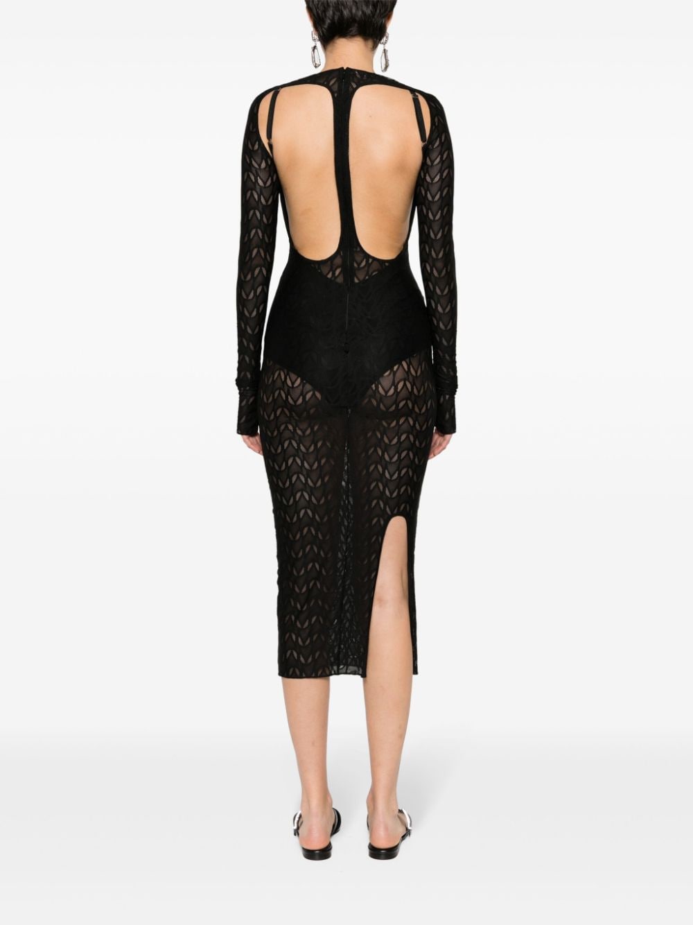 abito midi, girocollo, manica lunga, polsi con foro per guanto, pizzo semi trasparente, schiena nuda con bretelle, chiusura con zip posteriore, spacco posteriore Composizione: 70% poliammide 30% elastane Istruzioni per il lavaggio: lavare in lavatrice