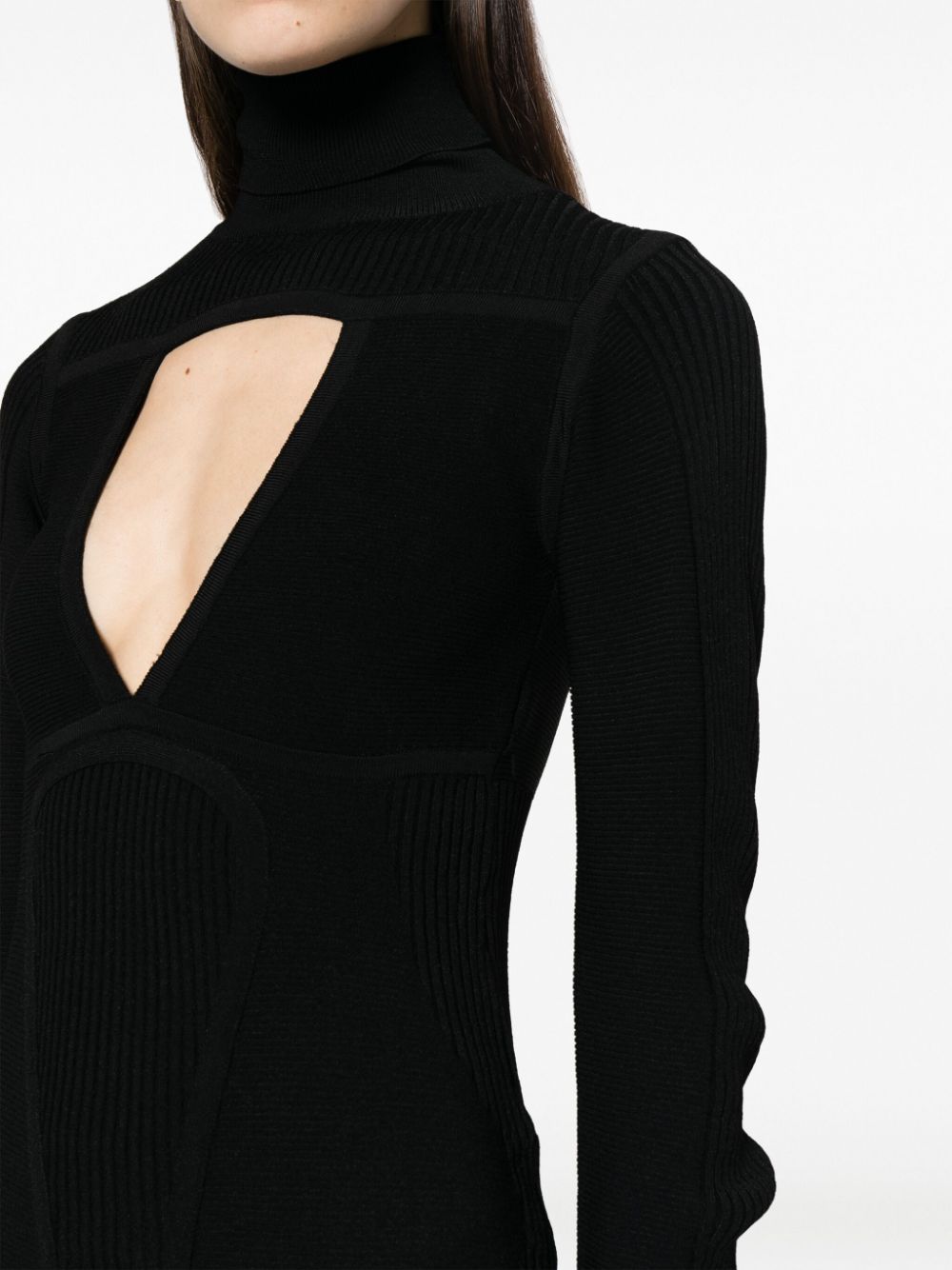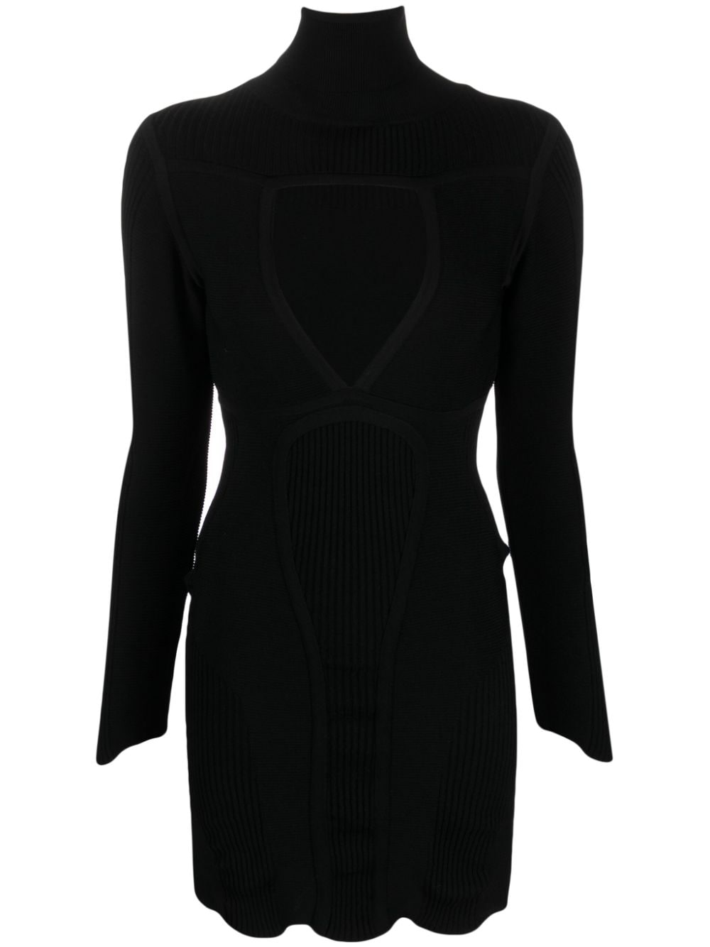 abito, maglia a costine, collo alto , manica lunga , orlo smerlato, dettaglio cut-out centrale Composizione: 67% viscosa 33% poliestere Istruzioni per il lavaggio: lavare a mano