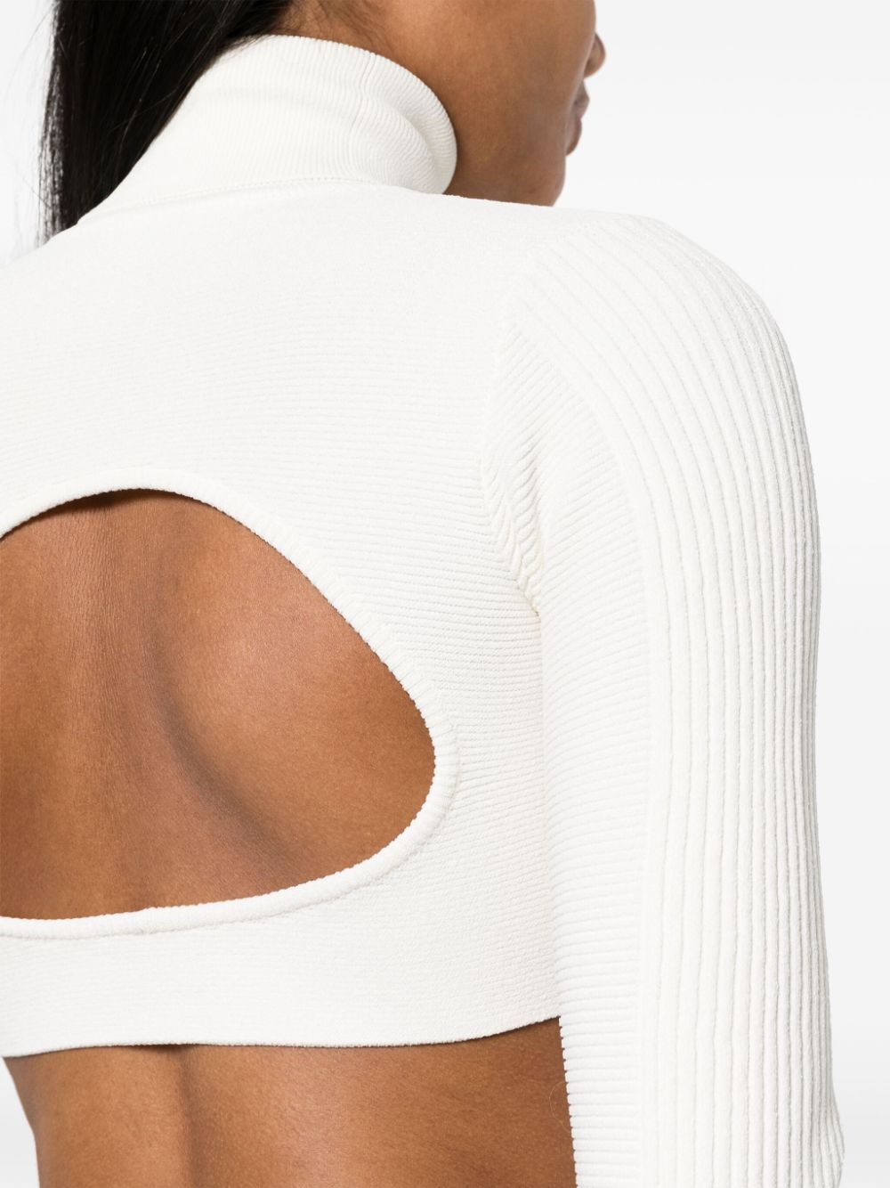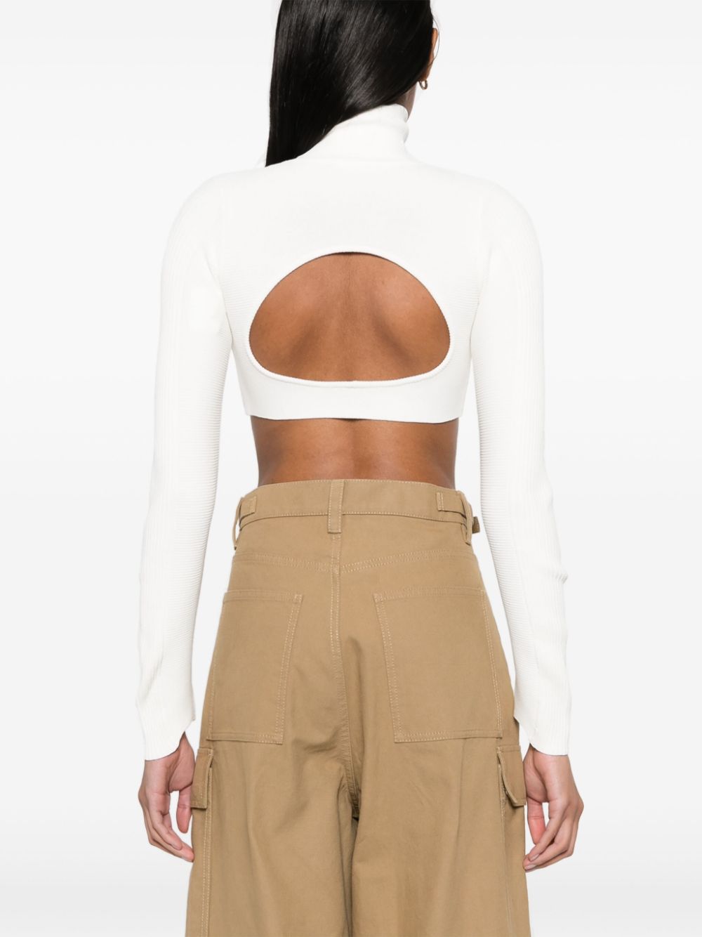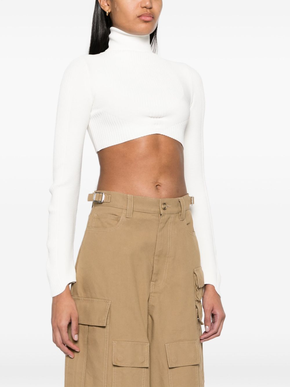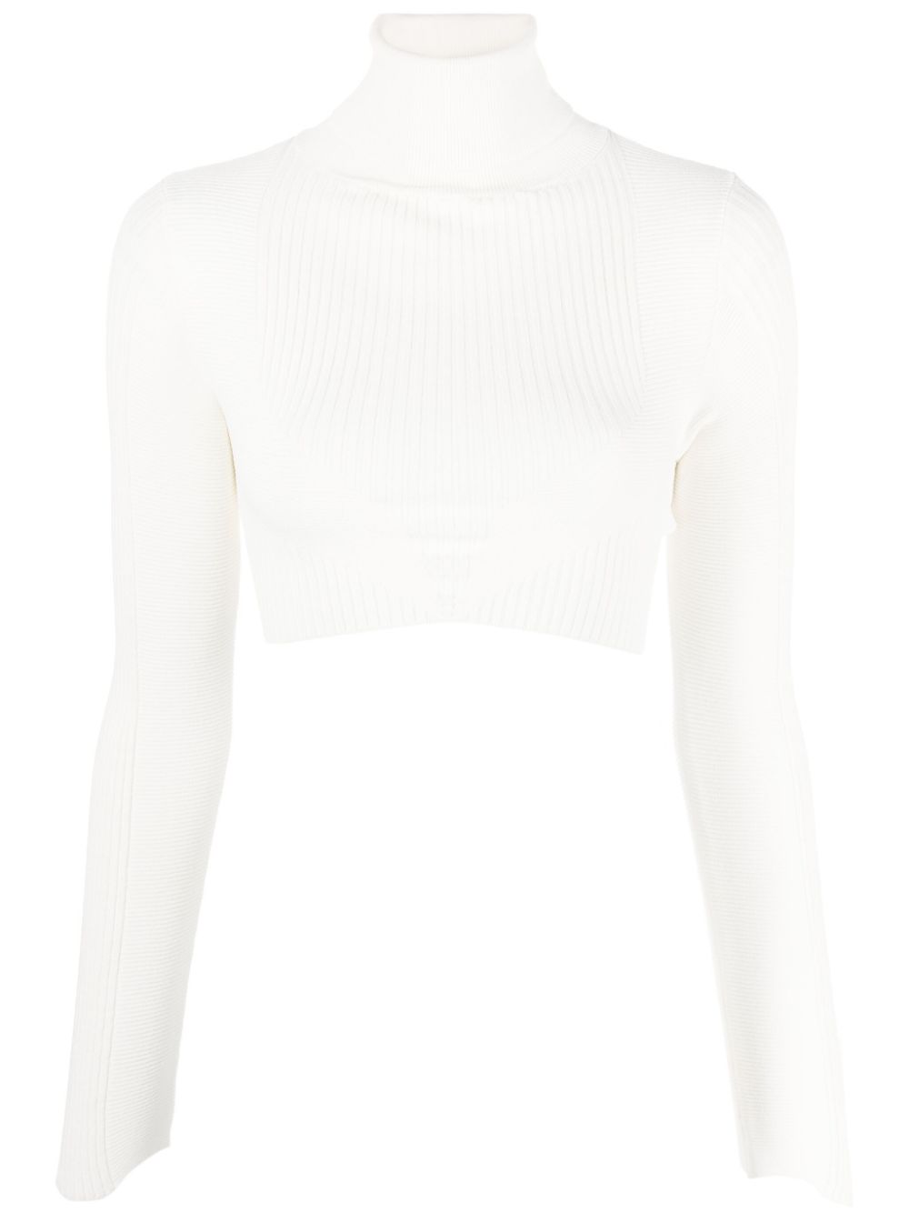 top, crop, maglia a costine, collo alto, manica lunga, scollo ad oblò posteriore Composizione: 87% viscosa 33% poliestere Istruzioni per il lavaggio: lavare a mano