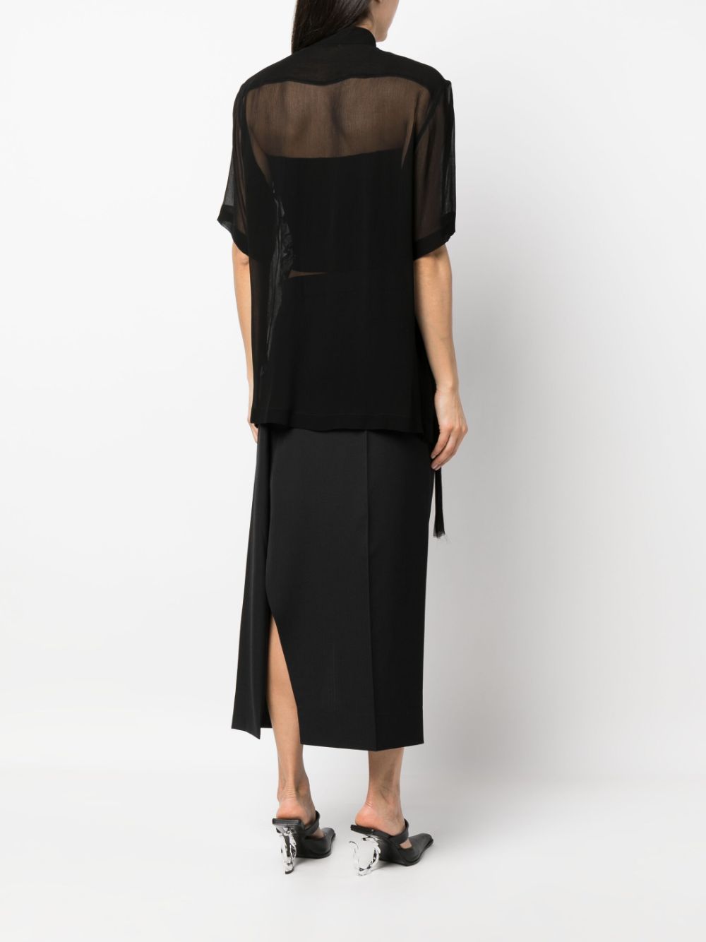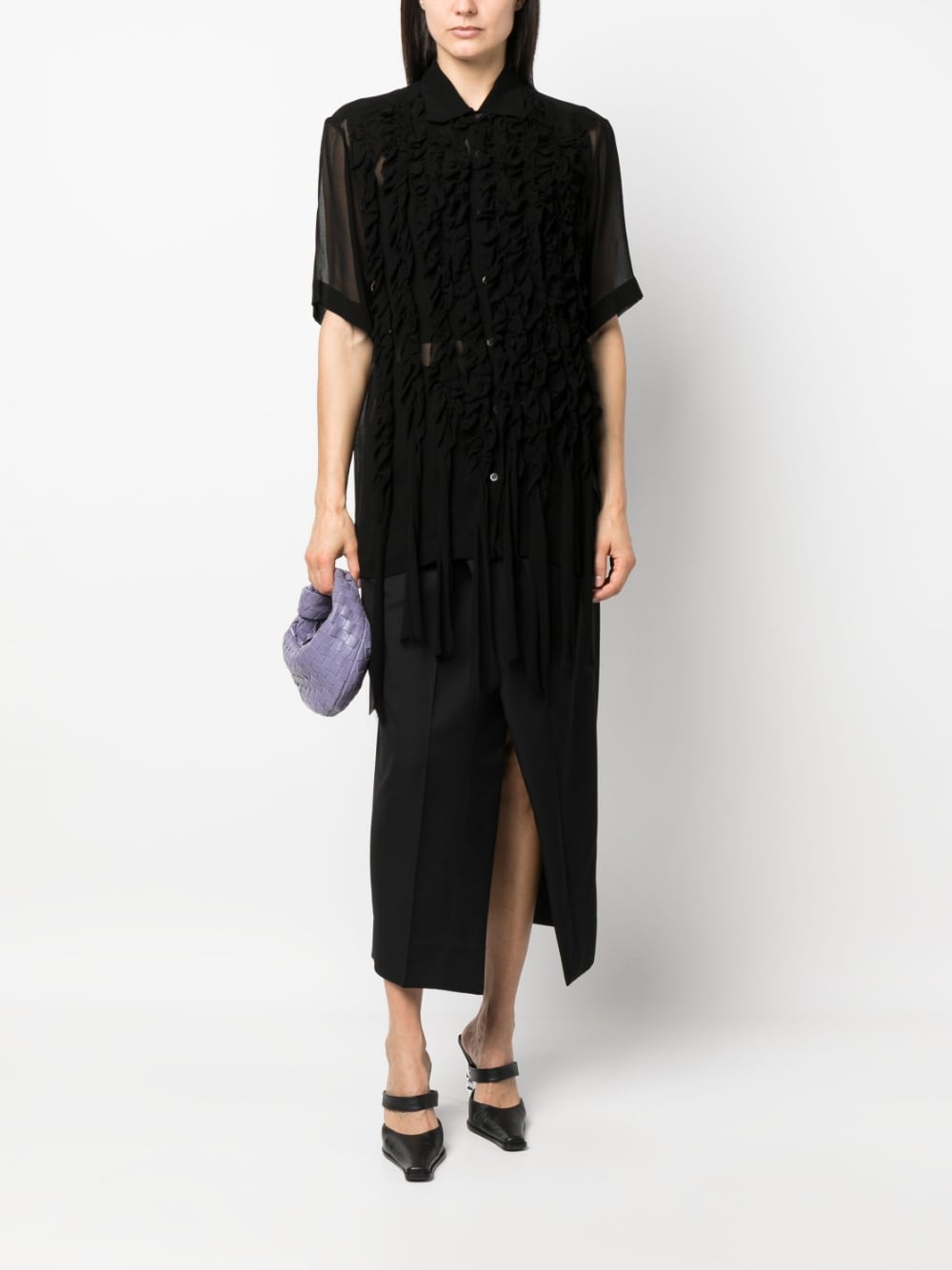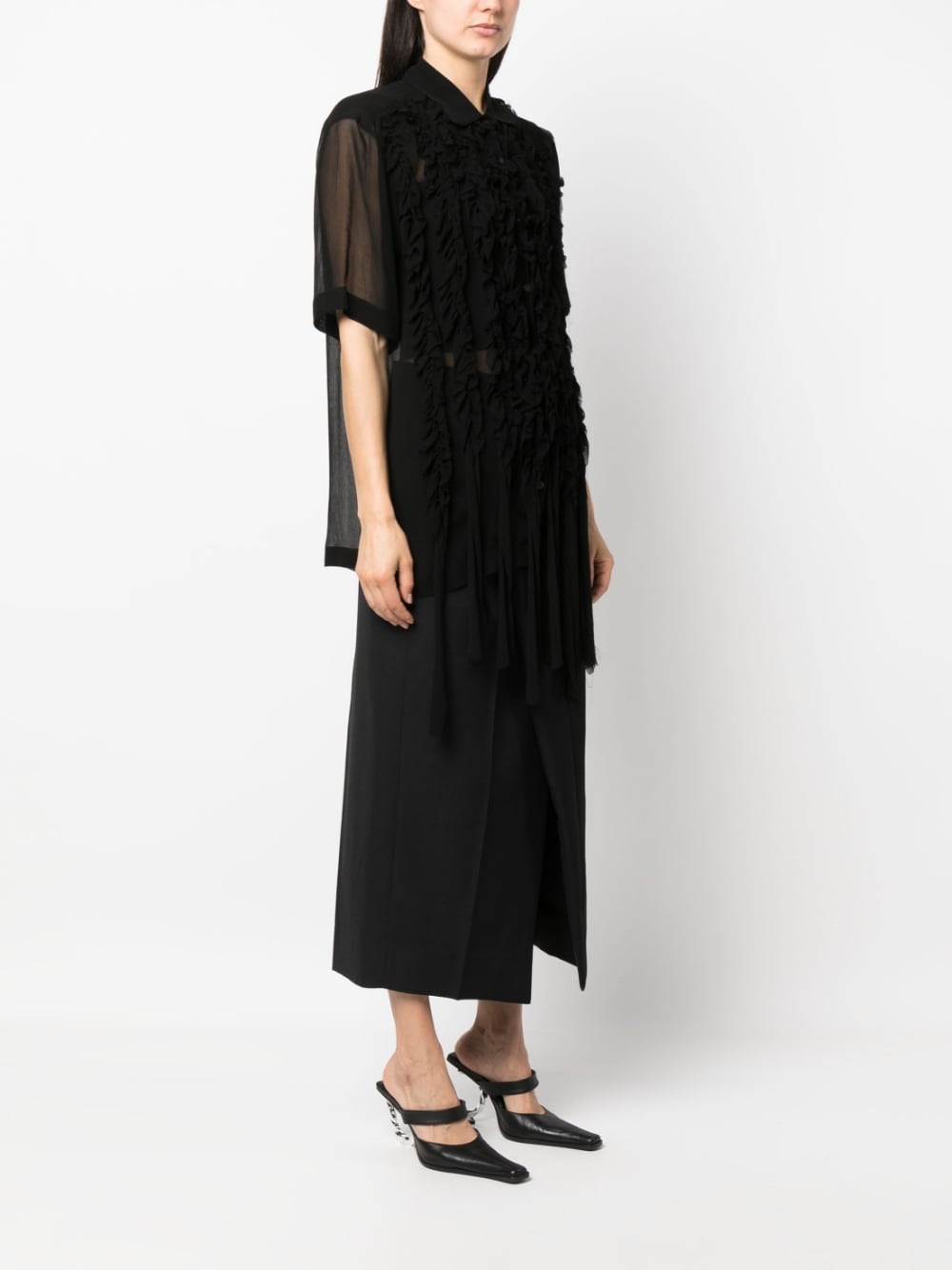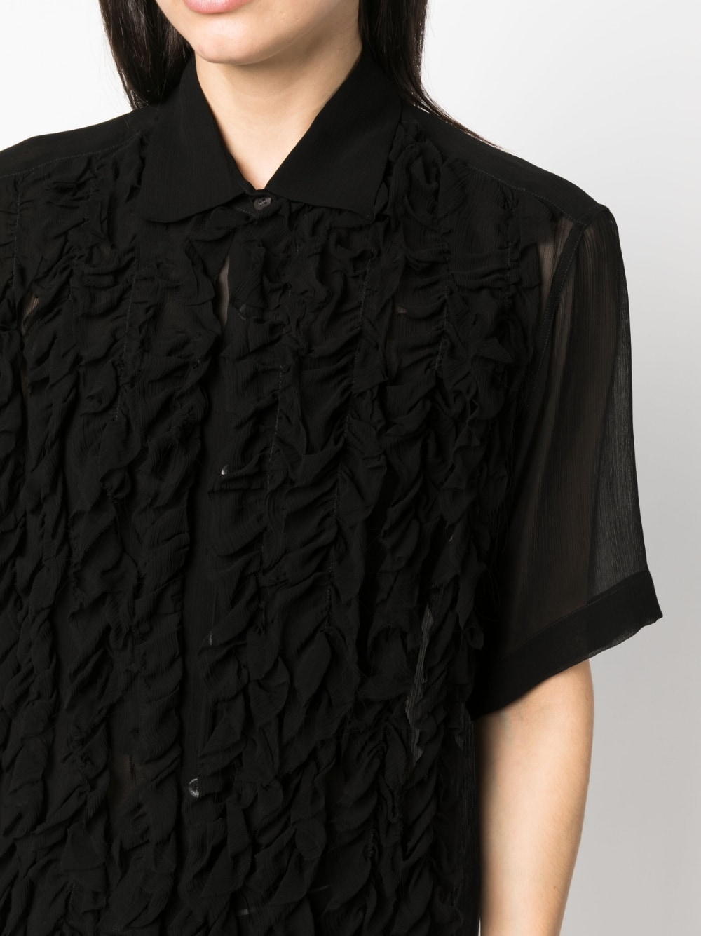 camicia, tessuto trasparente, colletto, bottoni, manica corta, rouches, vestibilità ampia