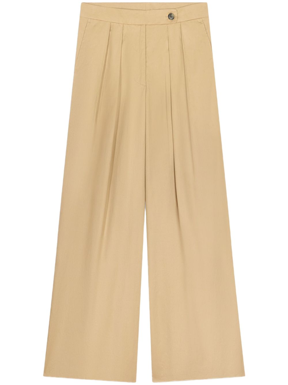 pantalone, pences, chiusura con bottone e zip, tasche laterali, gamba larga