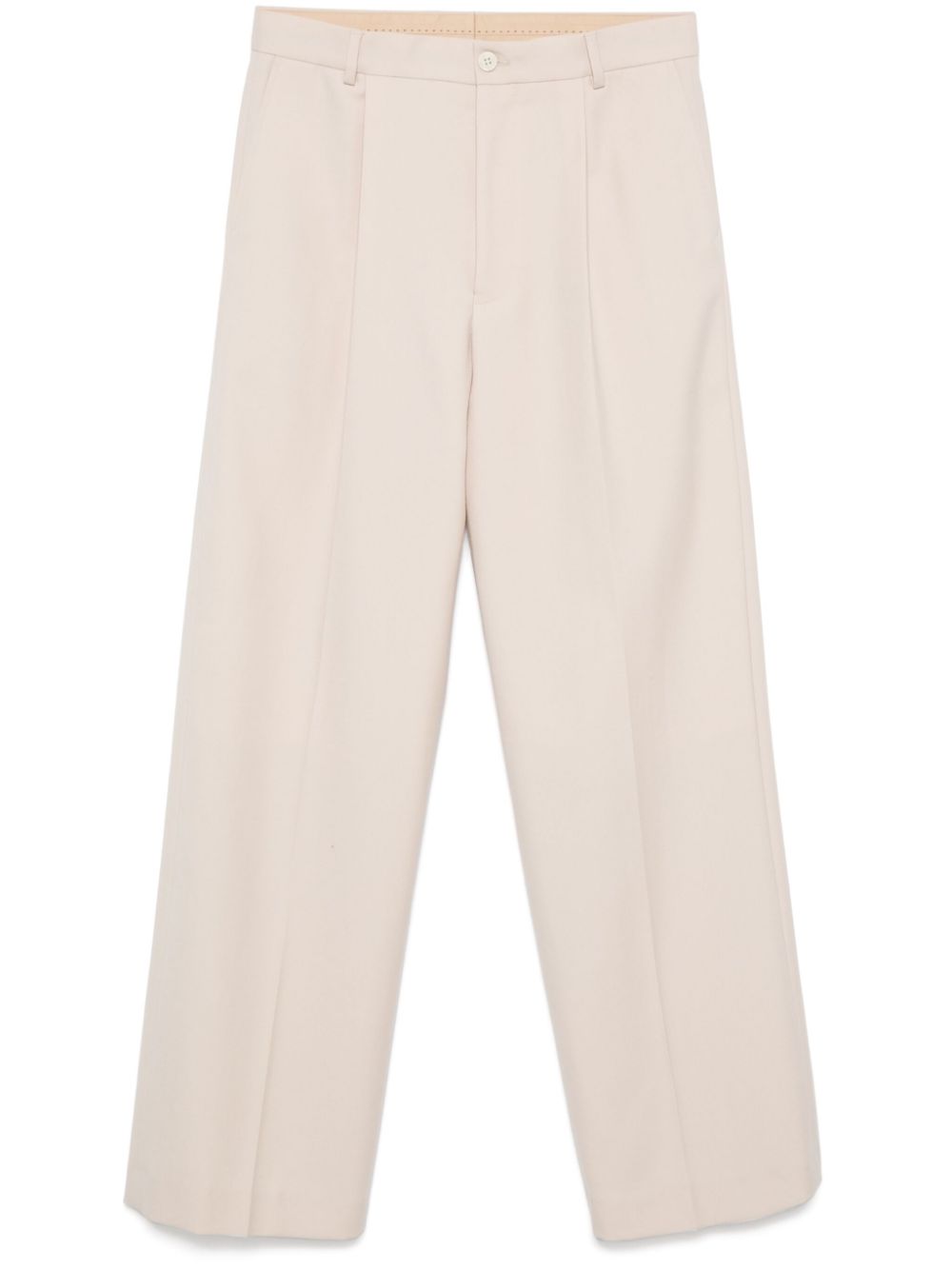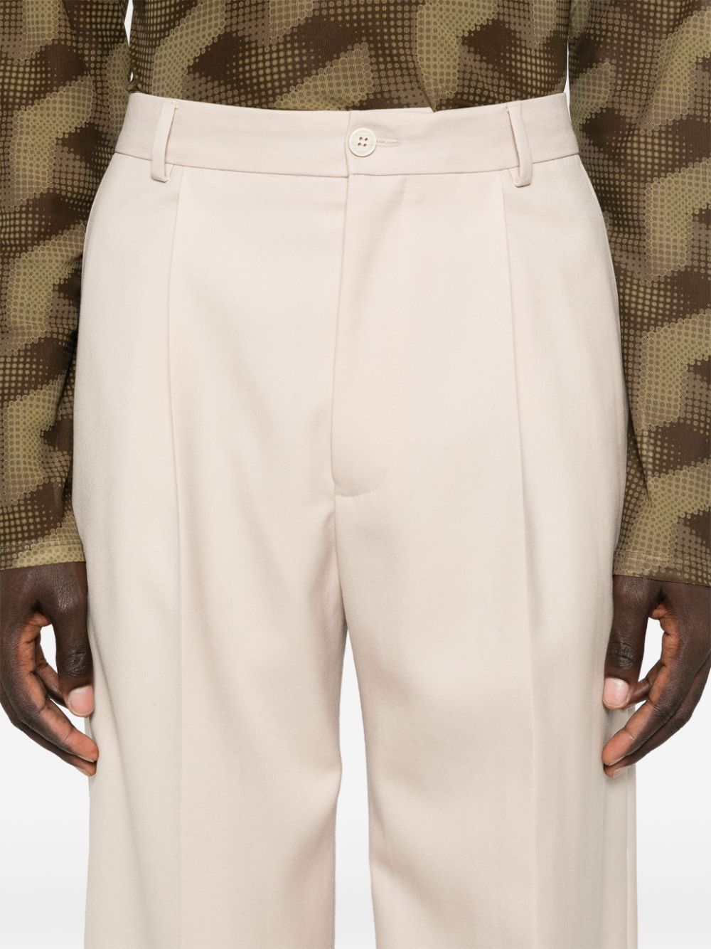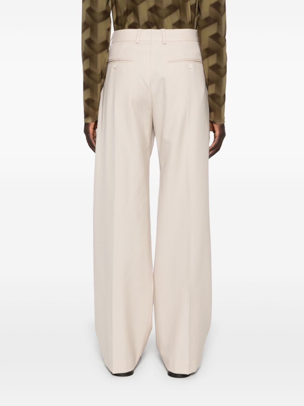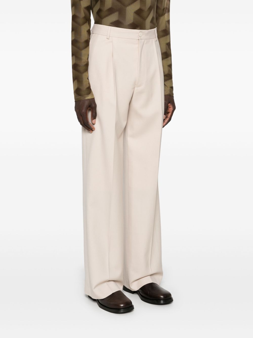 pantalone sartoriale, passanti per cintura, chiusura con bottone e zip, pences, tasche laterali, tasche posteriori con bottone, gamba larga