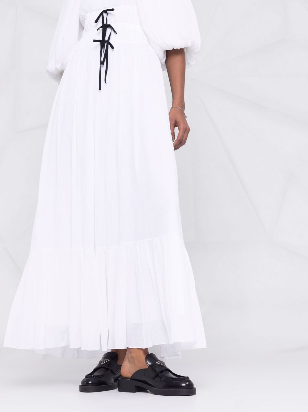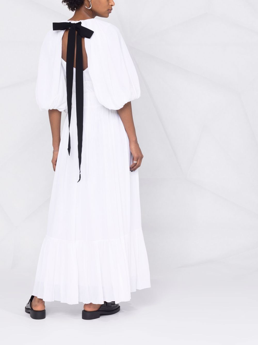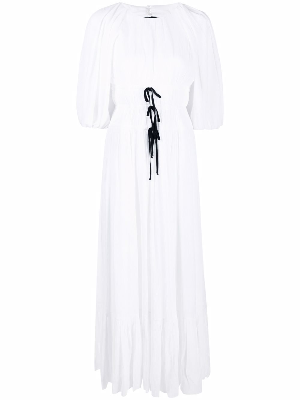 abito lungo arricciato in vita con nastrini in contrasto e fiocco sul retro in gros grain nero, manica corta a sbuffo, foderato Composizione: 60%viscosa 40% seta Istruzioni di lavaggio: lavare a secco