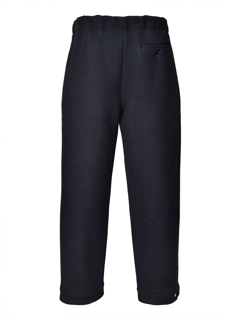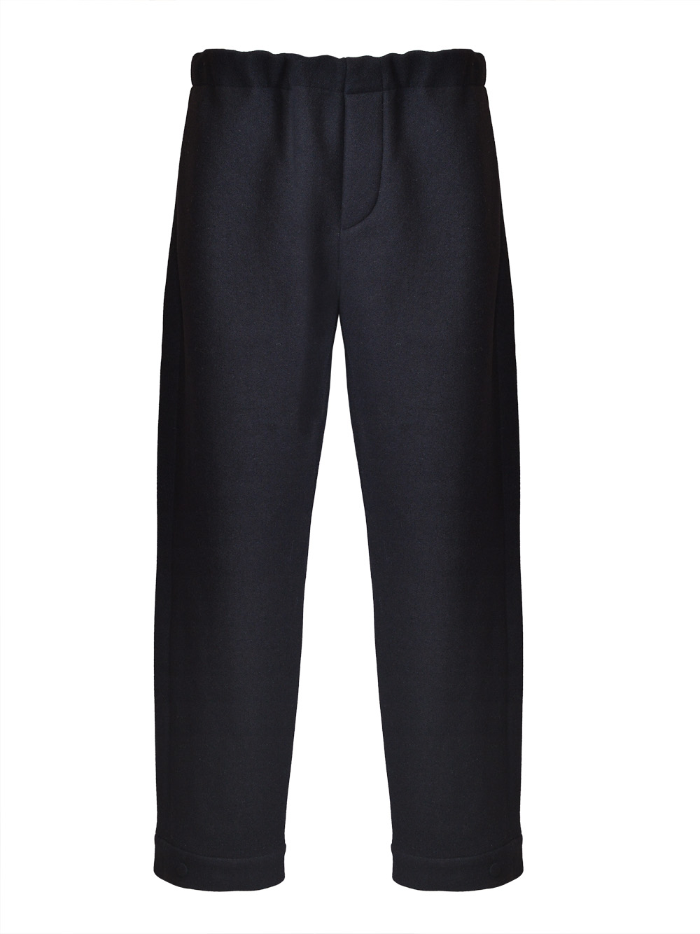 pantalone, tessuto con lavorazione double, vita con coulisse ed elastico, chiusura con bottoni coperti, tasche a filo laterali, tasca posteriore con bottone, gamba larga, fondo con bottone a pressione Composizione: 100% lana vergine Istruzioni per il lavaggio: lavare a secco