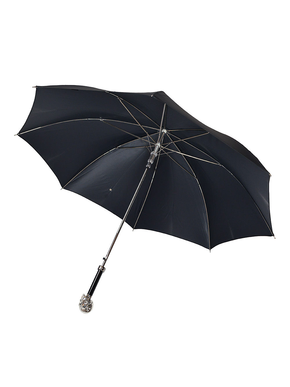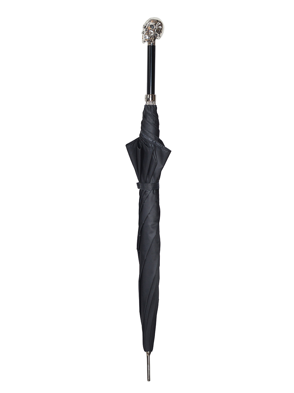 ombrello, manico con teschio in metallo argentato, logo inciso su anello blocco, tela in colore nero , metallo argentato, cinturino con bottone a pressione