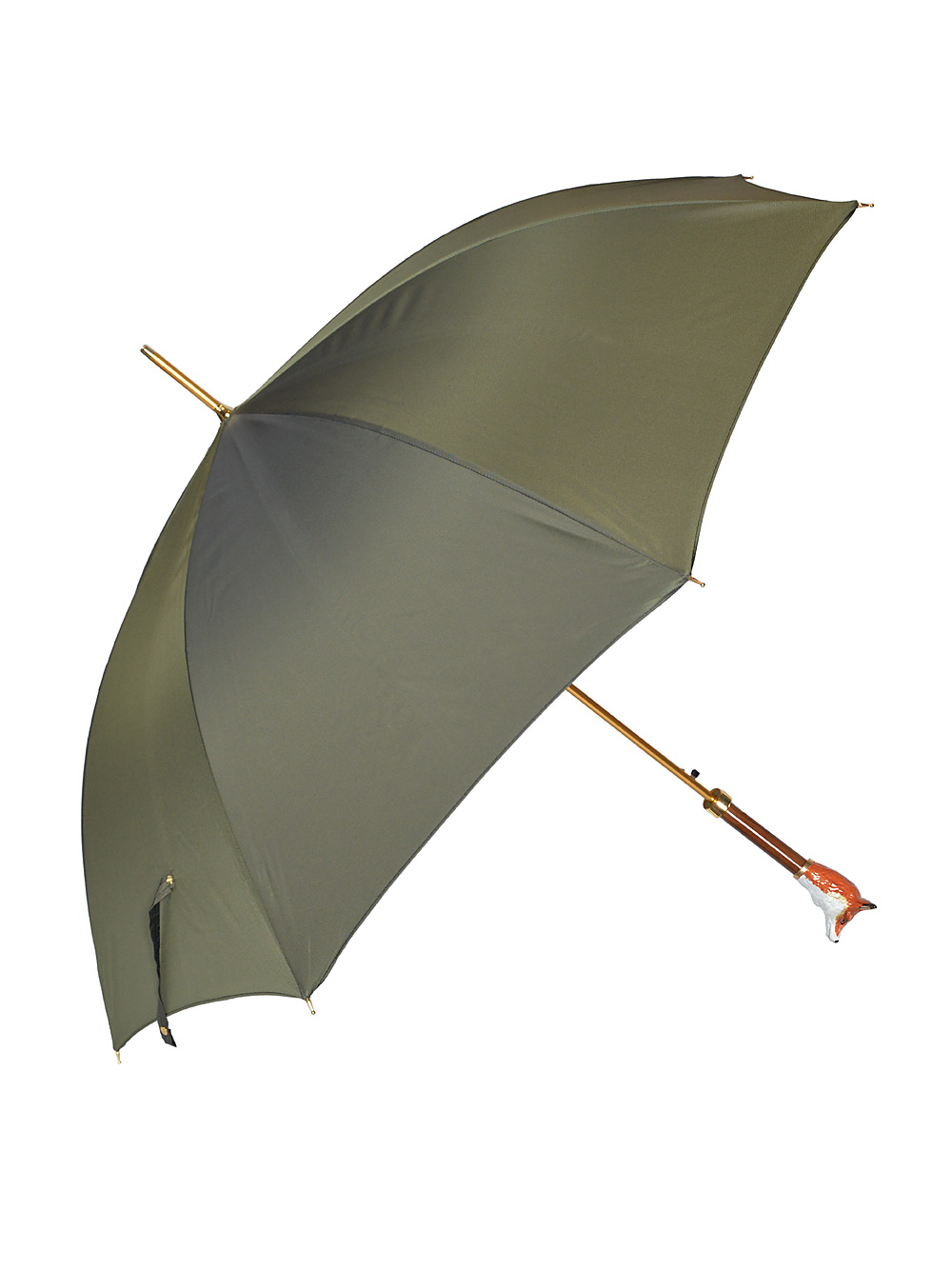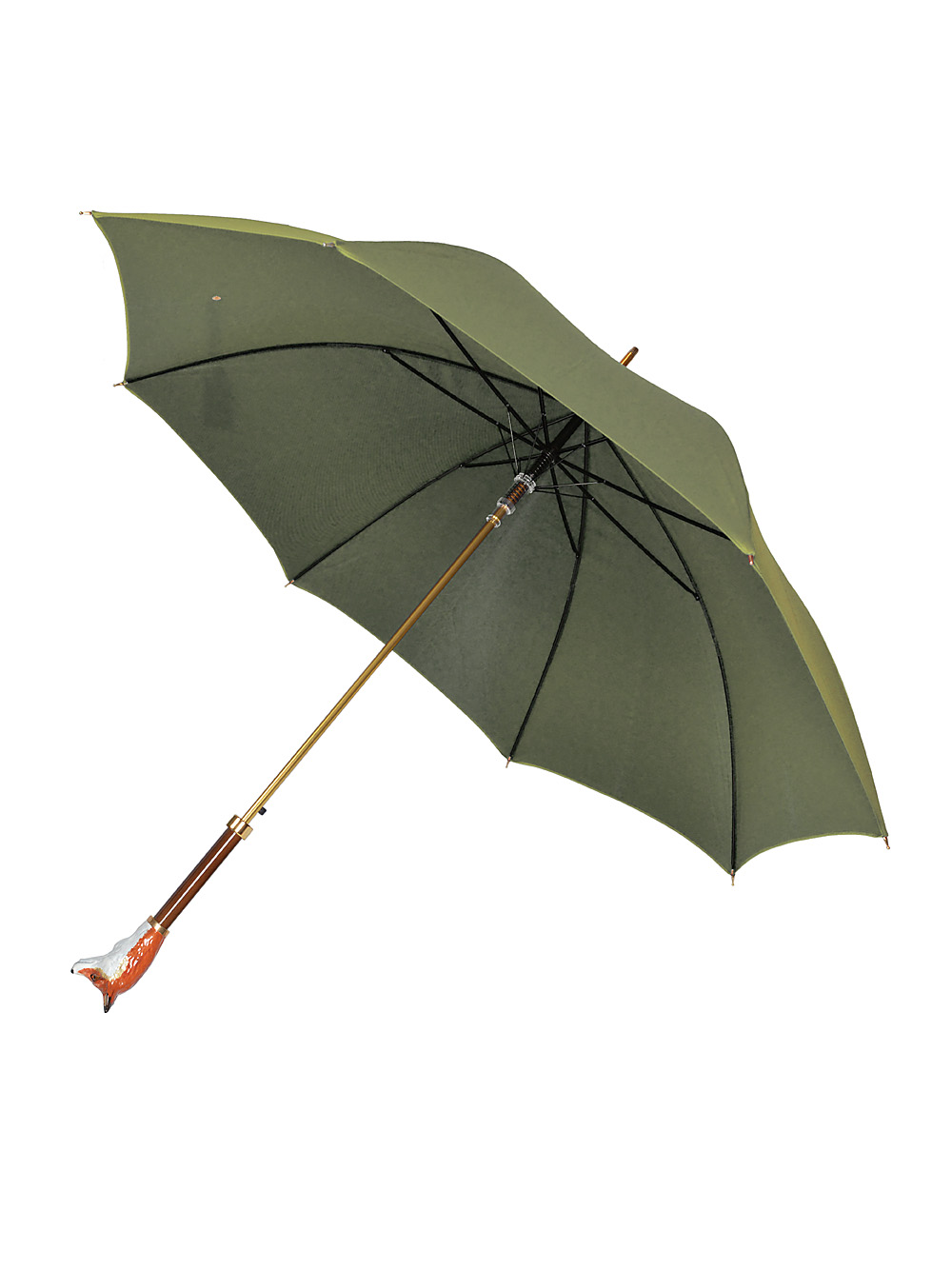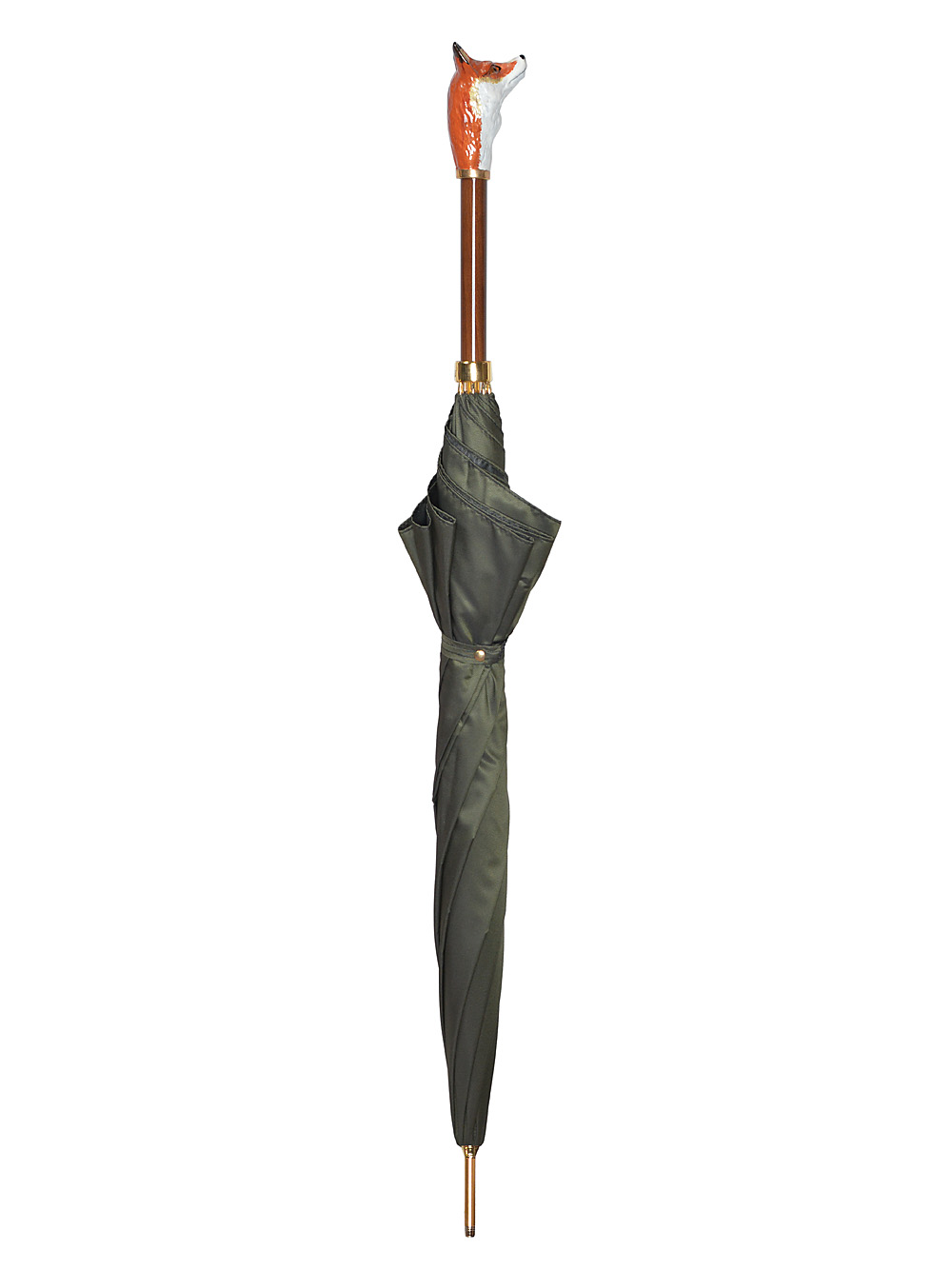 ombrello, manico con testa volpe smaltata a mano, logo inciso su anello blocco, tela in colore verde militare , metallo dorato, cinturino con bottone a pressione