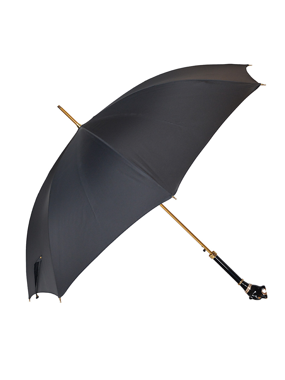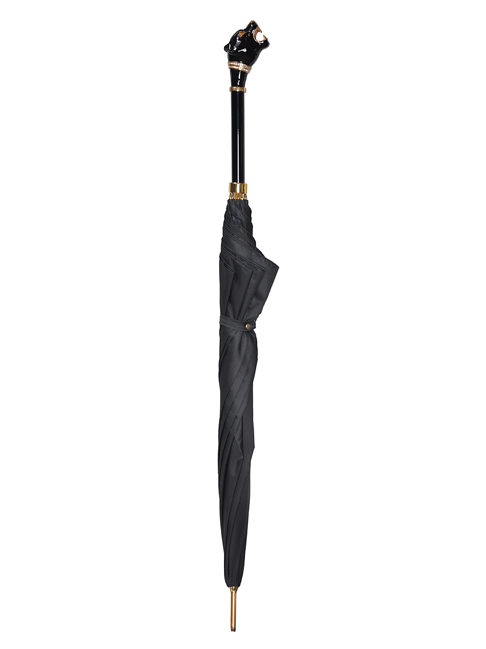 ombrello, manico con testa di pantera smaltata a mano con collarino in cristalli, logo inciso su anello blocco, tela in colore nero , metallo dorato, cinturino con bottone a pressione